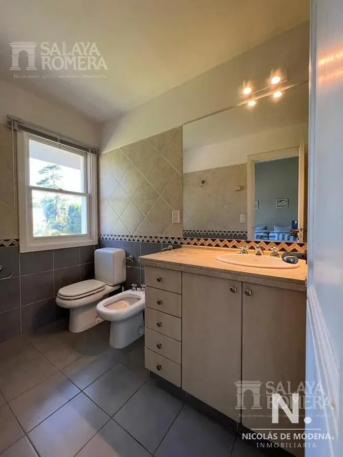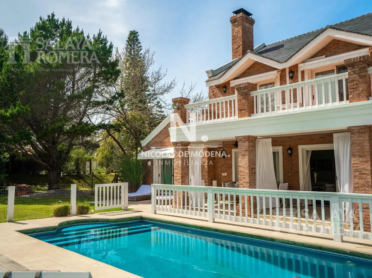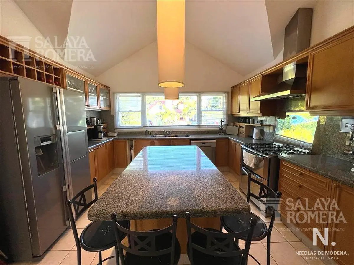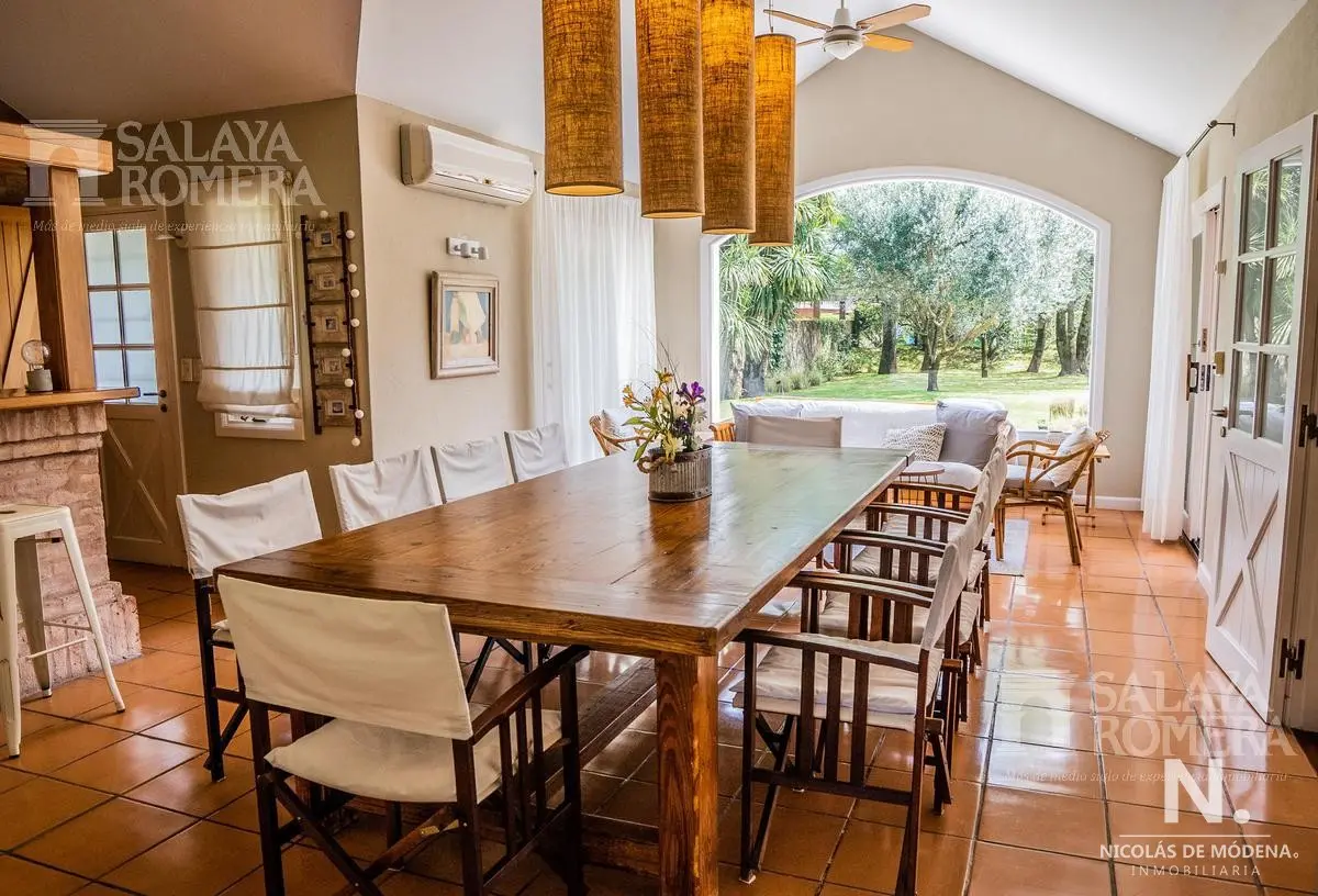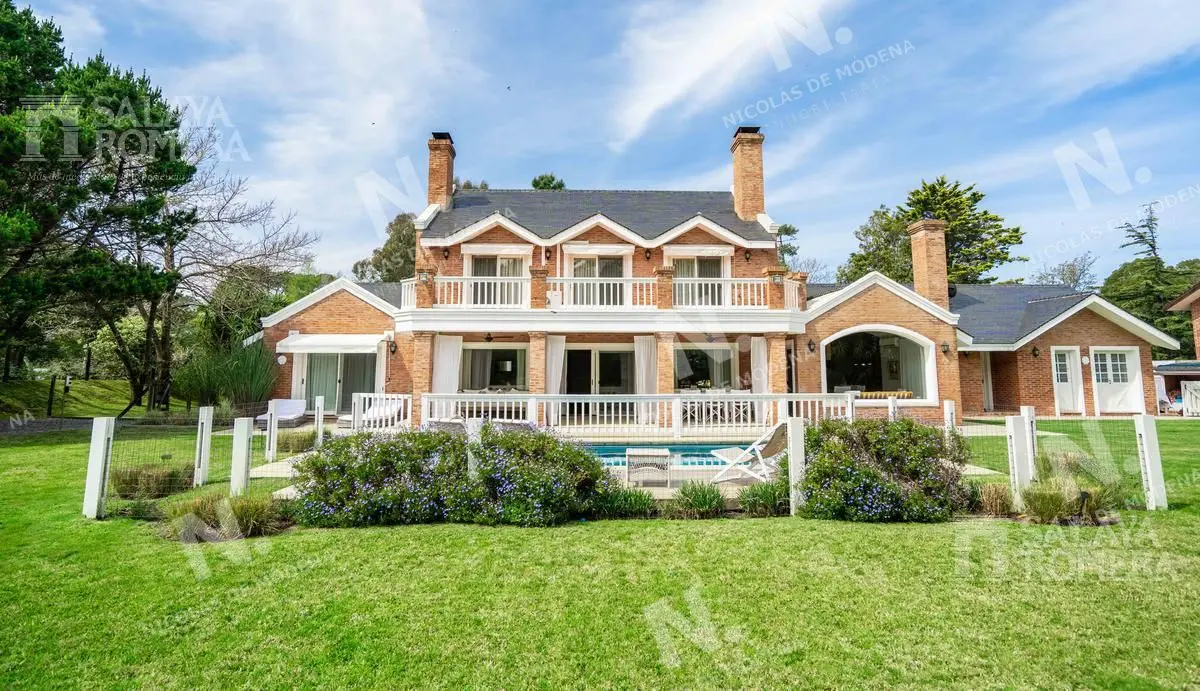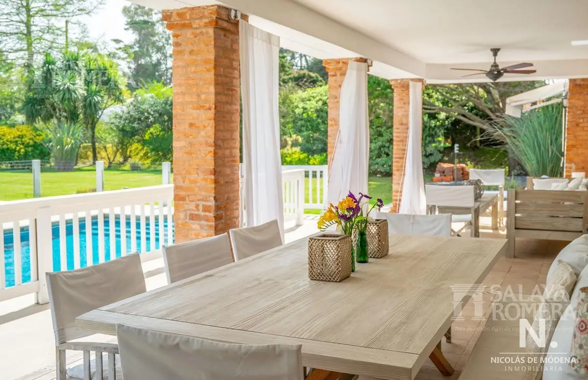 En cuanto a la distribución, en la Planta Baja cuenta con dos dormitorios en Suite (la Principal y la de huéspedes), amplio livingcomedorparrillero interno con la posibilidad de integrar los tres ambientes, Toilette, Amplia cocina con isla, dormitorio de servicio en suite, lavadero y garage cubierto y descubierto. El el exterior, una amplia galería, piscina cercada con solarium de lapacho, vestuario con ducha completa, parrillero exterior, huerta y un precioso jardín con una vegetación impactante totalmente cercado.