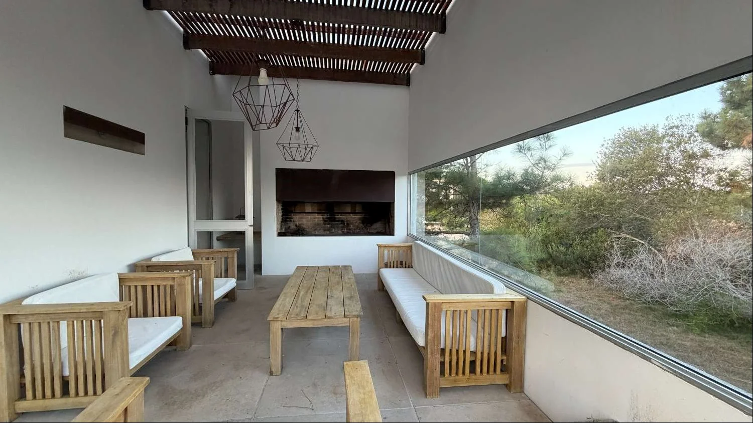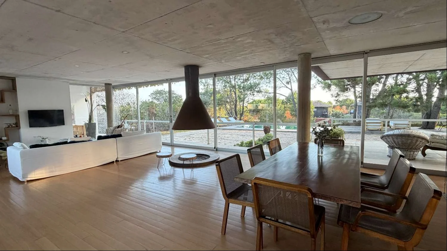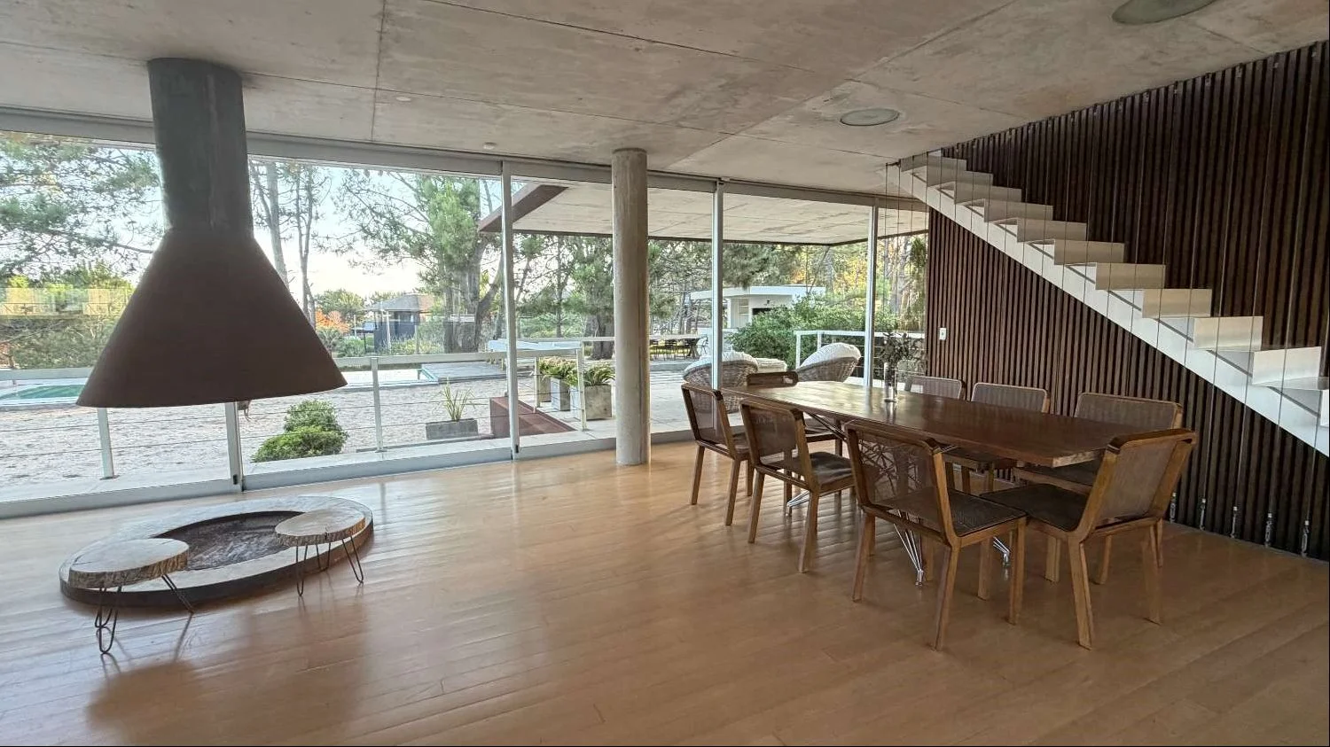 En la planta principal, entrás a un living comedor amplio, muy luminoso, con grandes ventanales y una estufa a leña de diseño que le da mucha calidez. Todo se integra de forma natural con el exterior. La cocina está totalmente equipada y conectada con un patio y áreas de servicio muy prácticas.