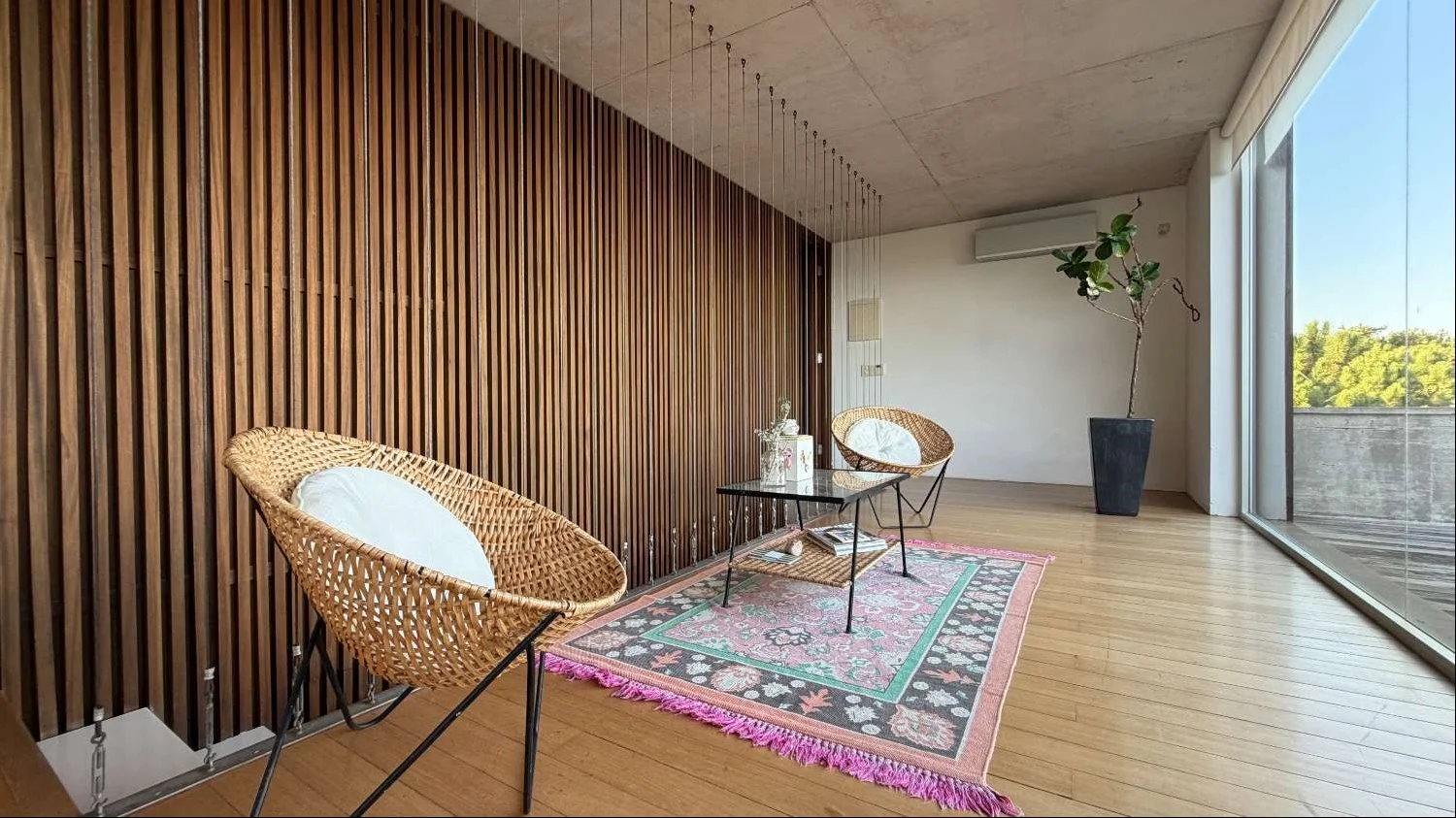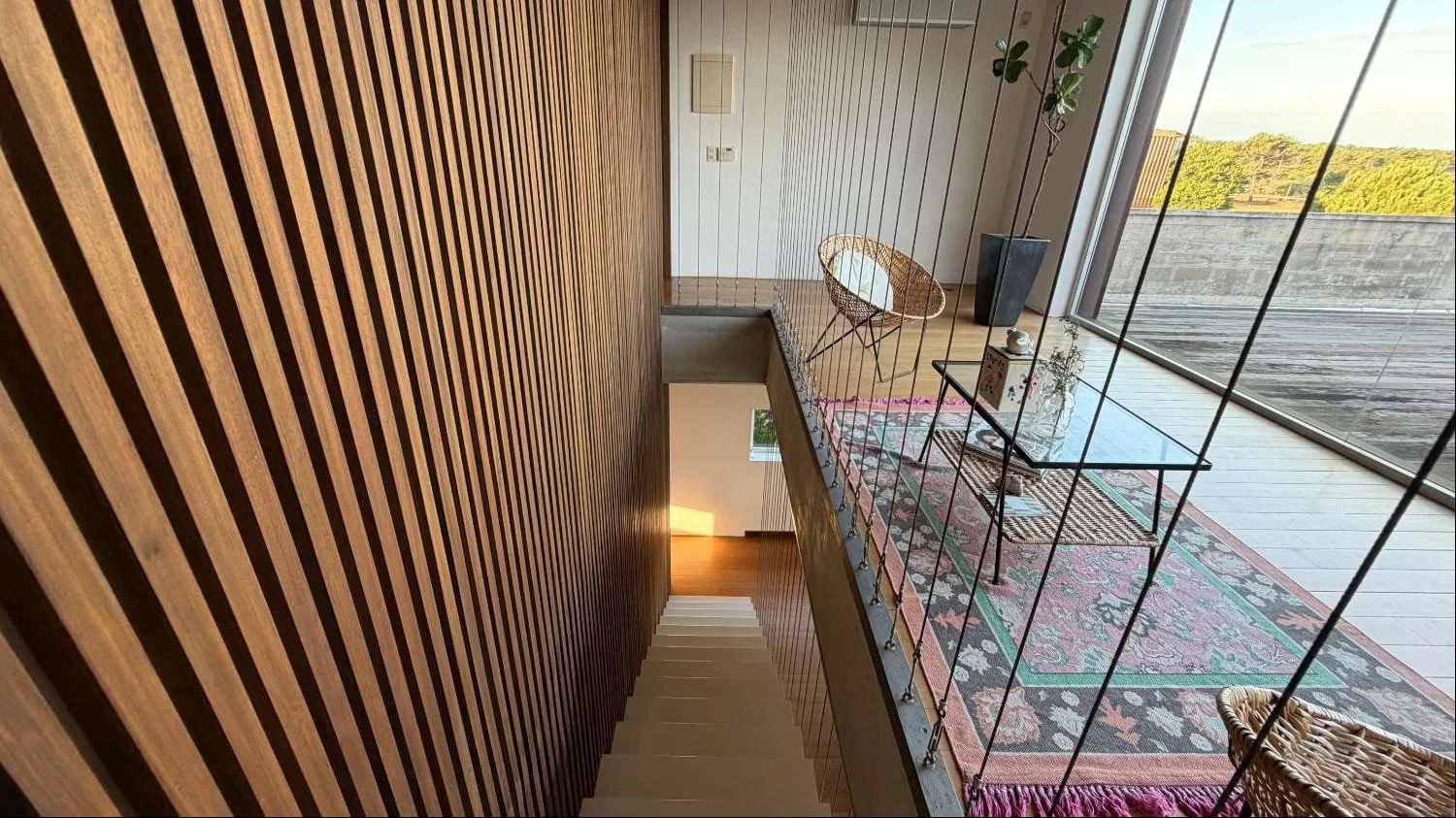 En la planta alta, la casa sigue abriéndose hacia el paisaje, con muy buenas vistas al entorno natural y al mar. Hay un gran salón que funciona perfecto como lugar de relax, lectura o playroom.