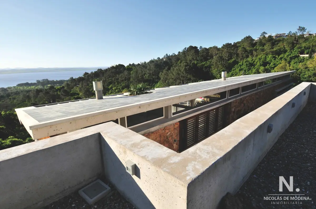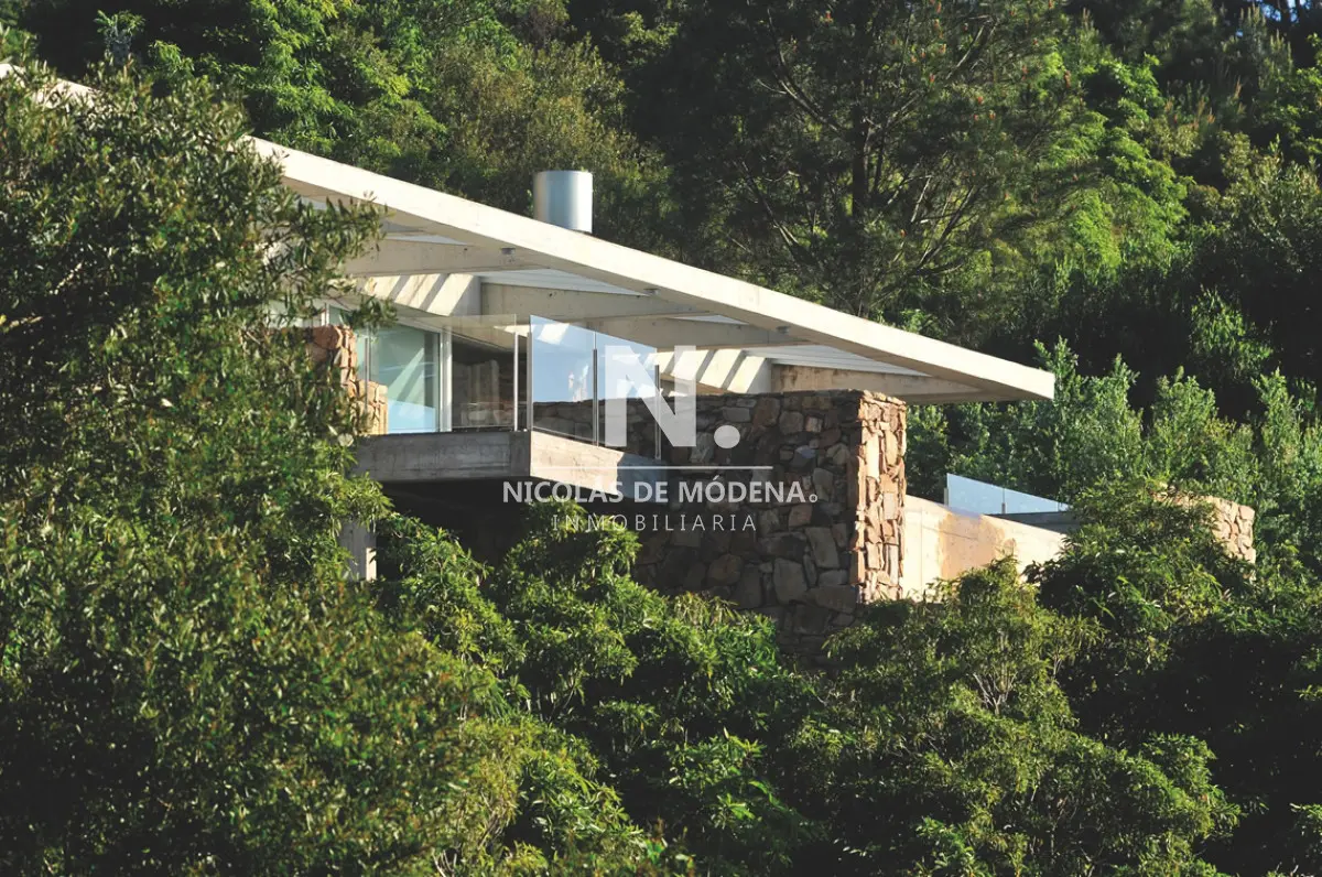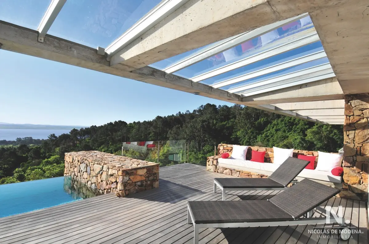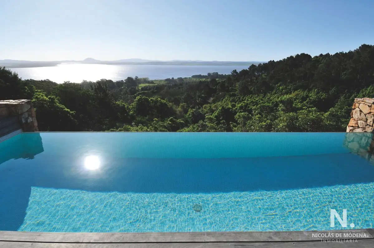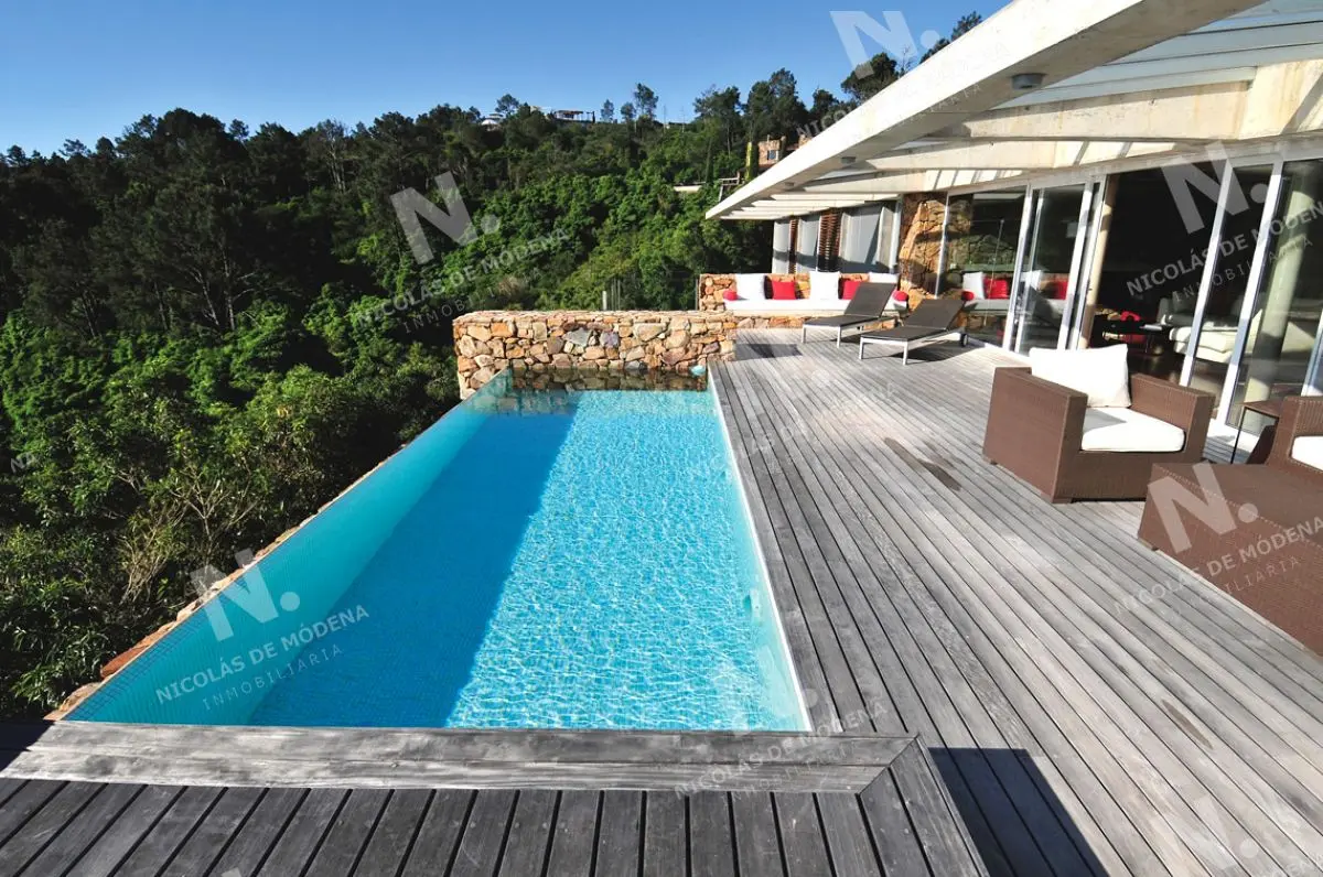Punta Ballena, Las Cumbres. Casa tipo Chalé de características excepcionales ubicada de manera elevada sobre un terreno en forma de barranco. Realizada en estructura de hormigón armado y piedra contando con una excepcional vista a la Laguna del Sauce. Desarrollada en dos plantas Cuenta con 3 dormitorios en suite. Living comedor con estufa a leña Cocina definida. Calefacción por losa radiante eléctrica individual y aires acondicionados en todos los ambientes. Piscina desbordante sobre el borde del deck con vista panorámica Estacionamiento para visitantes en la entrada. Excepcional conjugación de la naturaleza y la arquitectura moderna. Consulte con nuestros asesores. Referencia Interna : Tera-11682