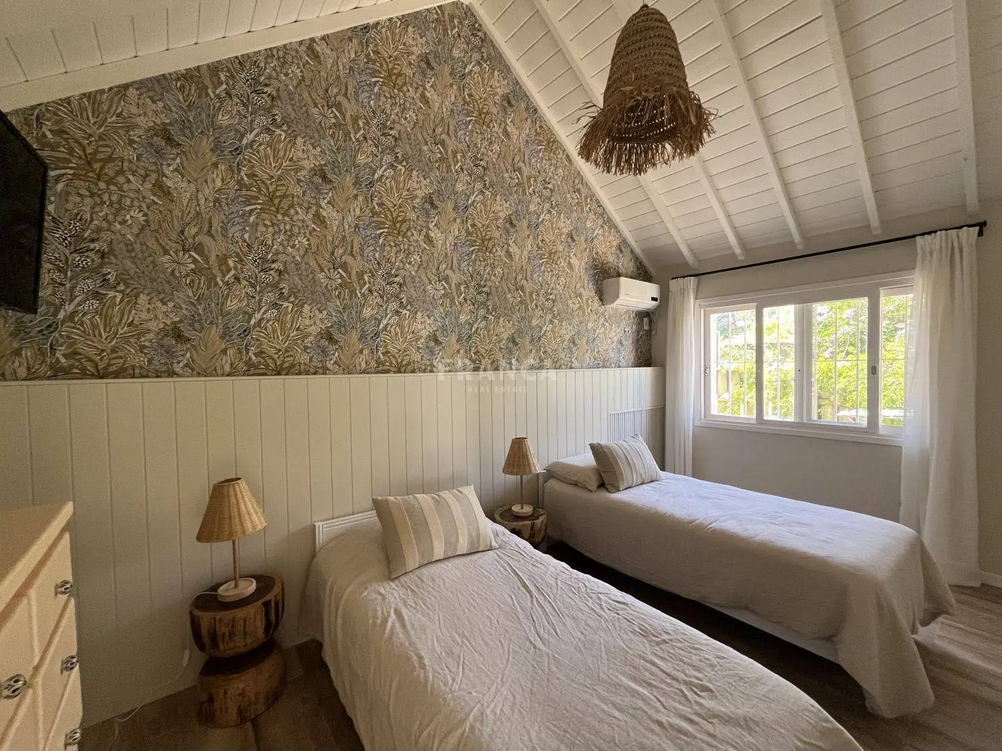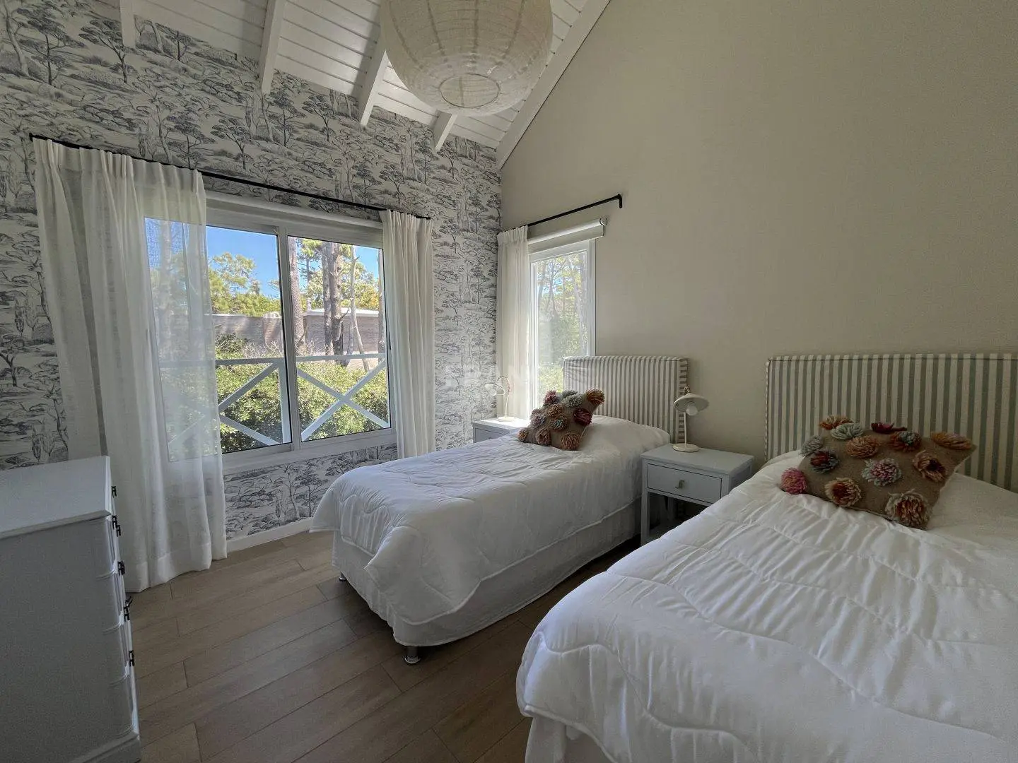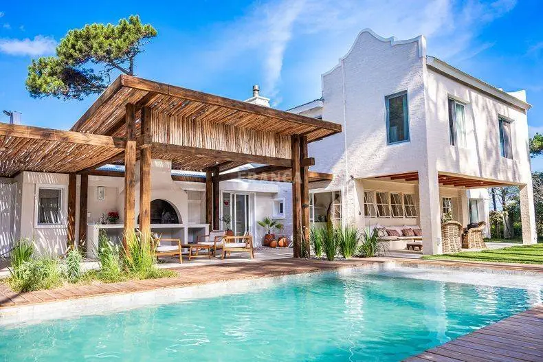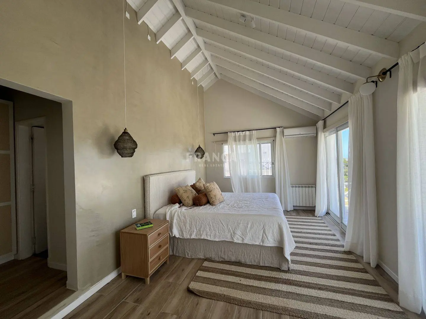 En la planta baja, el living con estufa a leña invita a reunirse en los días fríos, acompañado de un comedor y cocina equipada, toilette de cortesía y dos dormitorios con baño compartido, uno de ellos con cama matrimonial. Desde la planta baja se accede directamente al jardín, donde encontrarás una piscina climatizada y un parrillero para los encuentros al aire libre.