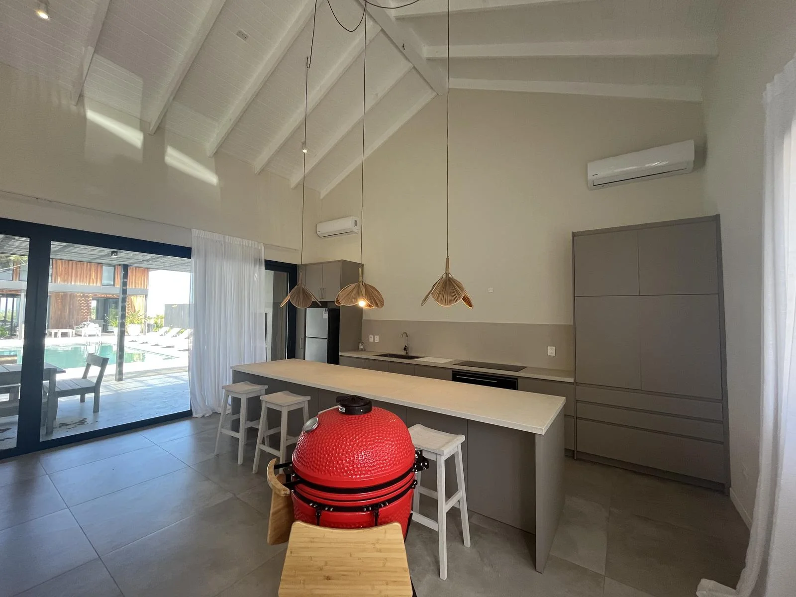 In the main block, there is a spacious living and dining area with an open-plan kitchen and a guest toilet.