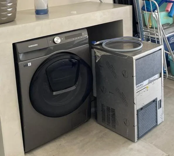 Enclosed garage for one car and guest parking. It also includes a laundry area and staff quarters with a bathroom for two people.