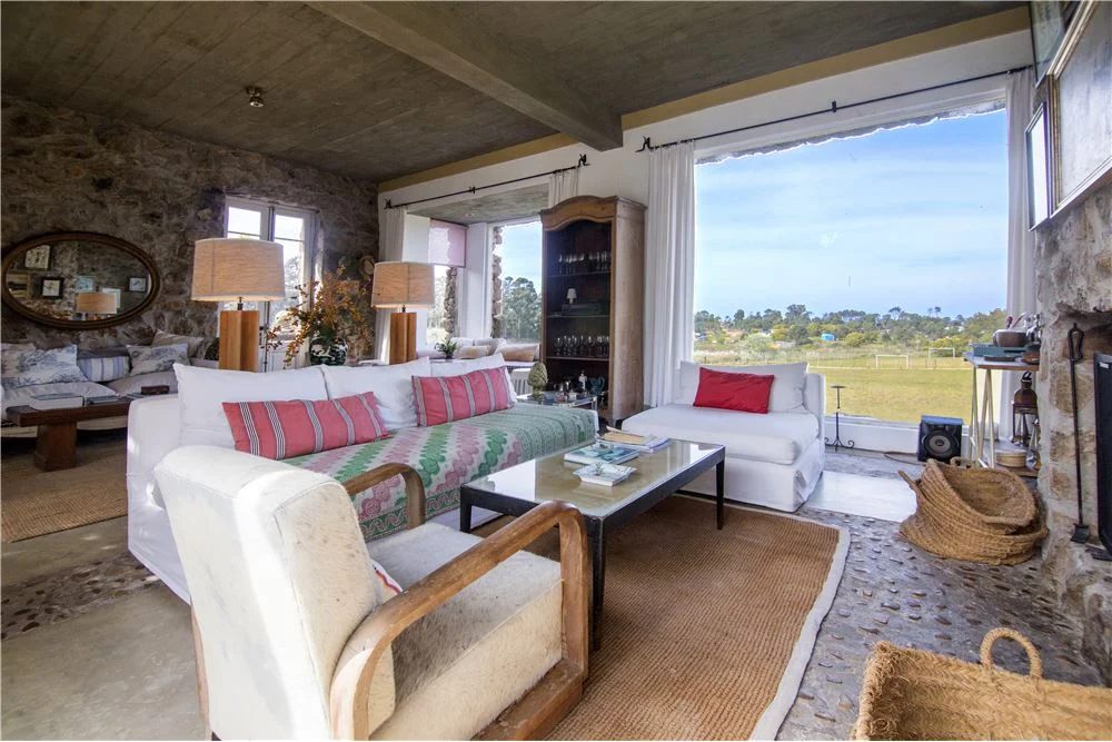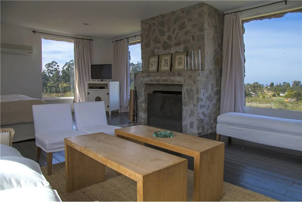 Living con hogar a leña y muy linda vista despejada a jardin y entorno verde, comedor, y sala de lectura.
