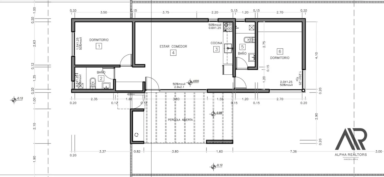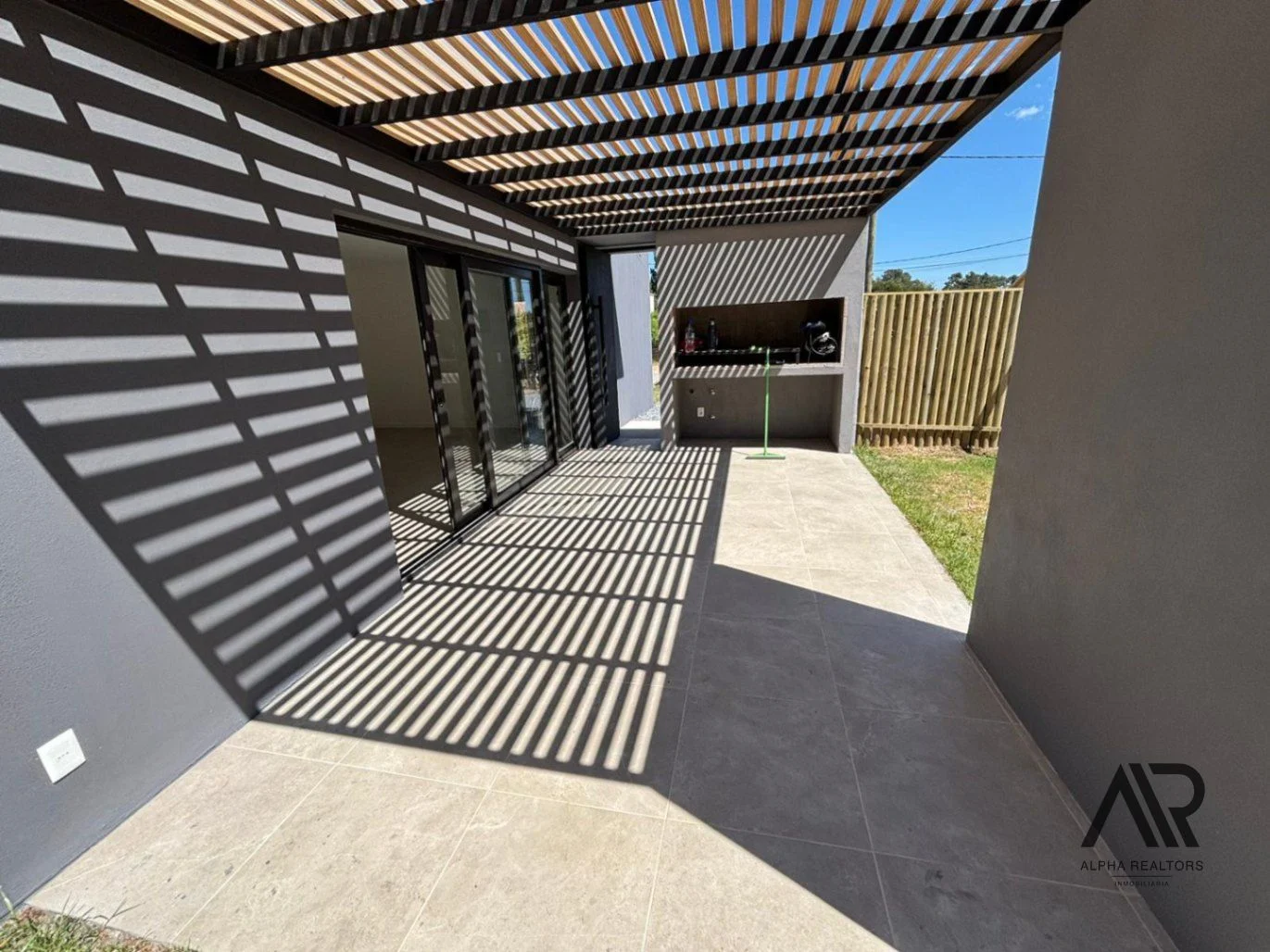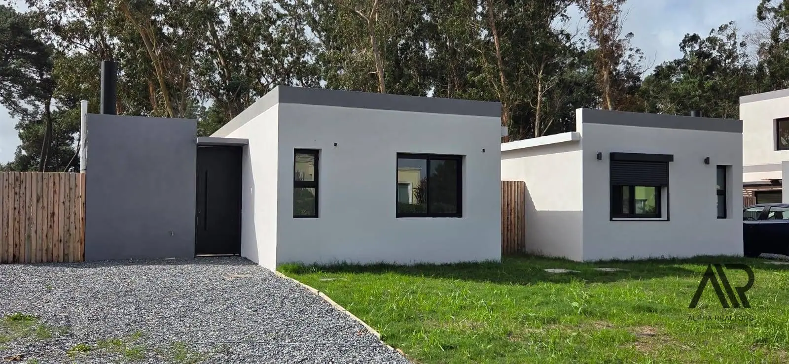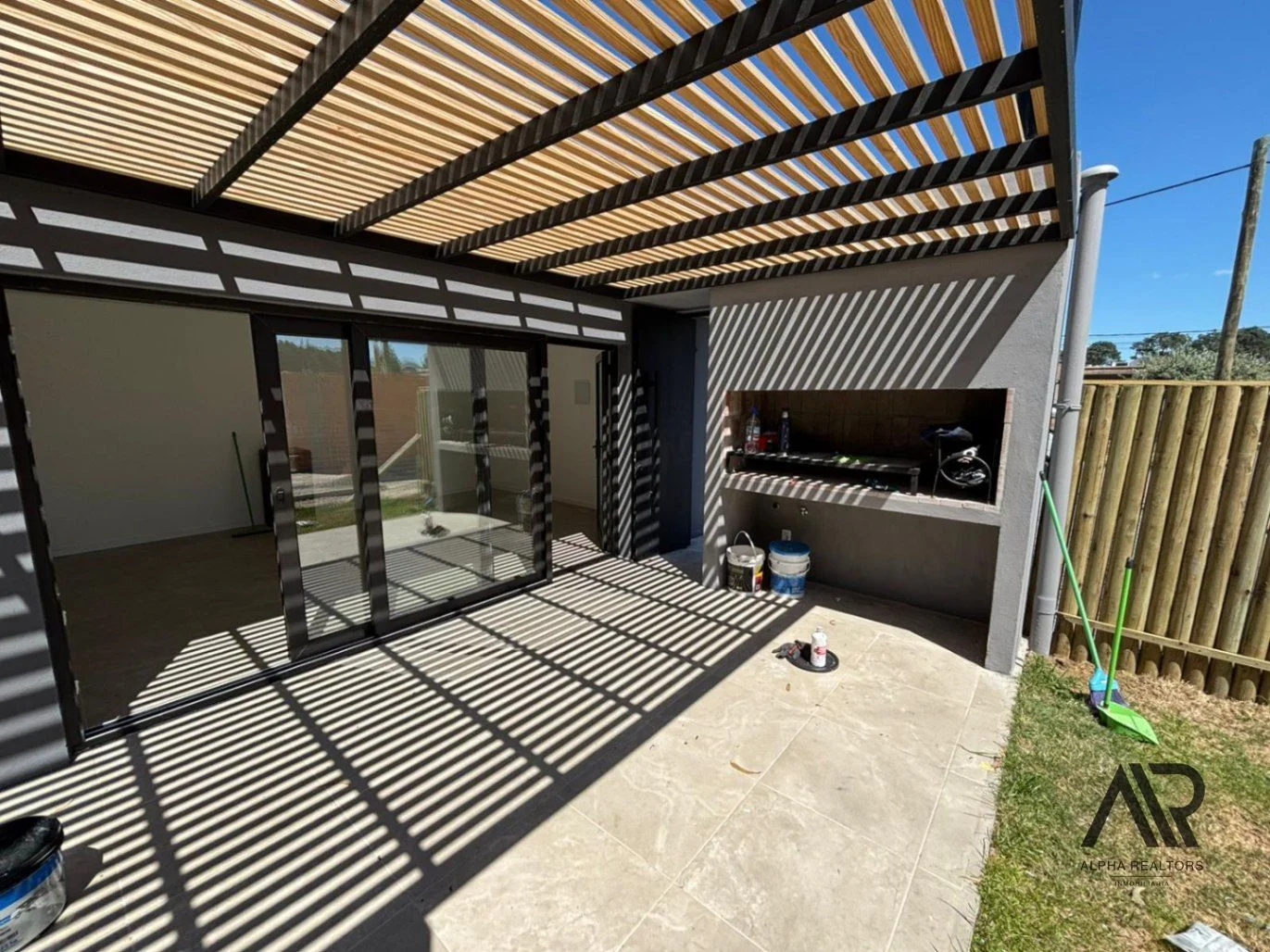 Paredes Interiores: Ticholo con yeso emplacado de ambos lados Aberturas: Perfil de PVC en color negro con vidrios dobles (DVH) Mesadas: En granito Placares: Placares en MDF de 18 mm en cocina bajo mesada y aéreo, en los dormitorios y pasillo placares de piso a techo Techo: Techos de isopanel, cámara de aire y cielorraso en yeso Pisos y revestimientos: Cerámica rectificada Pérgola Parrillero: Armada en metal pintado color negro y madera Parrillero: Completo con parrilla y quemador colocado, al lado nicho con instalación para lavarropa