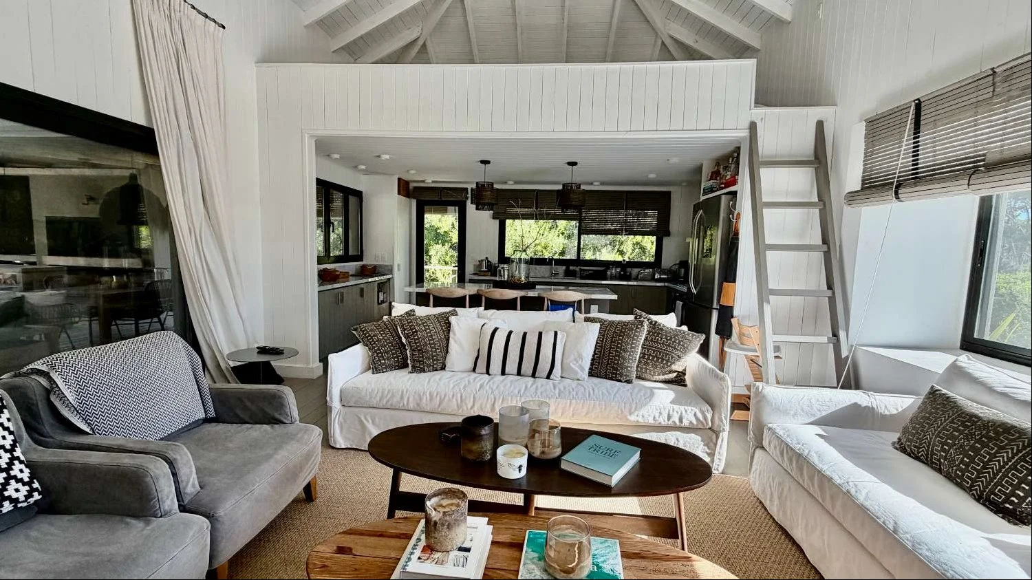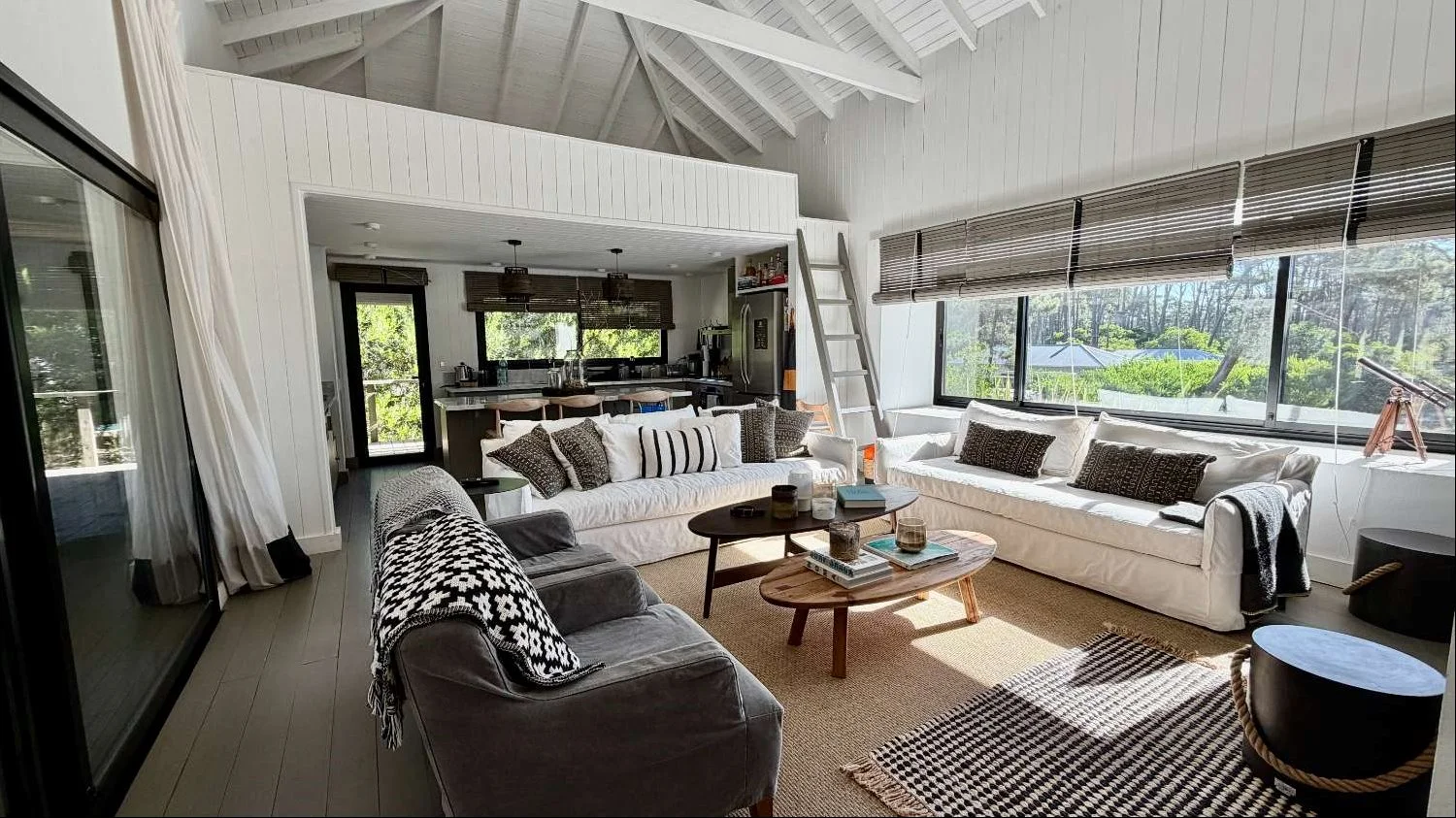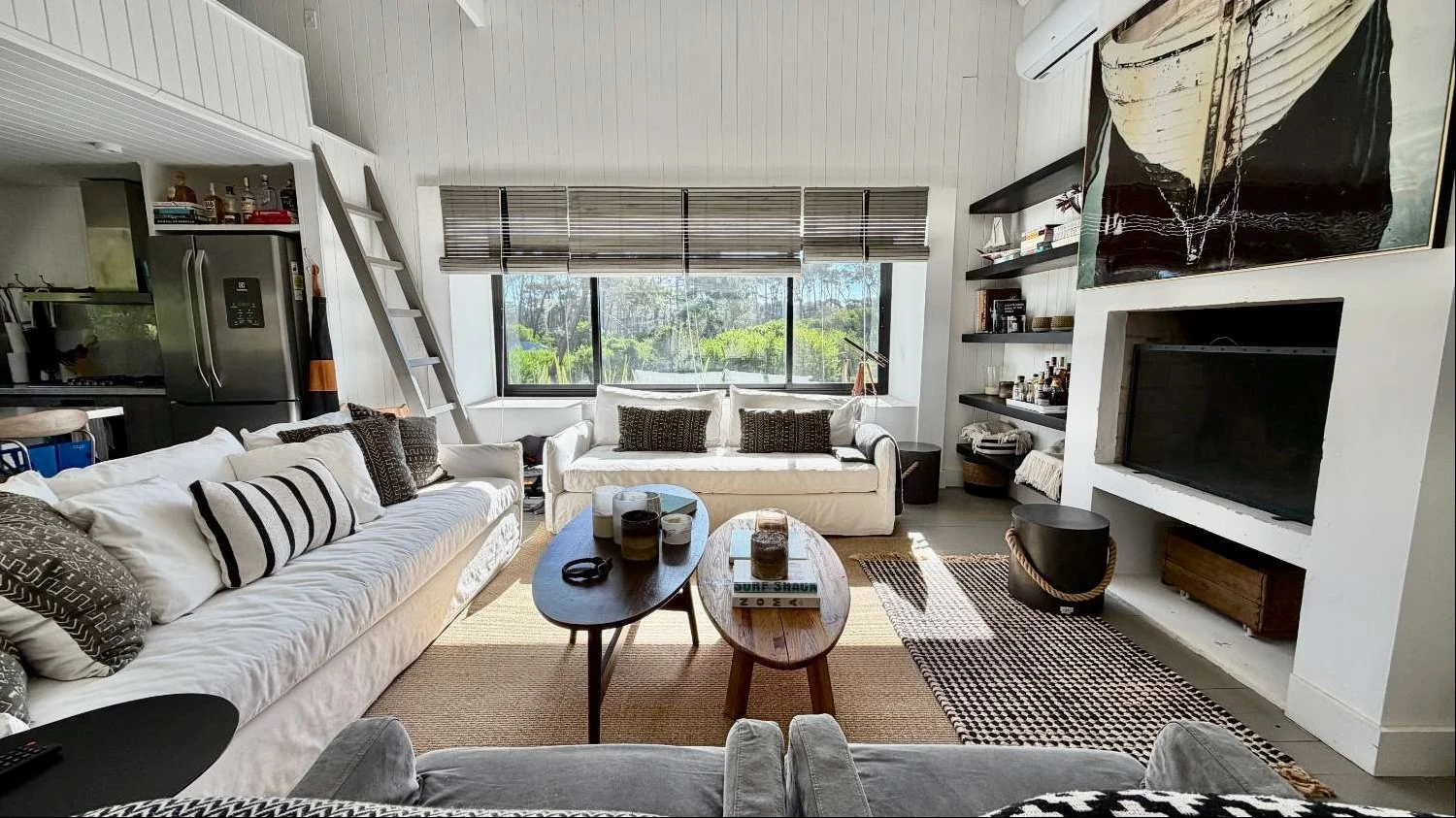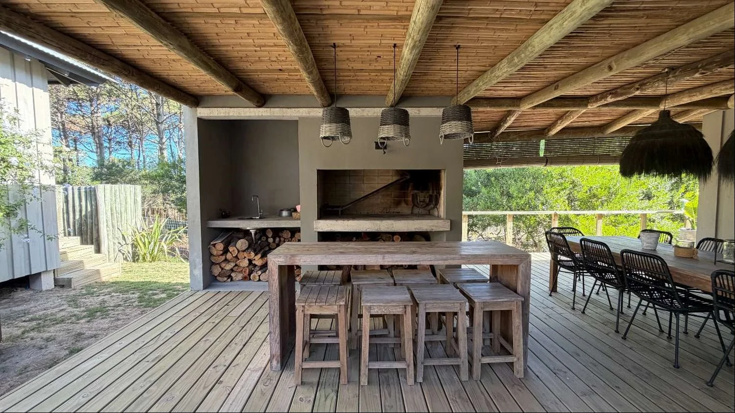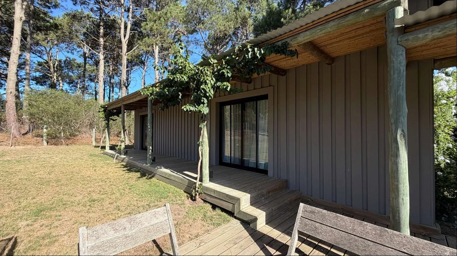 En la casa principal se encuentra un dormitorio en suite con vestidor, una amplio living con estufa a leña, cocina integrada moderna y funcional, ideal para quienes disfrutan de compartir momentos mientras cocinan. Tiene un semi piso con 3 camas individuales, sobre el living.