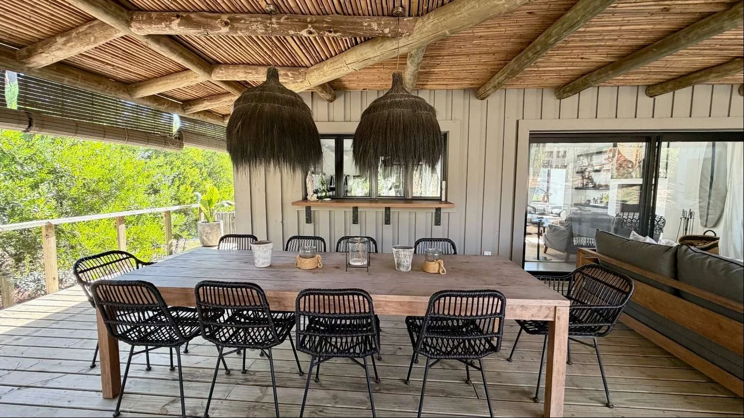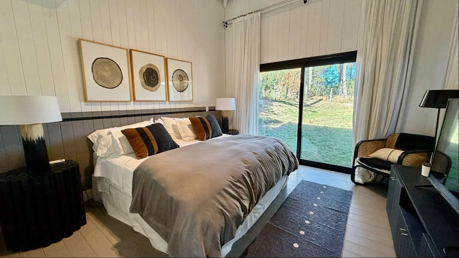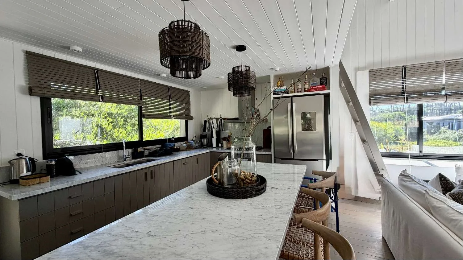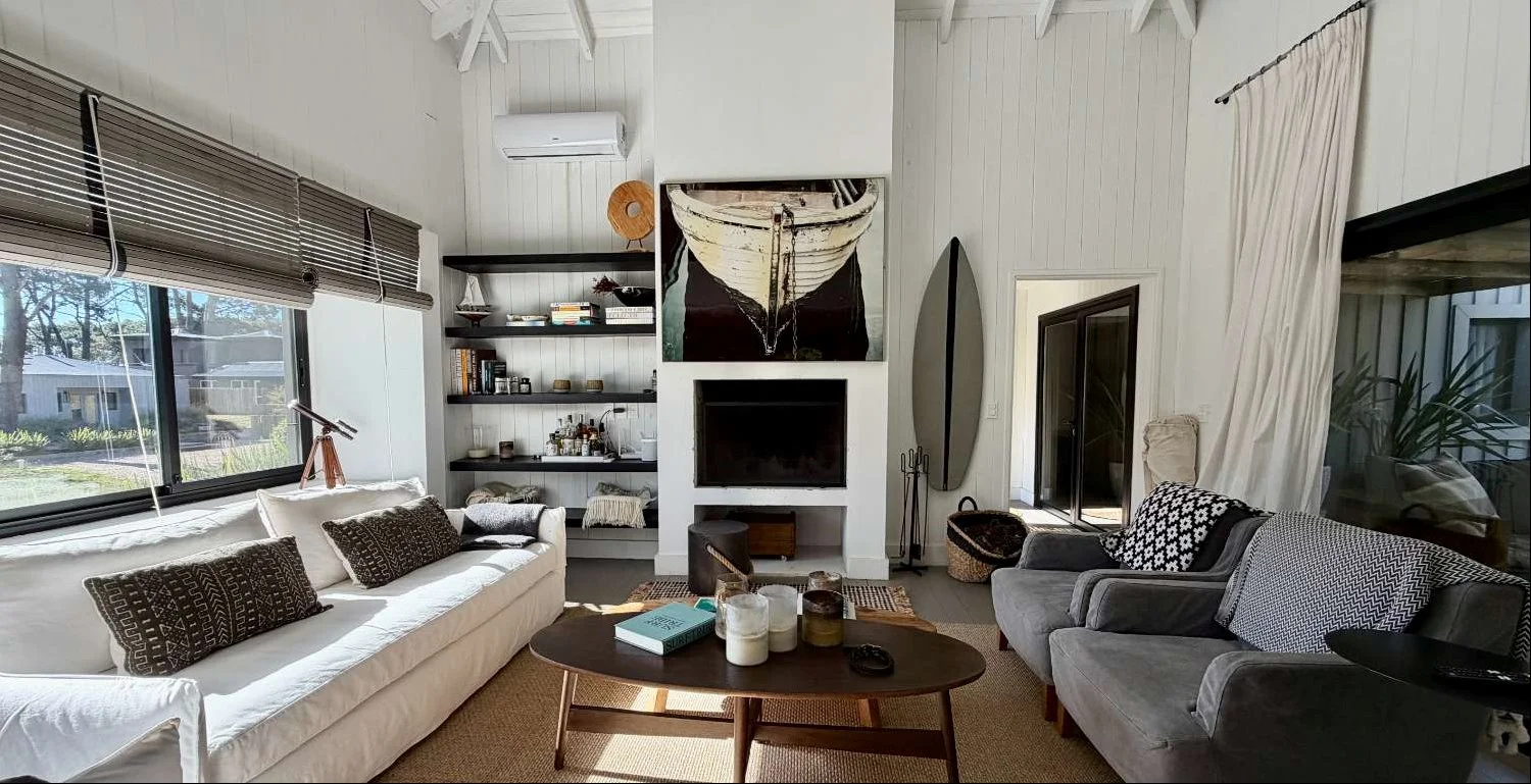 En la casa principal se encuentra un dormitorio en suite con vestidor, una amplio living con estufa a leña, cocina integrada moderna y funcional, ideal para quienes disfrutan de compartir momentos mientras cocinan. Tiene un semi piso con 3 camas individuales, sobre el living.