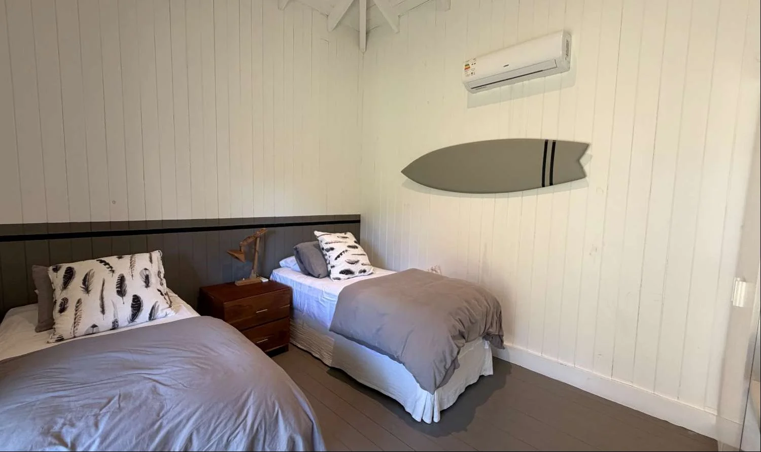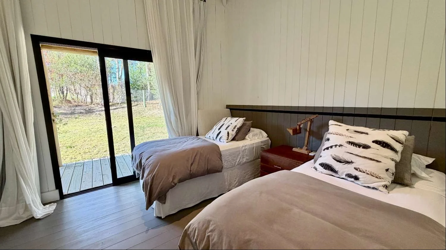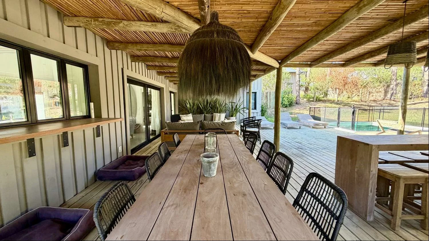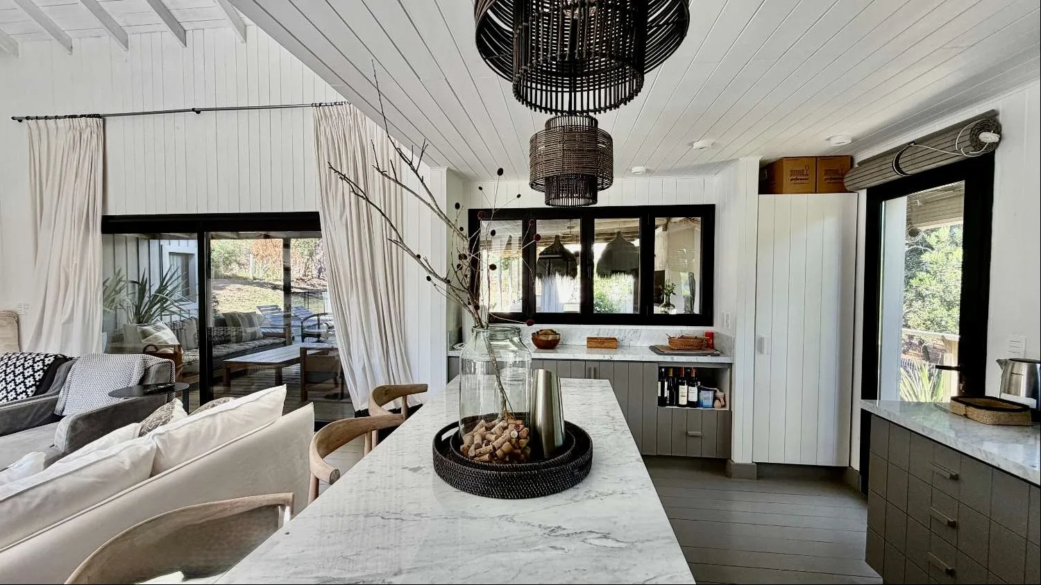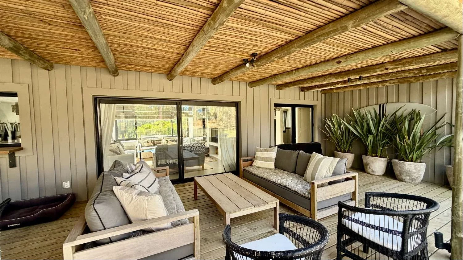 En la casa principal se encuentra un dormitorio en suite con vestidor, una amplio living con estufa a leña, cocina integrada moderna y funcional, ideal para quienes disfrutan de compartir momentos mientras cocinan. Tiene un semi piso con 3 camas individuales, sobre el living.