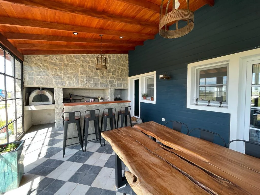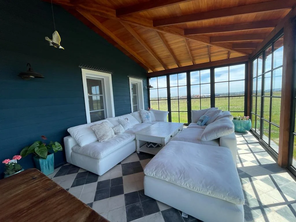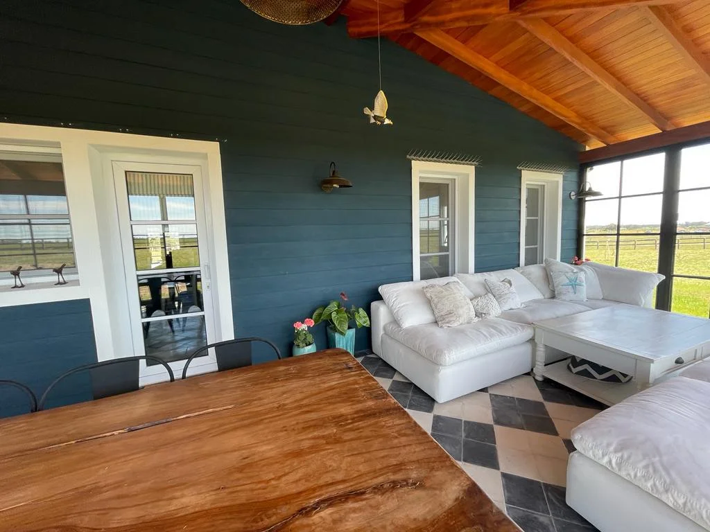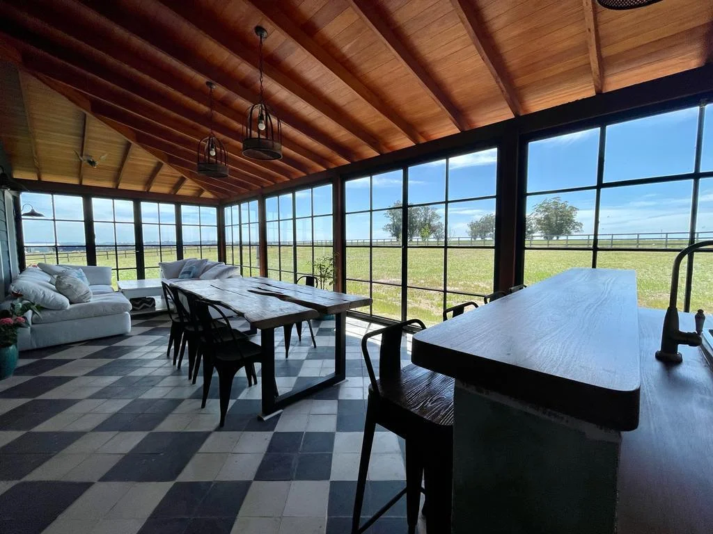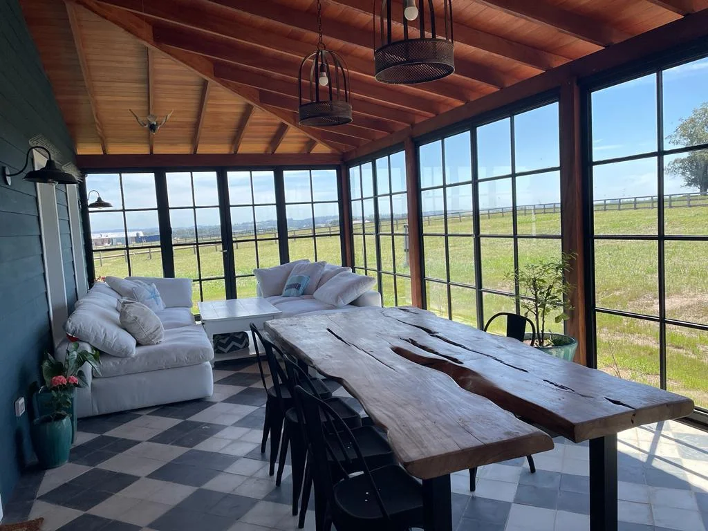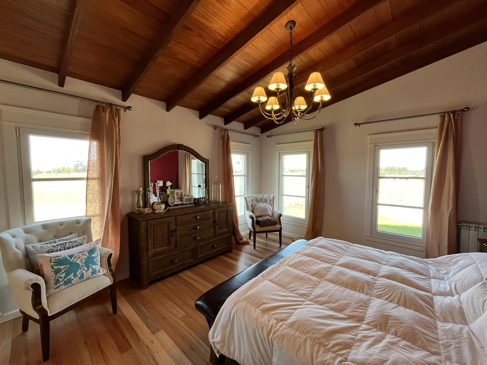 A estrenar y de gran tamaño, implantada en un terreno de 1 hectárea, esta casa de 448 m2 cuenta con tres dormitorios en suite, toilette y entrepiso que se utiliza como playroom con biblioteca y baño privado, el cual se podría transformar en otro dormitorio, con excelente vista al campo desde este segundo nivel.