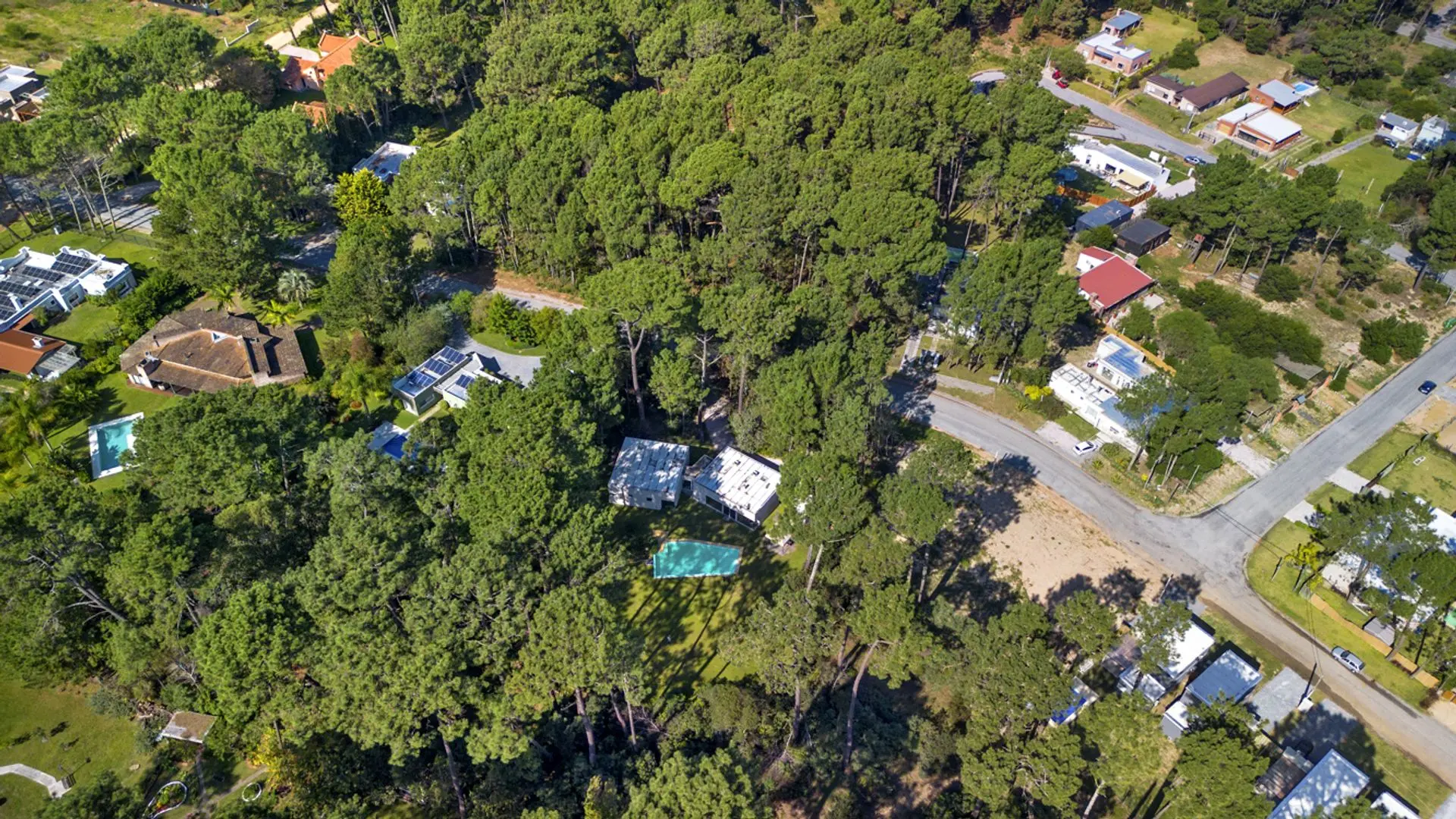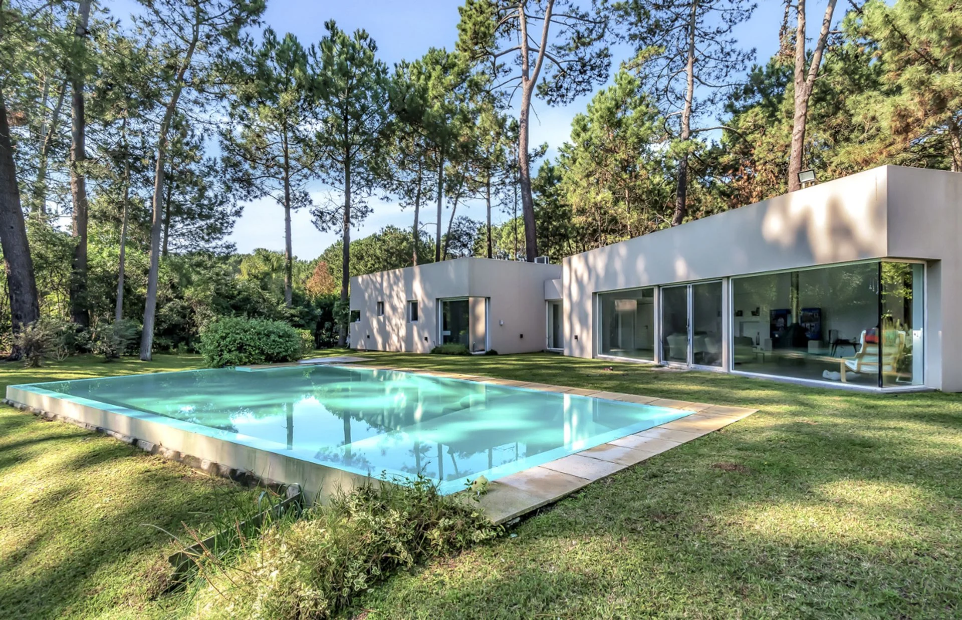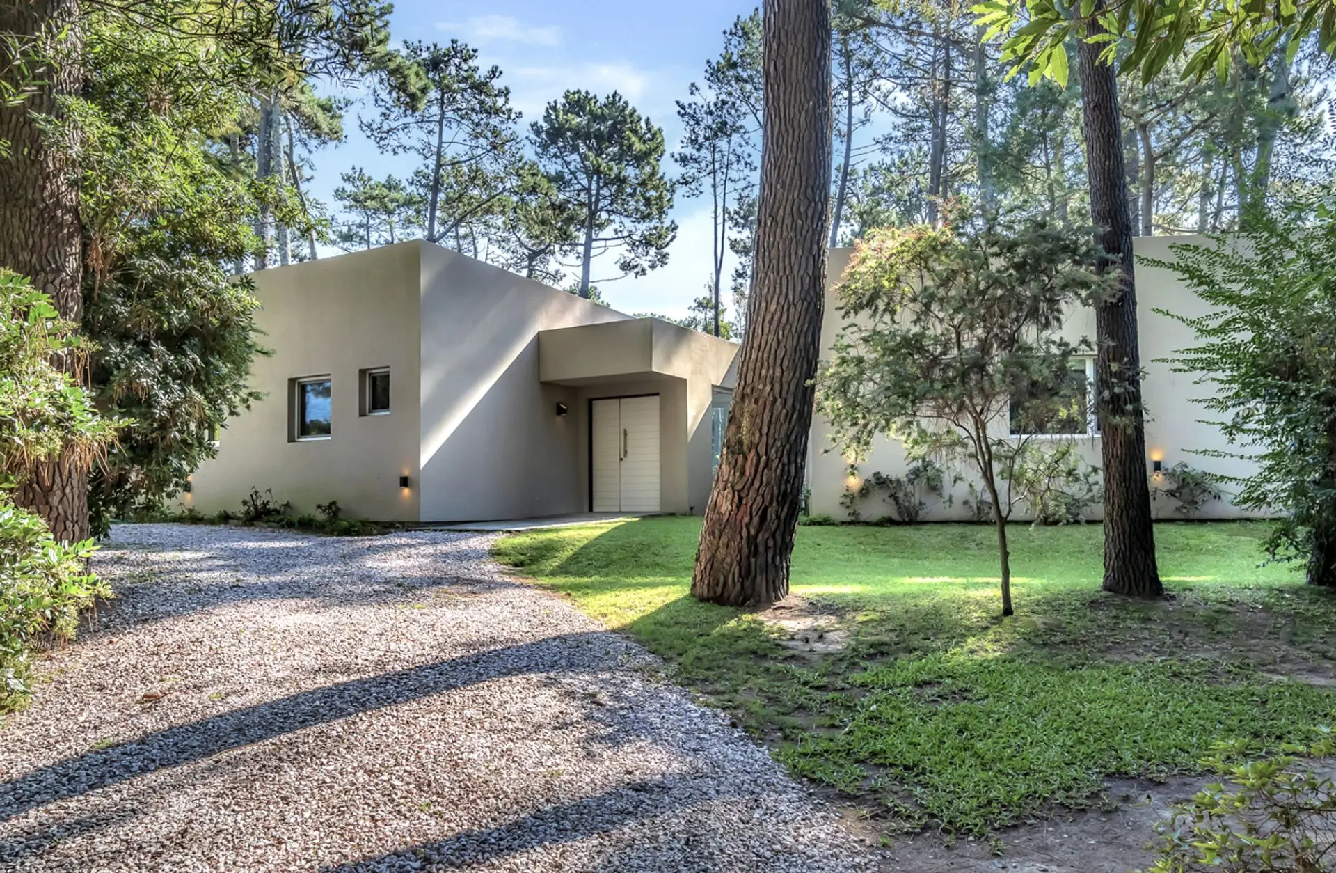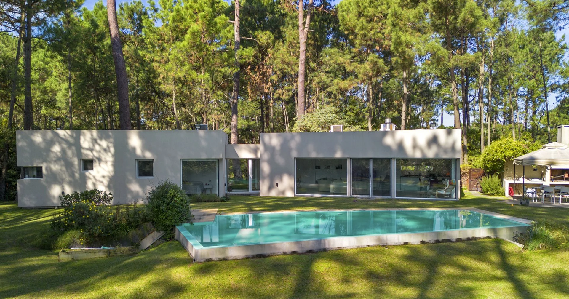 La casa está ubicada en un parque de pinos, acacias. El parque mide 3179 m2 con piscina de borde infinito y playa húmeda para los niños. Zona Parque Burnett, a 10 cuadras de Playa Mansa. La superficie edificada es de 269m2. La casa de estilo moderno minimalista se organiza en dos módulos separados por un hall de entrada vidriado, lo que permite una total independencia entre las actividades diurnas y nocturnas.