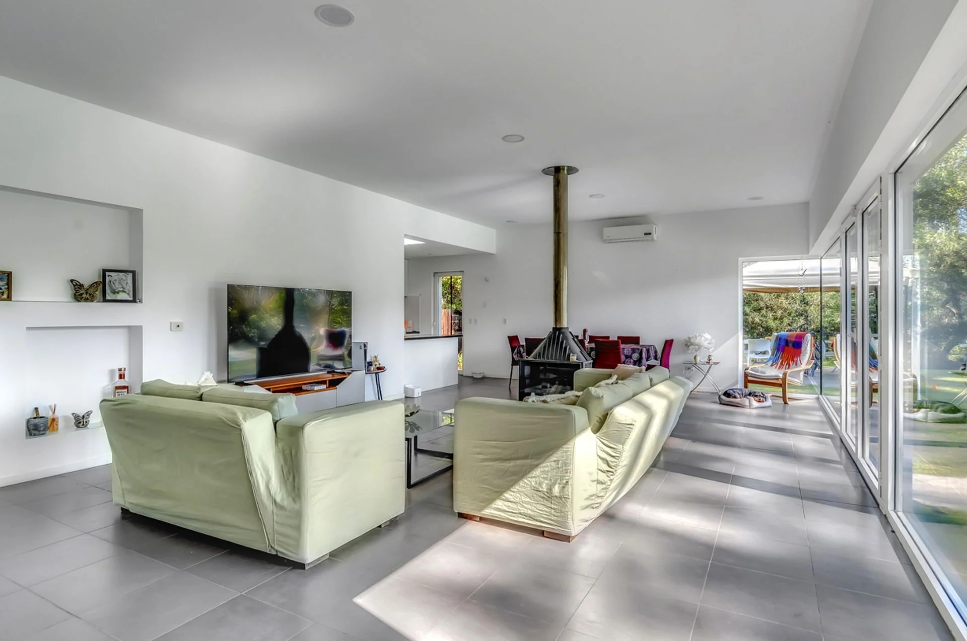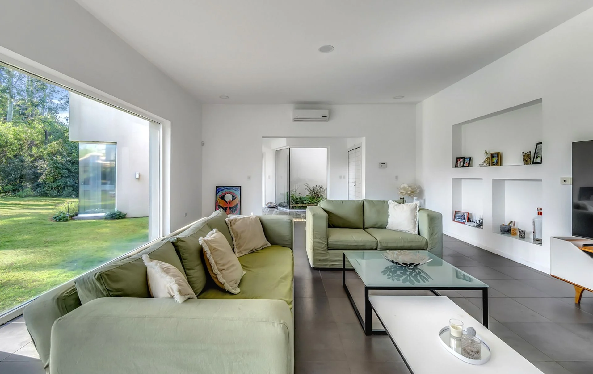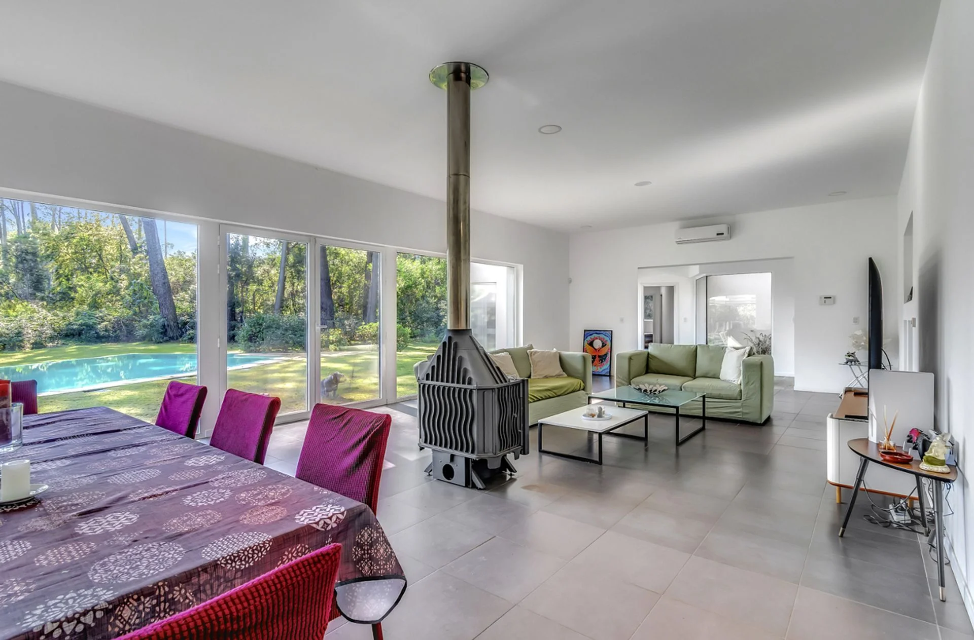 El living comedor es totalmente vidriado, con amplia vista a la piscina y el jardín y dos equipos de aire acondicionado. Tres dormitorios, el principal tiene