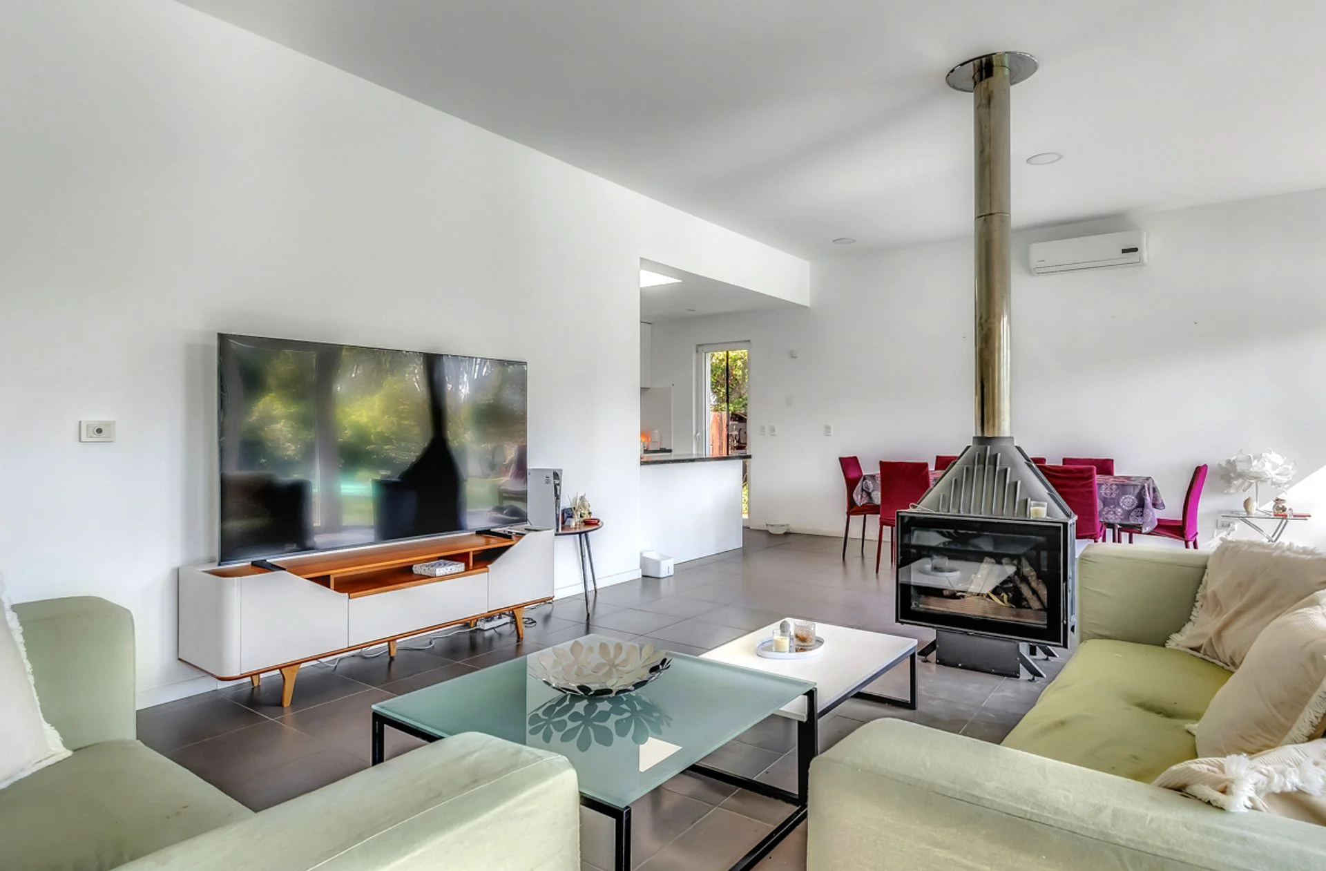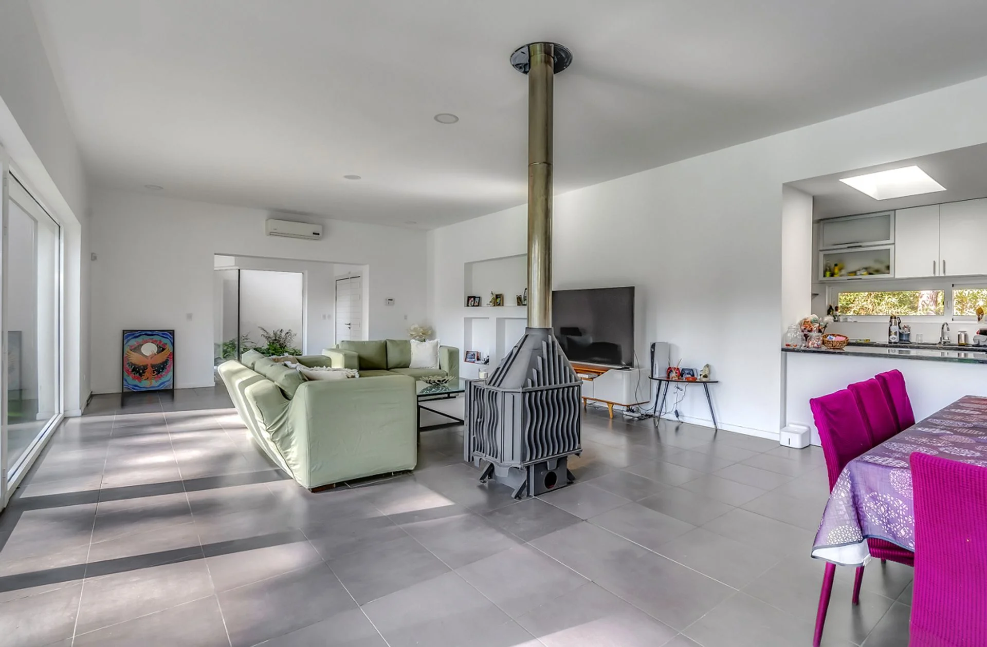 una estufa a leña en el living y aire frio calor en el living comedor el tablero de los aires acondicionados disponible para la colocación de los aires en los otros