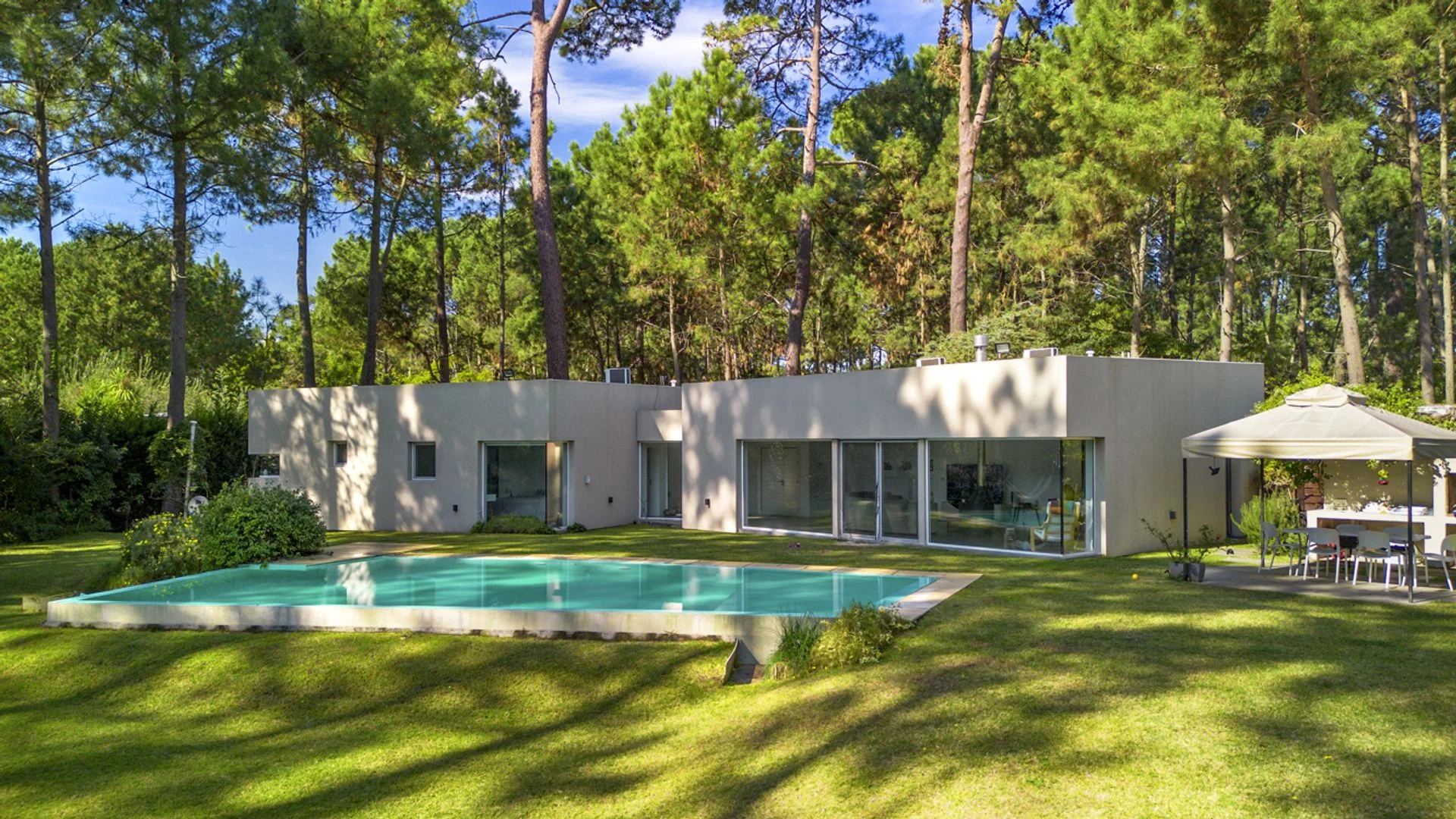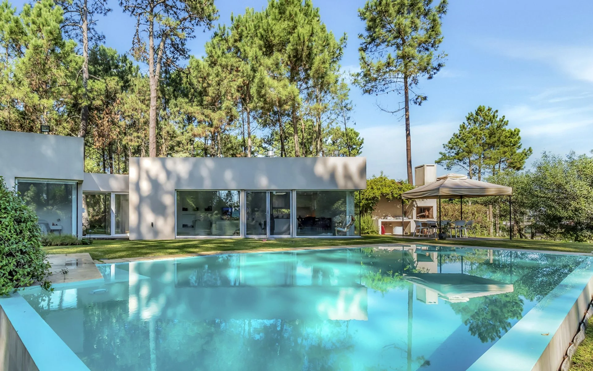 Amplia piscina ubicada próxima a la casa, gazebo y parrilla. La casa está separada de la calle de acceso por una zona verde de pinos, acacias que la