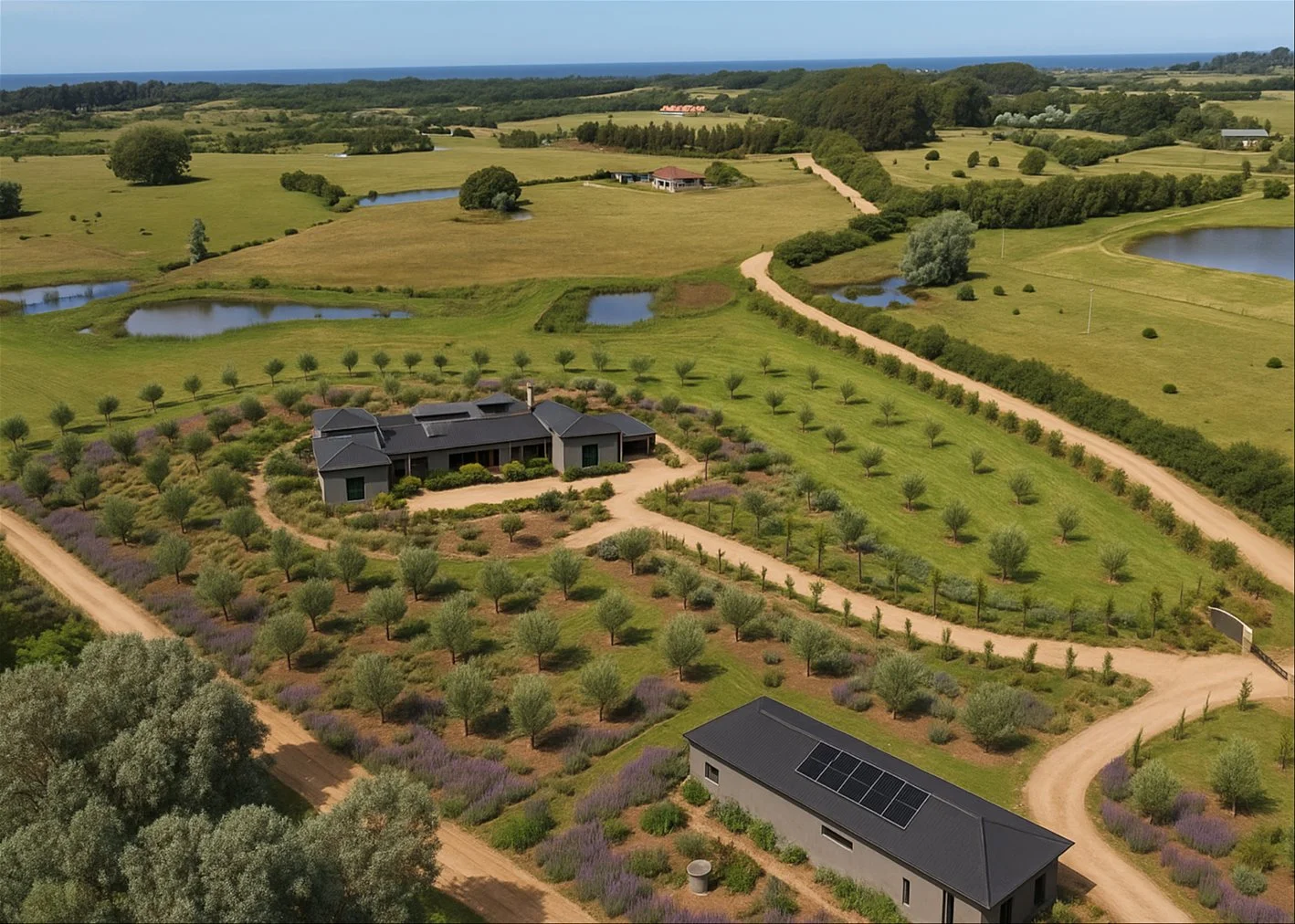 Ubicada a tan solo 5 minutos del Faro de José Ignacio, esta exclusiva chacra combina diseño, comodidad y naturaleza en un entorno privilegiado. Construida sobre un terreno elevado de 5 hectáreas, se asoma desde su nivel superior a una suave barranca que baja hacia los tajamares.