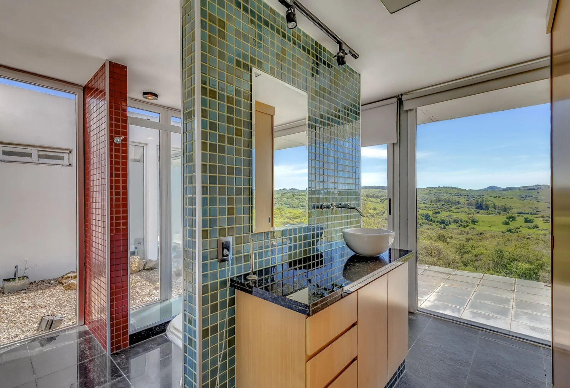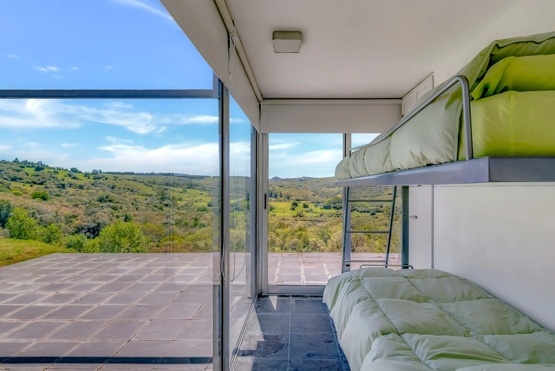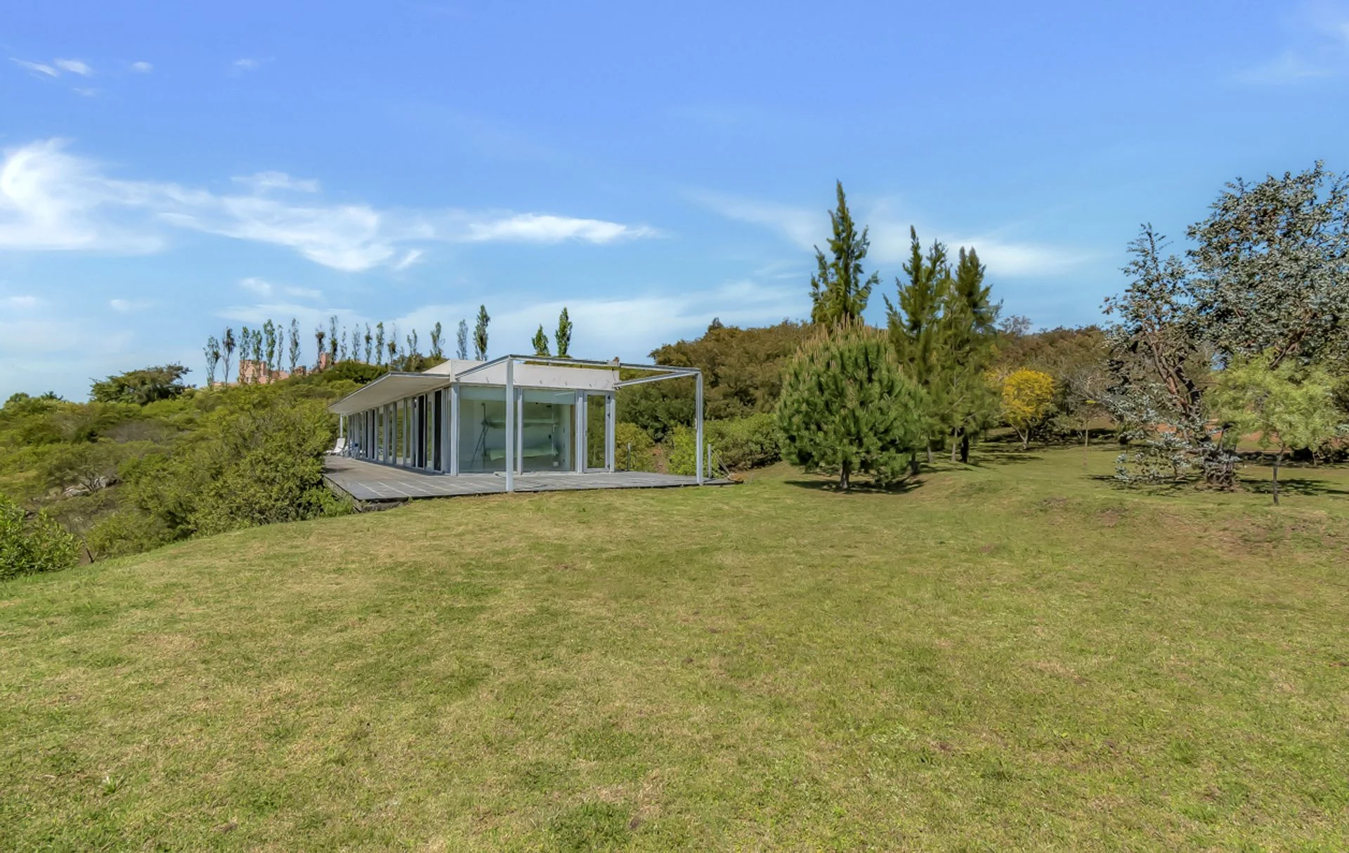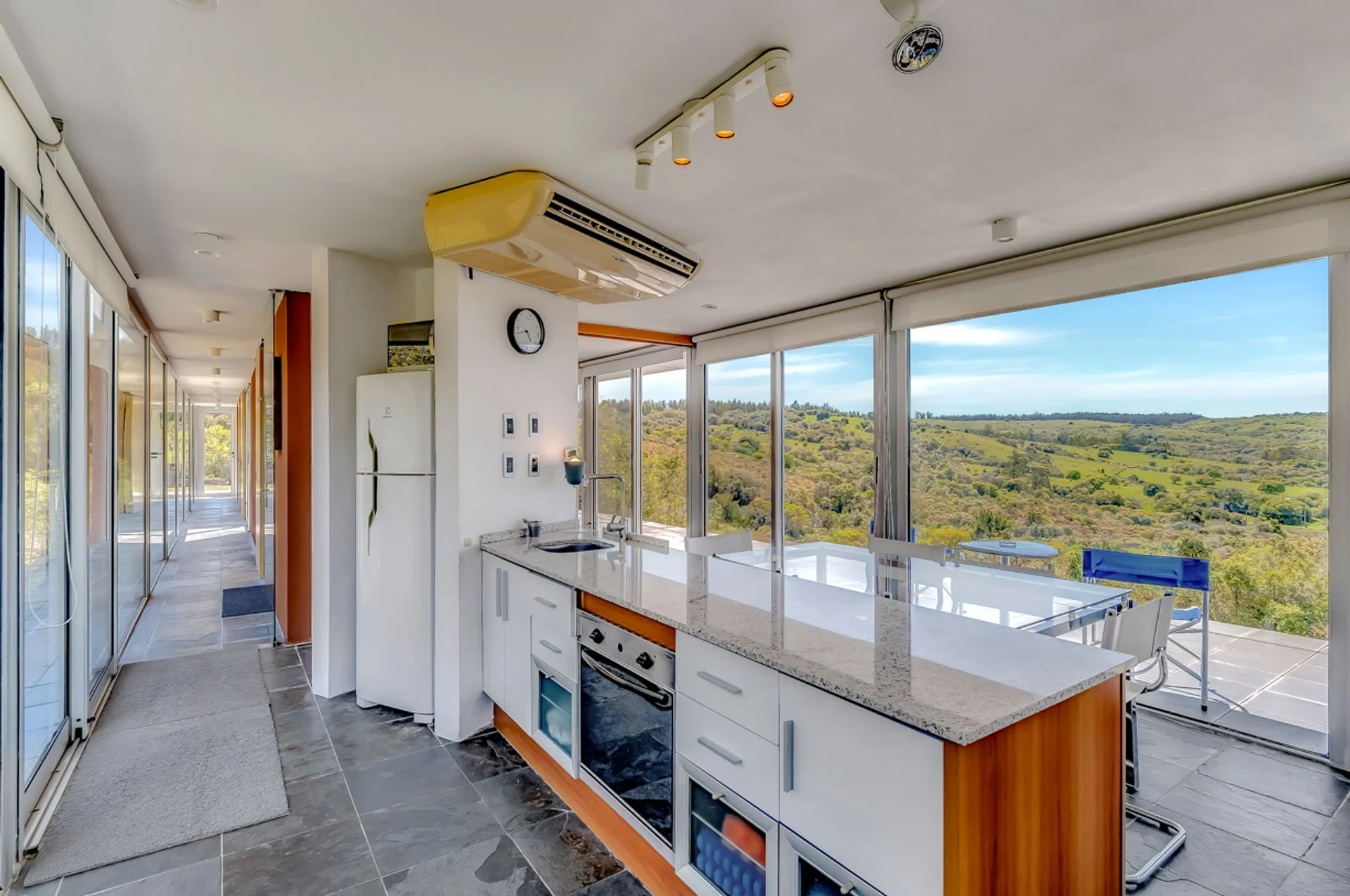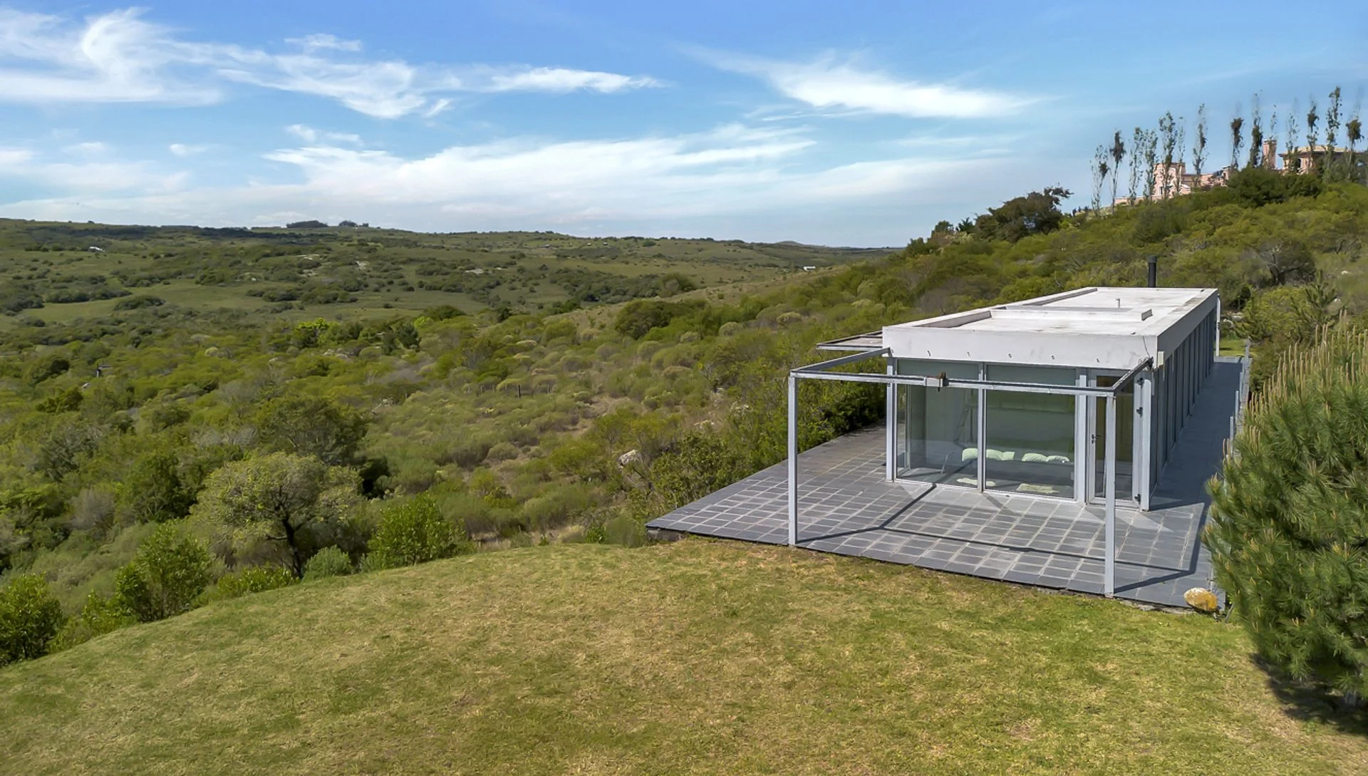 Una residencia minimalista que desafía la gravedad, suspendida sobre un cañadón natural. El genio del arquitecto Franco Comerci se manifiesta en este diseño, donde la casa se proyecta sobre la quebrada. El elemento más atractivo es un piso de vidrio estratégicamente ubicado en el living que ofrece una vista única hacia la profundidad del cañadón, integrando el paisaje no solo de manera horizontal, sino también vertical.