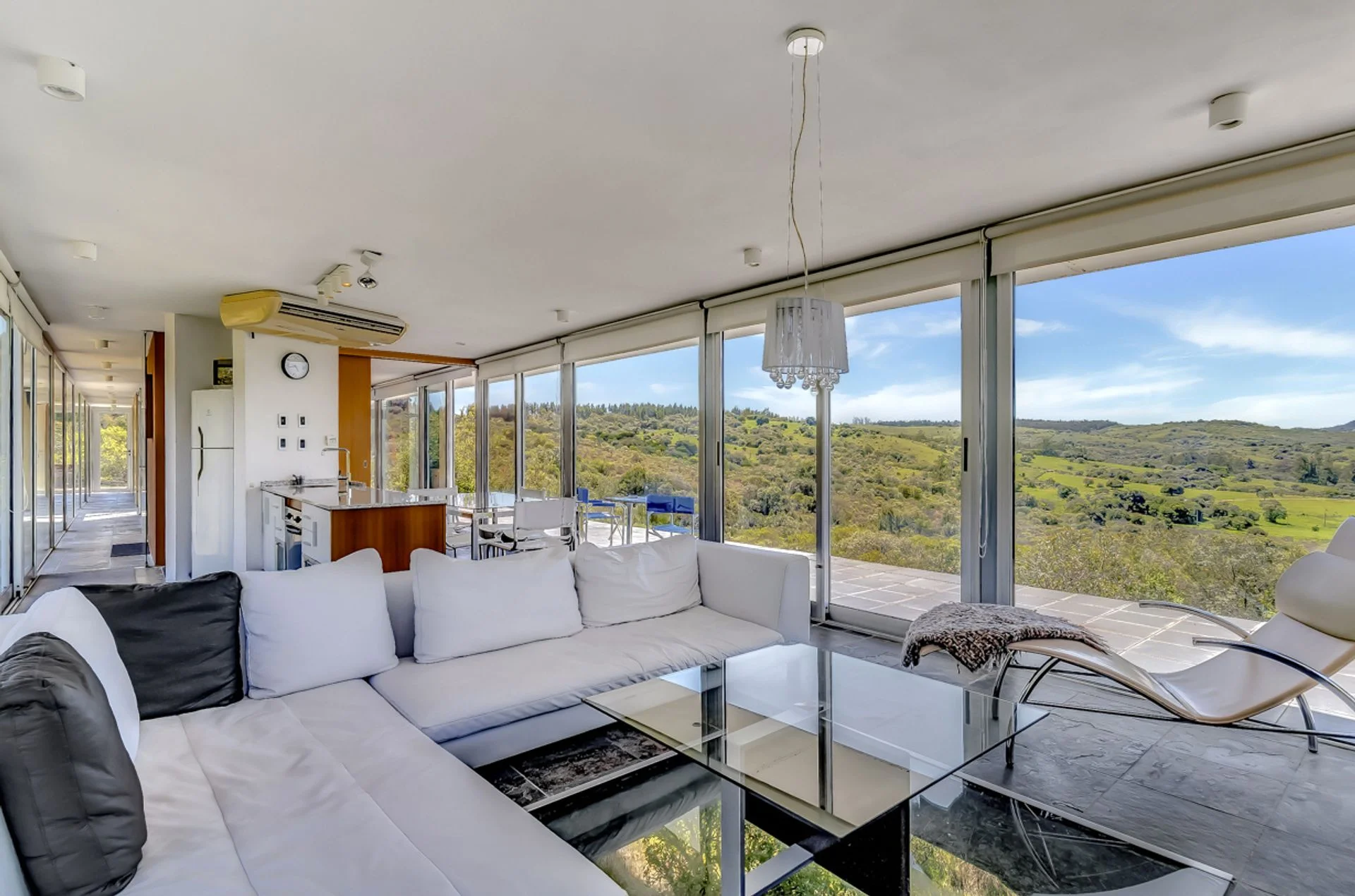 Espacio Principal: Living comedor y cocina integrados, con el distintivo piso de vidrio.