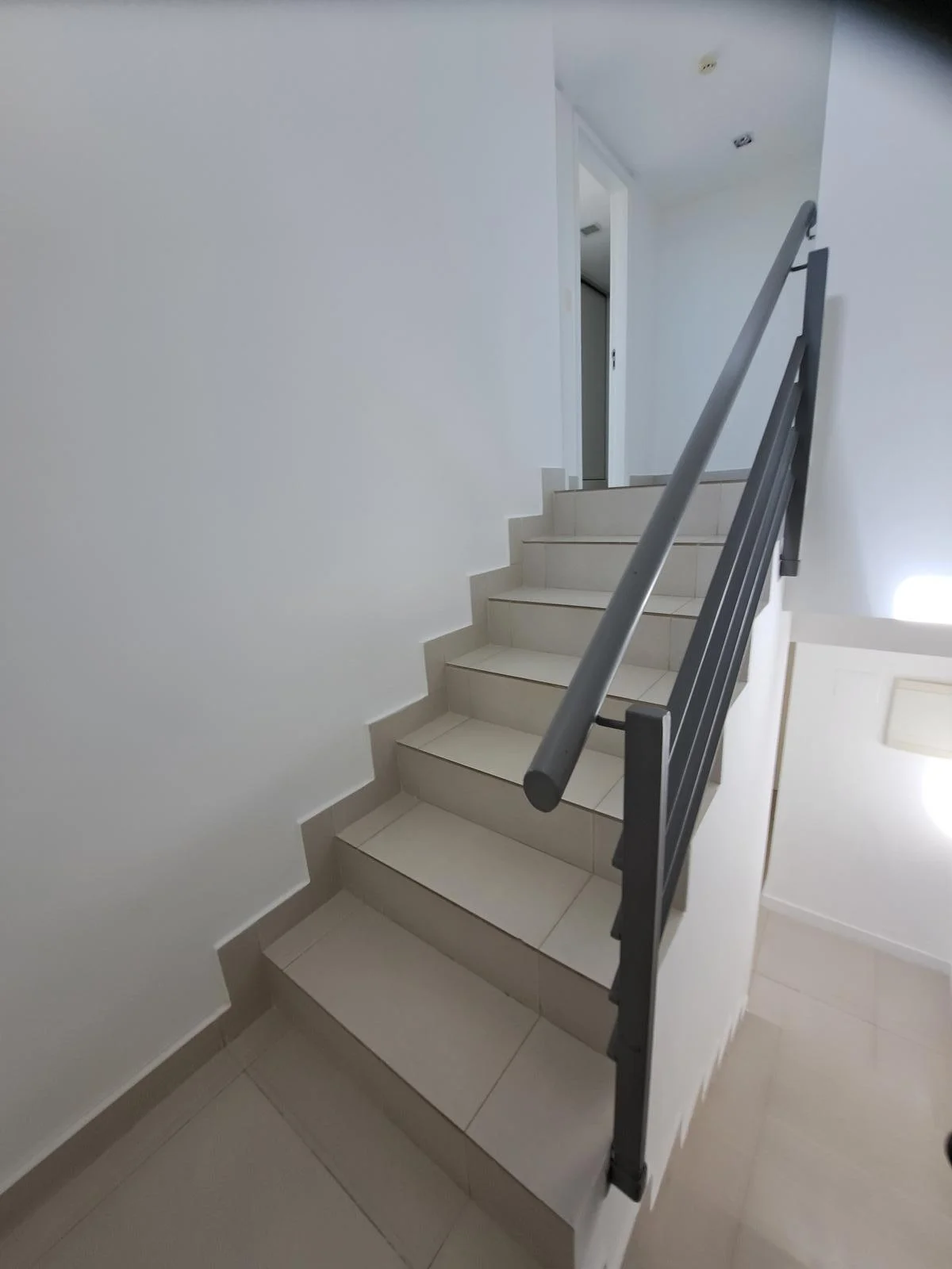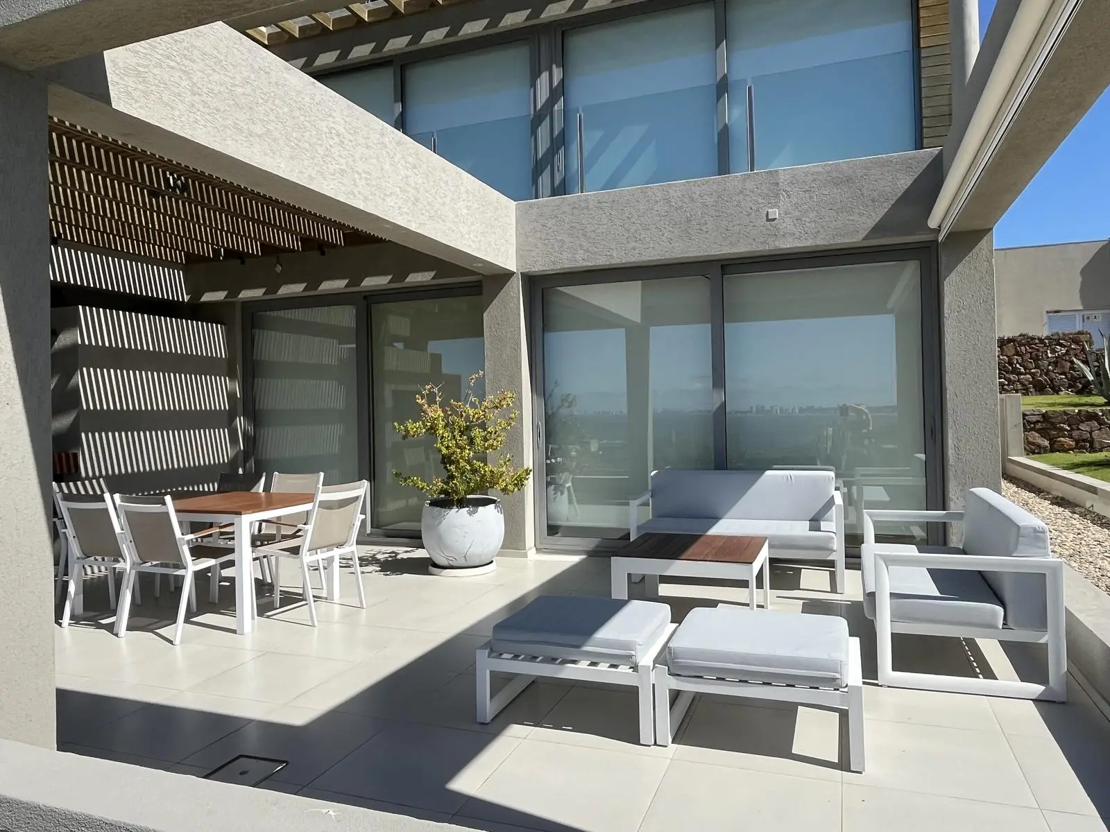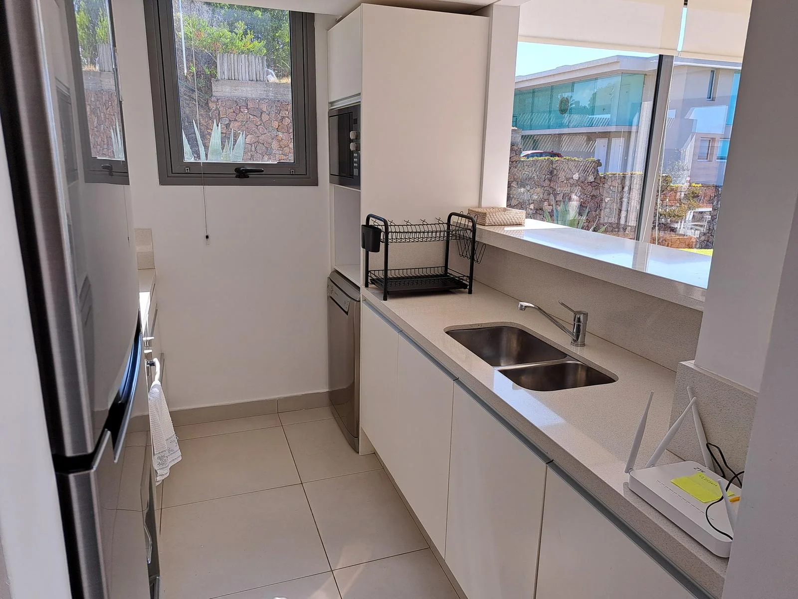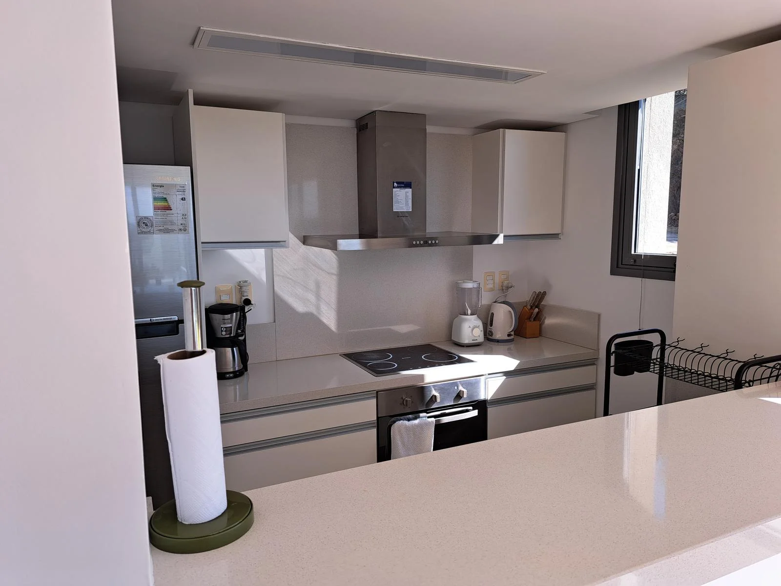 Duplex apartment for temporary rent with two en-suite bedrooms, living-dining room, integrated kitchen, guest bathroom, and a spacious 49 m² terrace with sea view and a private barbecue.