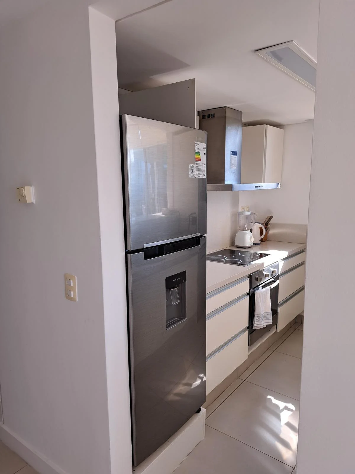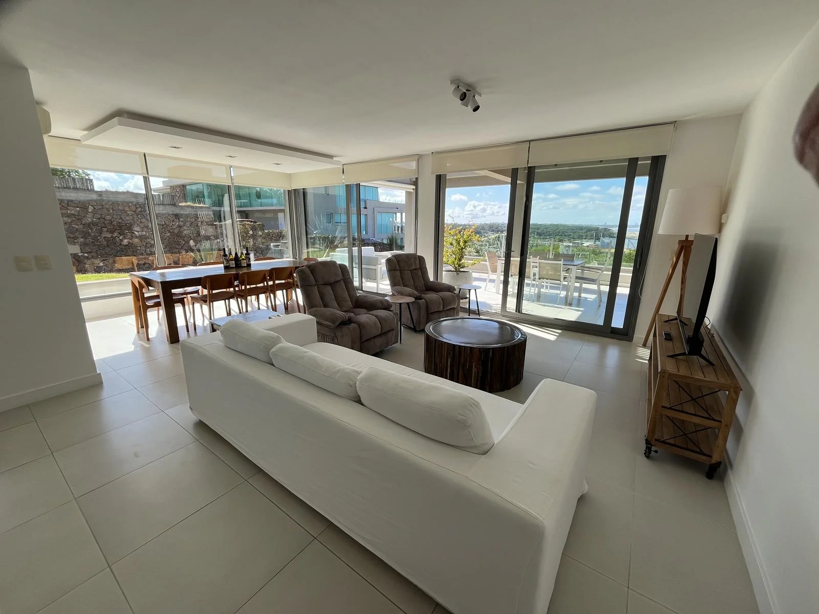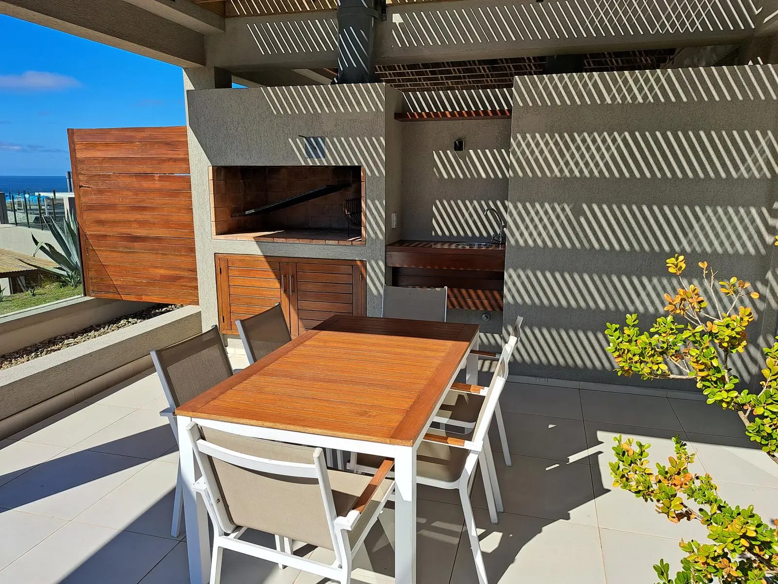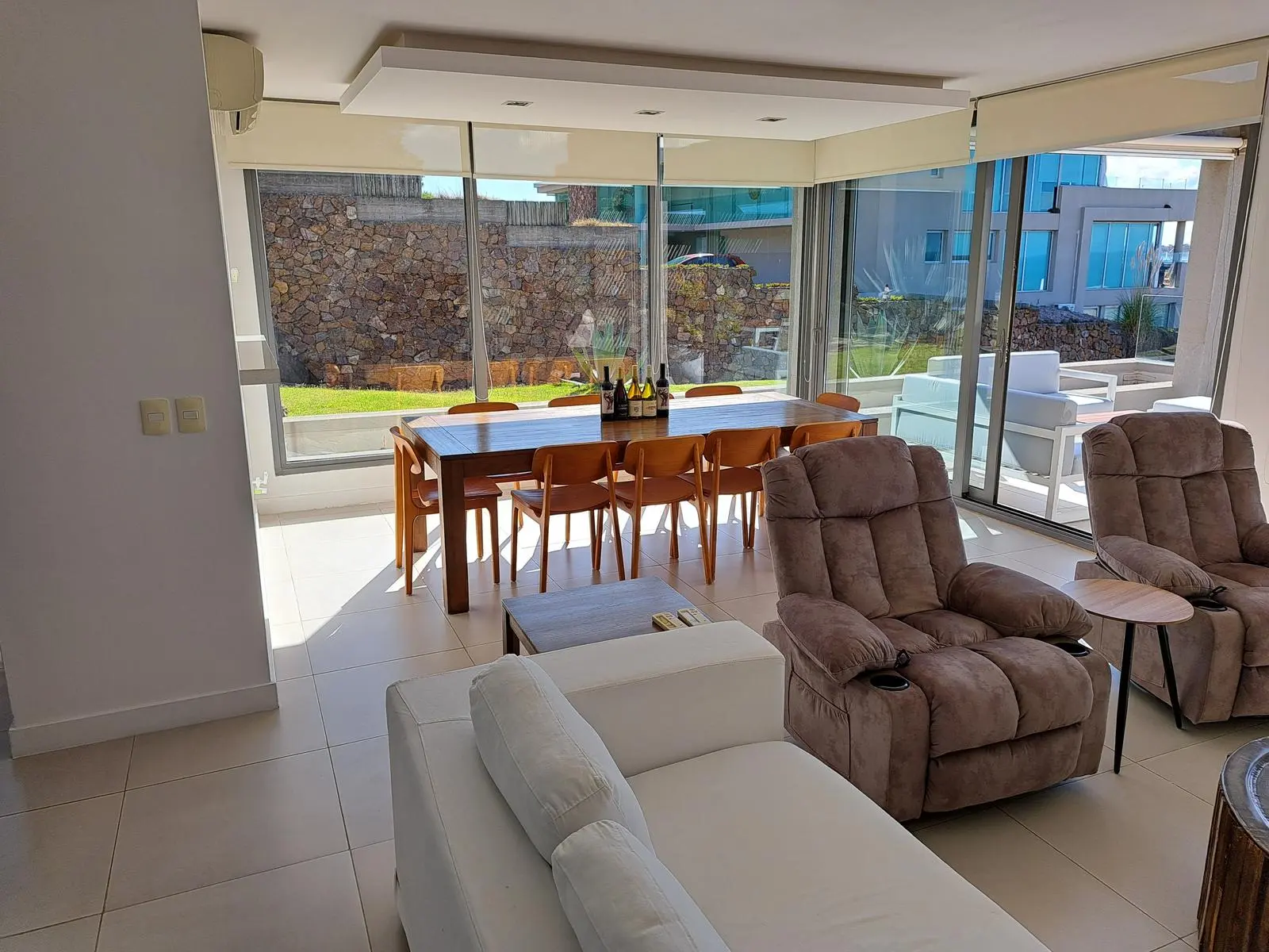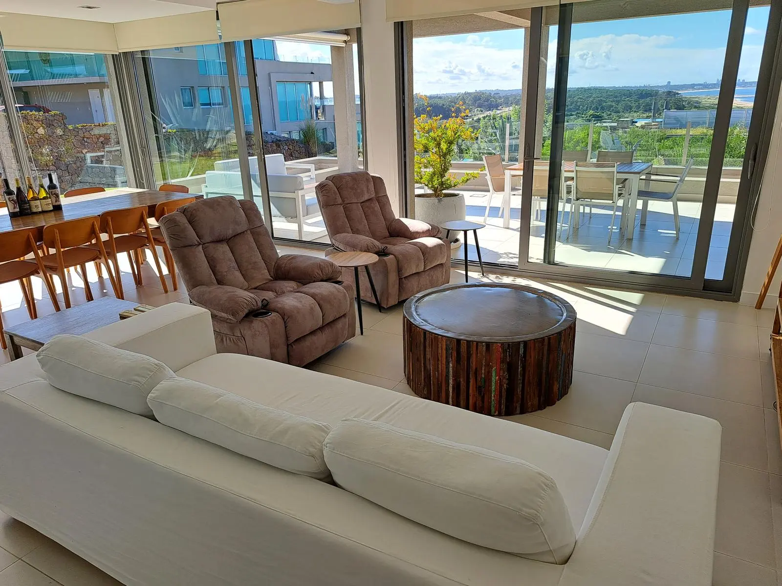 Apartamento duplex en alquiler temporario de dos dormitorios en suite, living comedor, cocina integrada, baño social, amplia terraza de 49 m2 con vista al mar y parrillero propio.