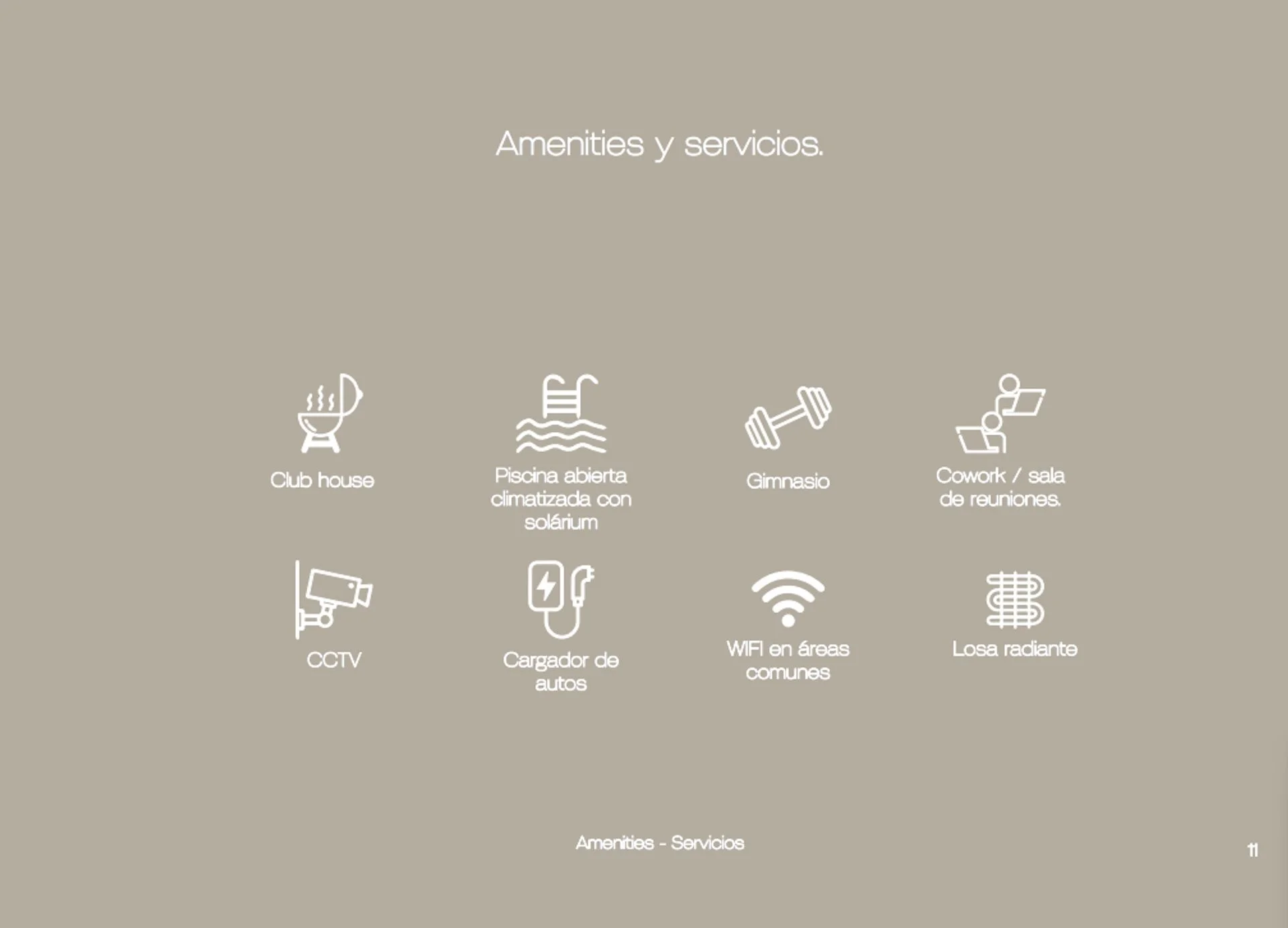 El emprendimiento esta compuesto por un edificio de cuatro pisos, con unidad de planta baja, primer, segundo y tercer piso. El edificio también cuenta con amenities de primer nivel como: club house, piscina exterior climatizada con solarium, gimnasio, entre otras.