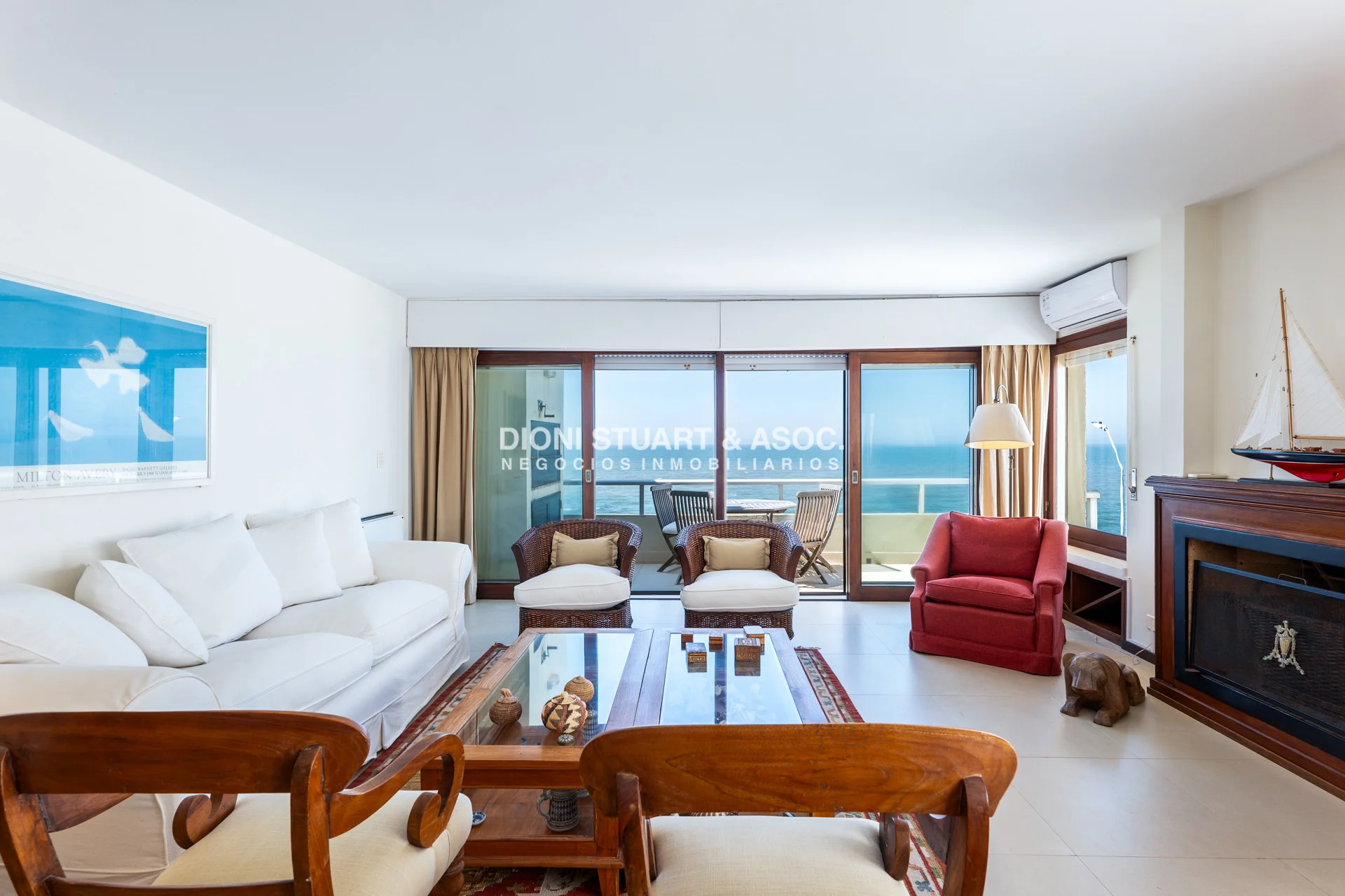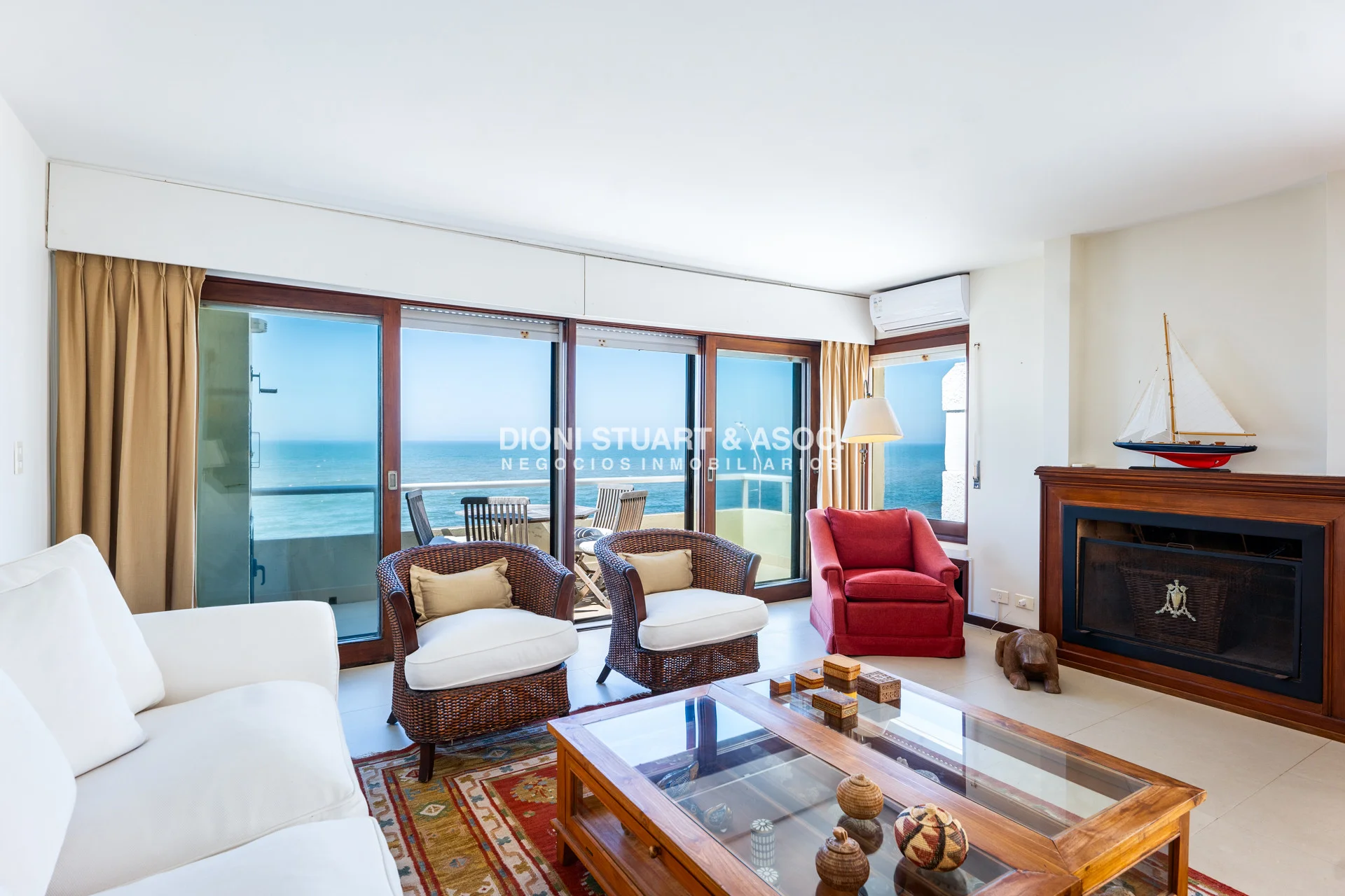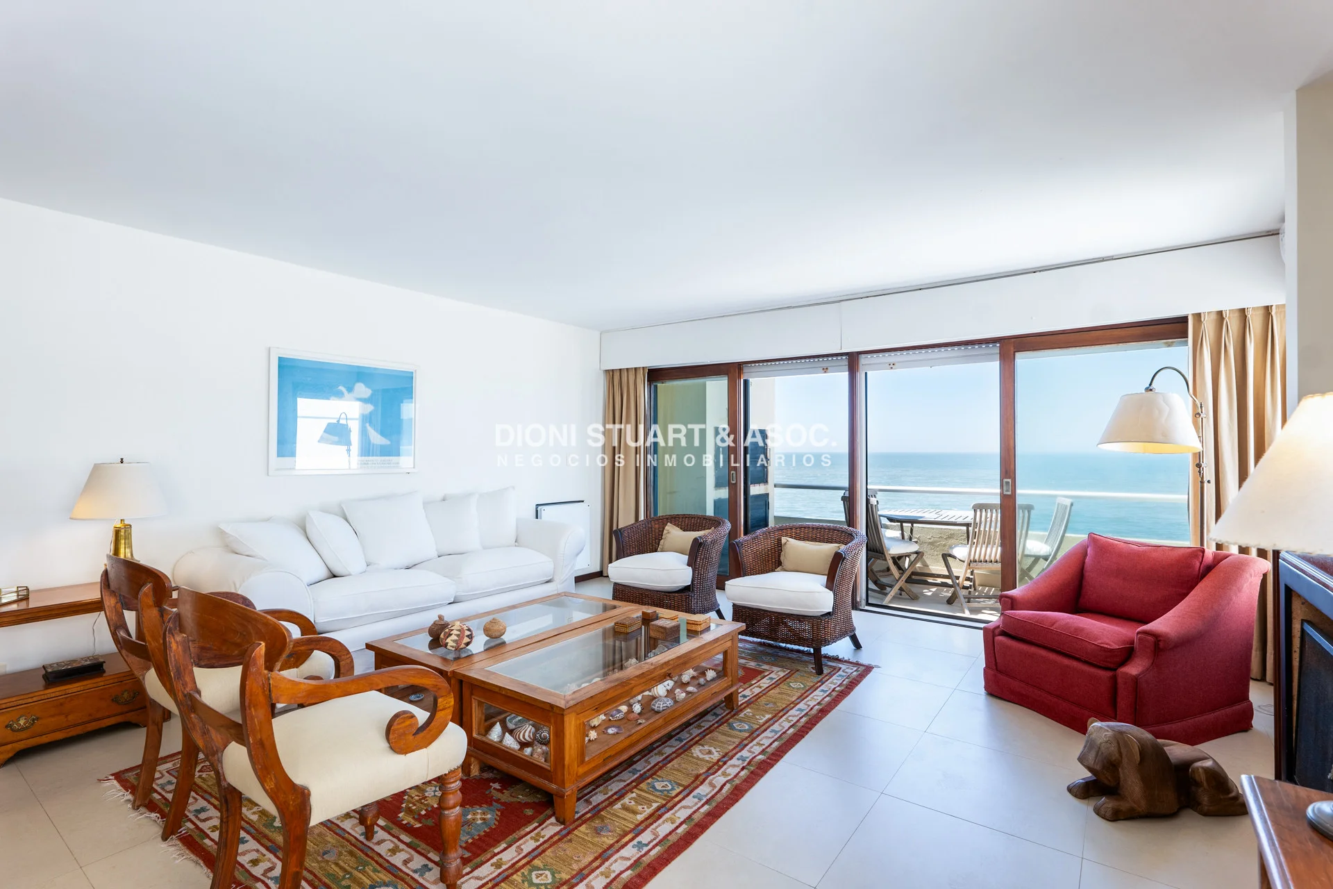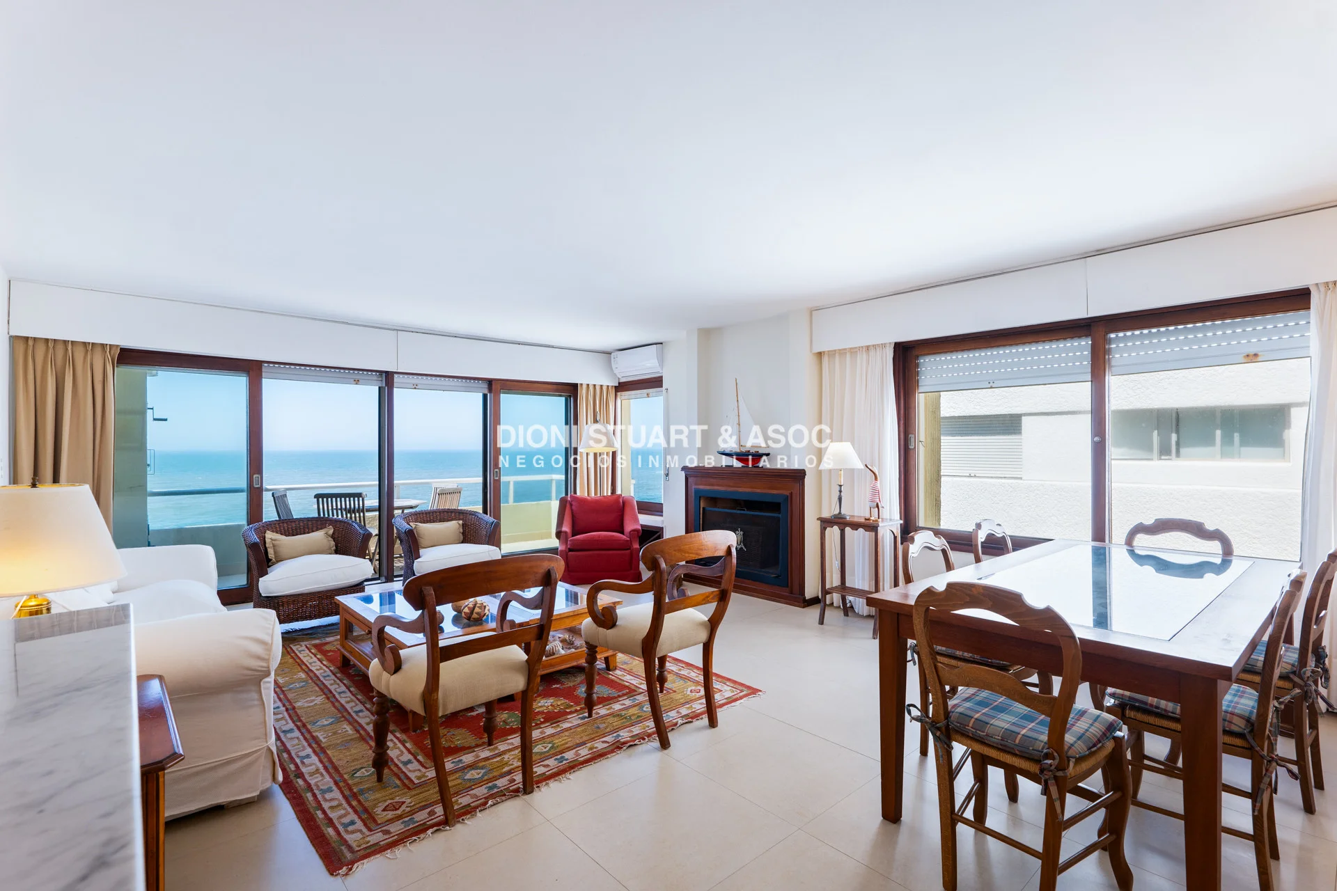 Espectacular departamento semi-piso frente al mar en el edificio Costa Azul en la península. Unidad de 110 m2 totales pasante (recorre el largo del edificio de punta a punta), reciclado completamente al detalle, contando con un amplio living y comedor con estufa hogar, desde donde se accede a un cómodo balcón con parrillero y vista al mar. Su cocina es definida y con lavadero. Hacia el contra-frente del depto encontramos un medio dormitorio con baño (antiguamente era un dormitorio más) y a través de una escalera accedemos a dos dormitorios en suite con placares empotrados. La unidad cuenta con garage. Edificio bien ubicado de poca ocupación con portería.