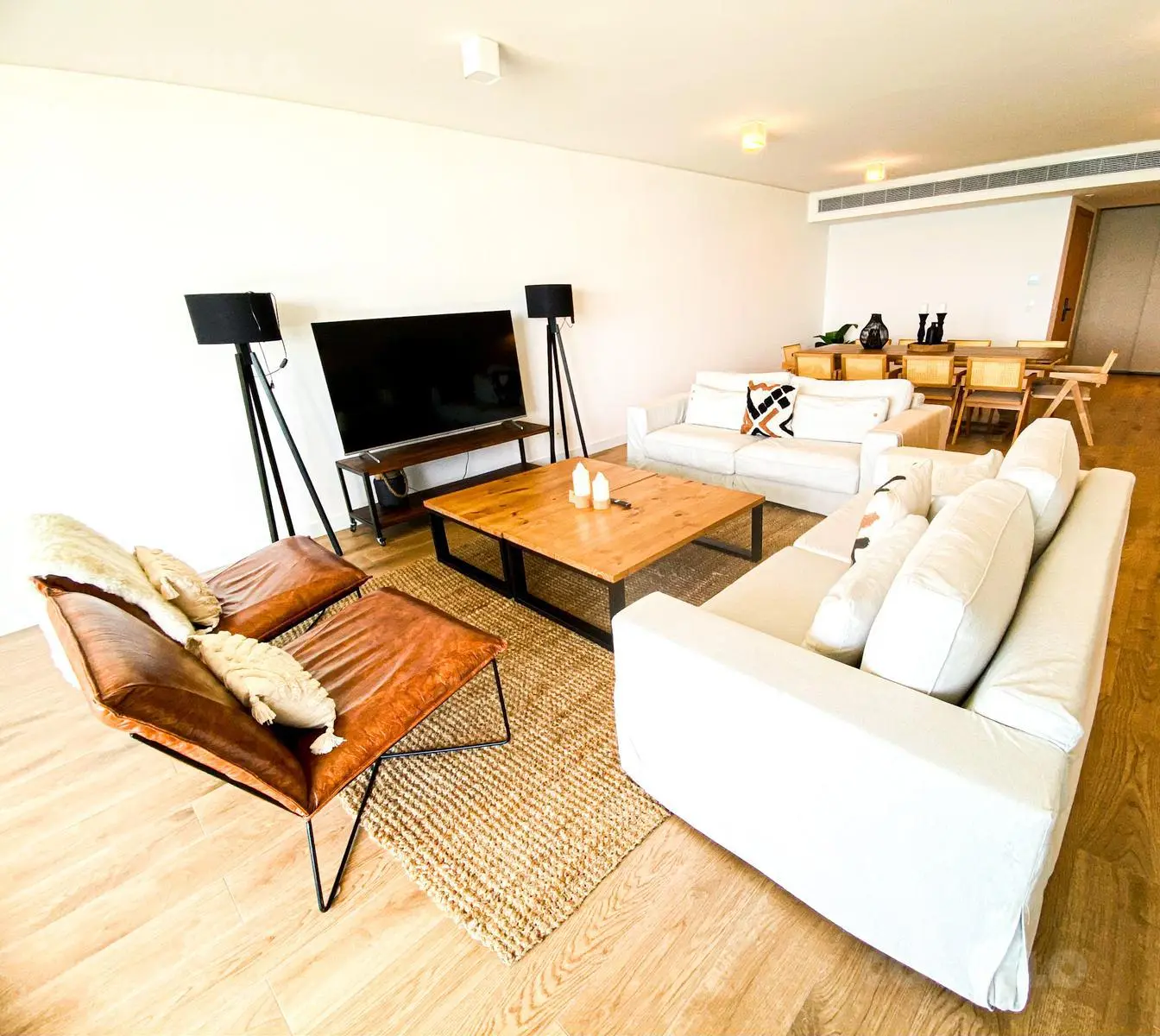 Amplio living room con vista directa al océano y espacioso balcón terraza.
