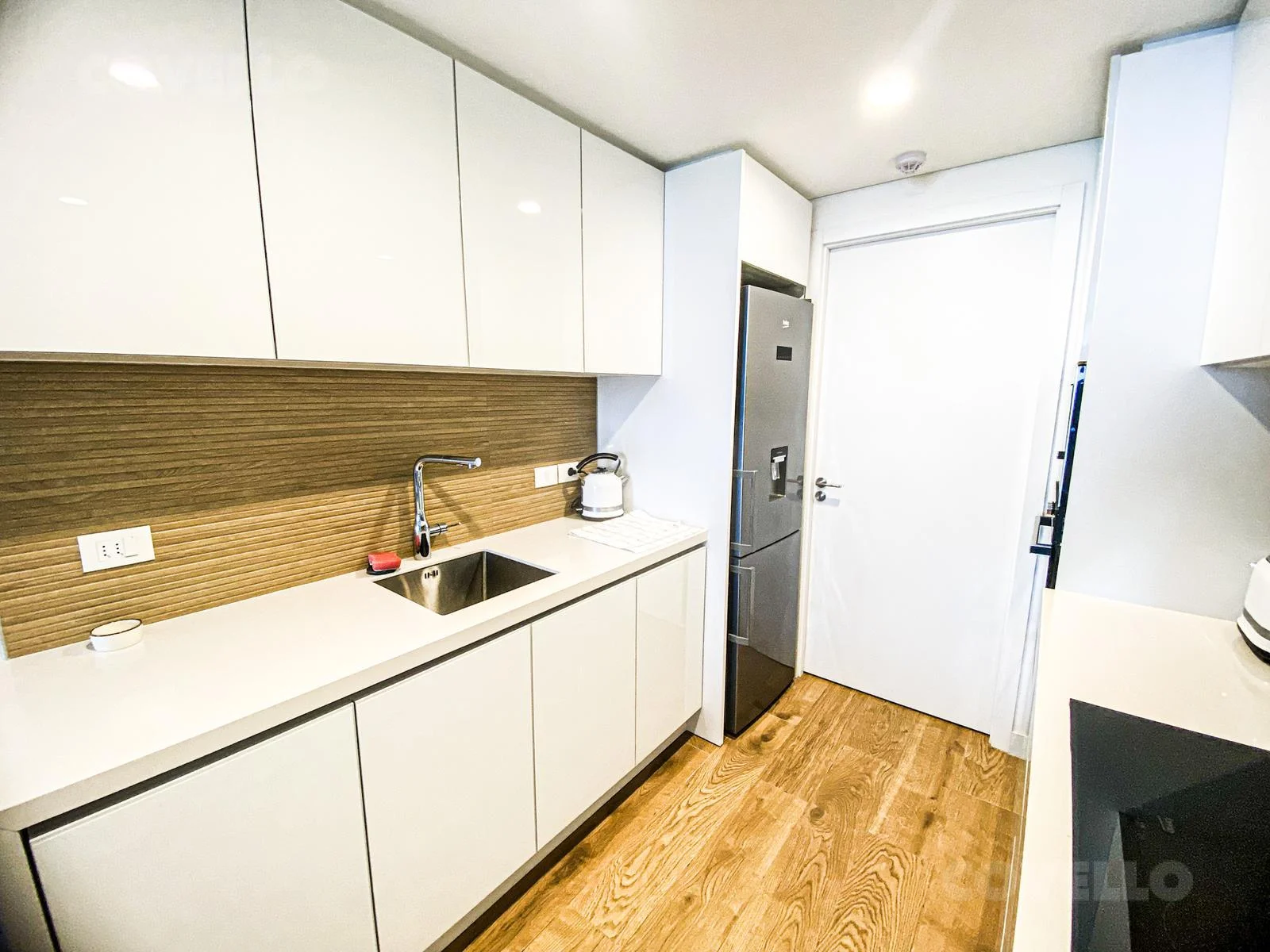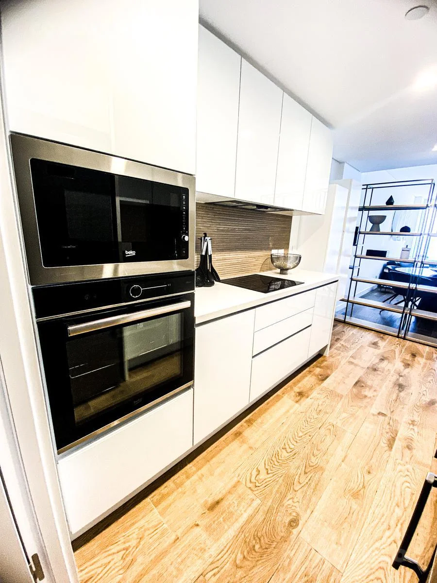 Espaciosa cocina con doble mesada de neolith, equipada con electrodomésticos de cocina BEKO y modernos placares.