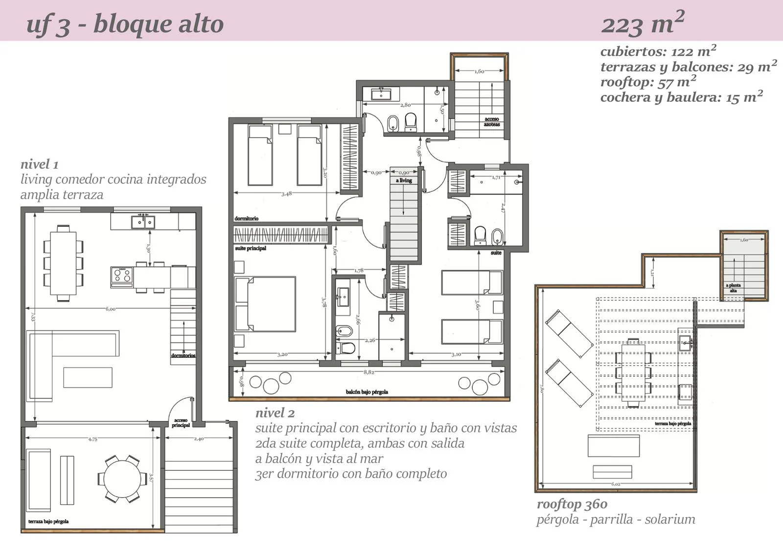 Rooftops con solárium, parrilla y pérgola de sombra.
