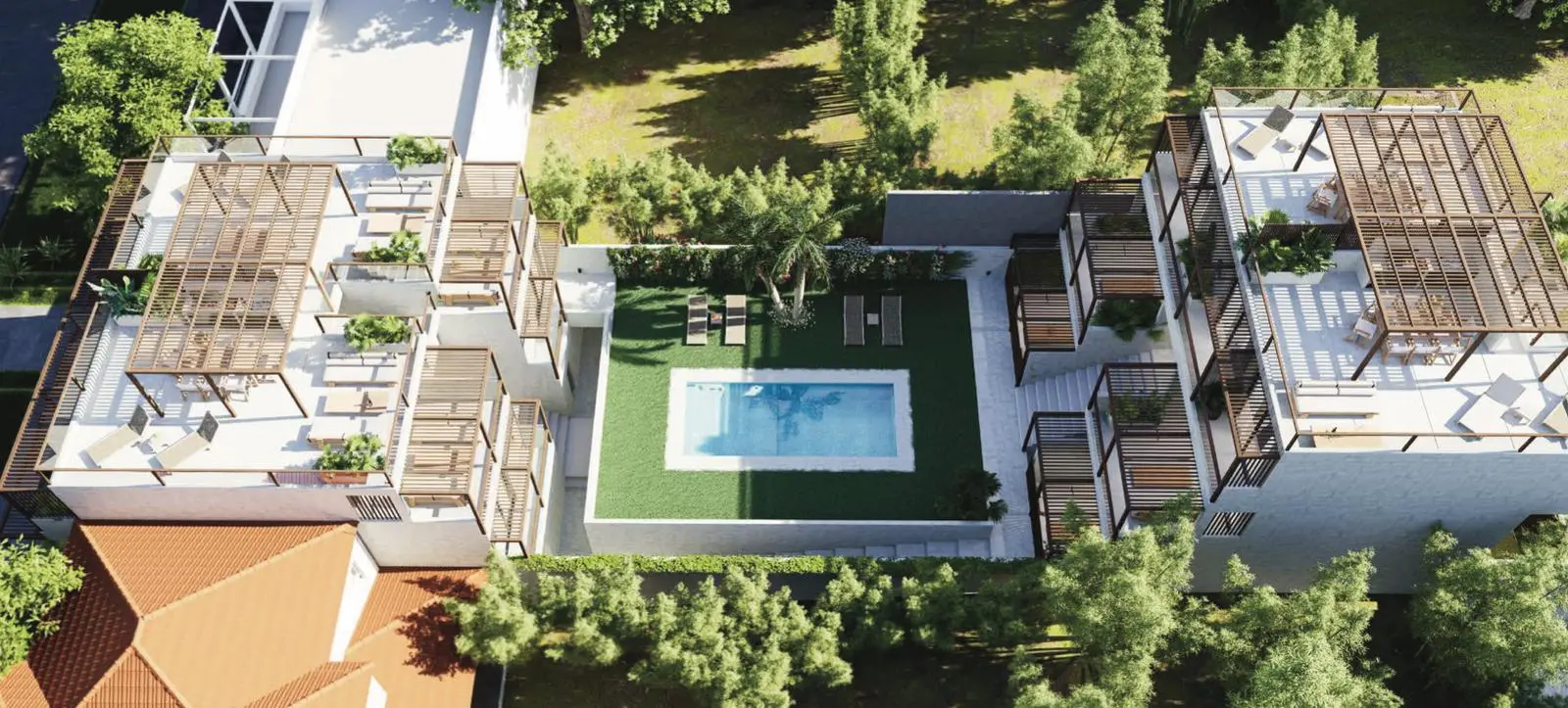 Jardín central con pileta, solárium y estacionamiento privado cubierto.