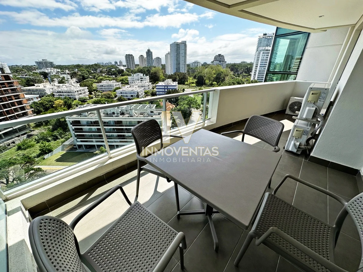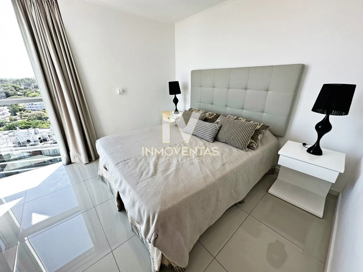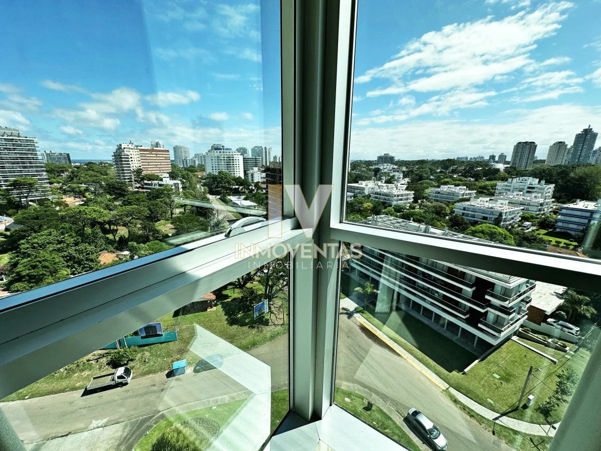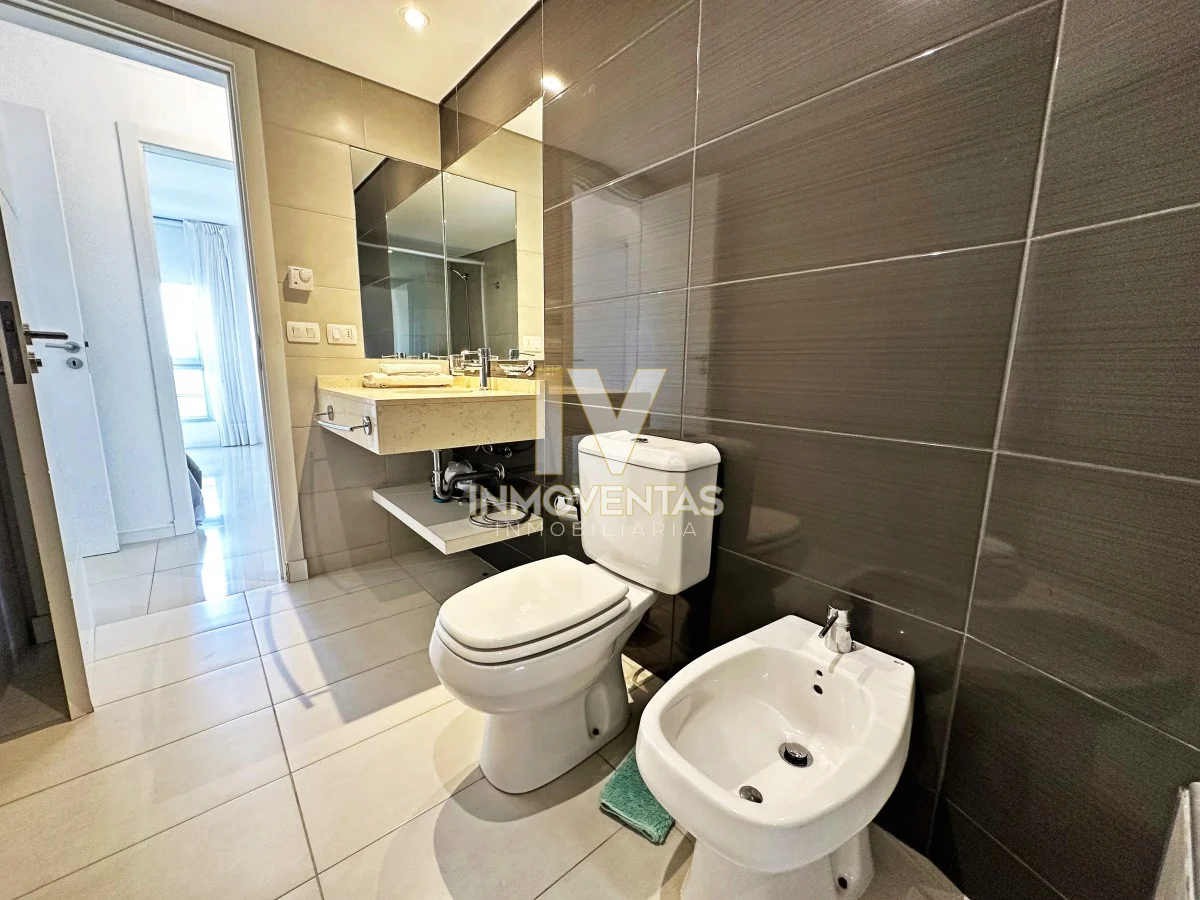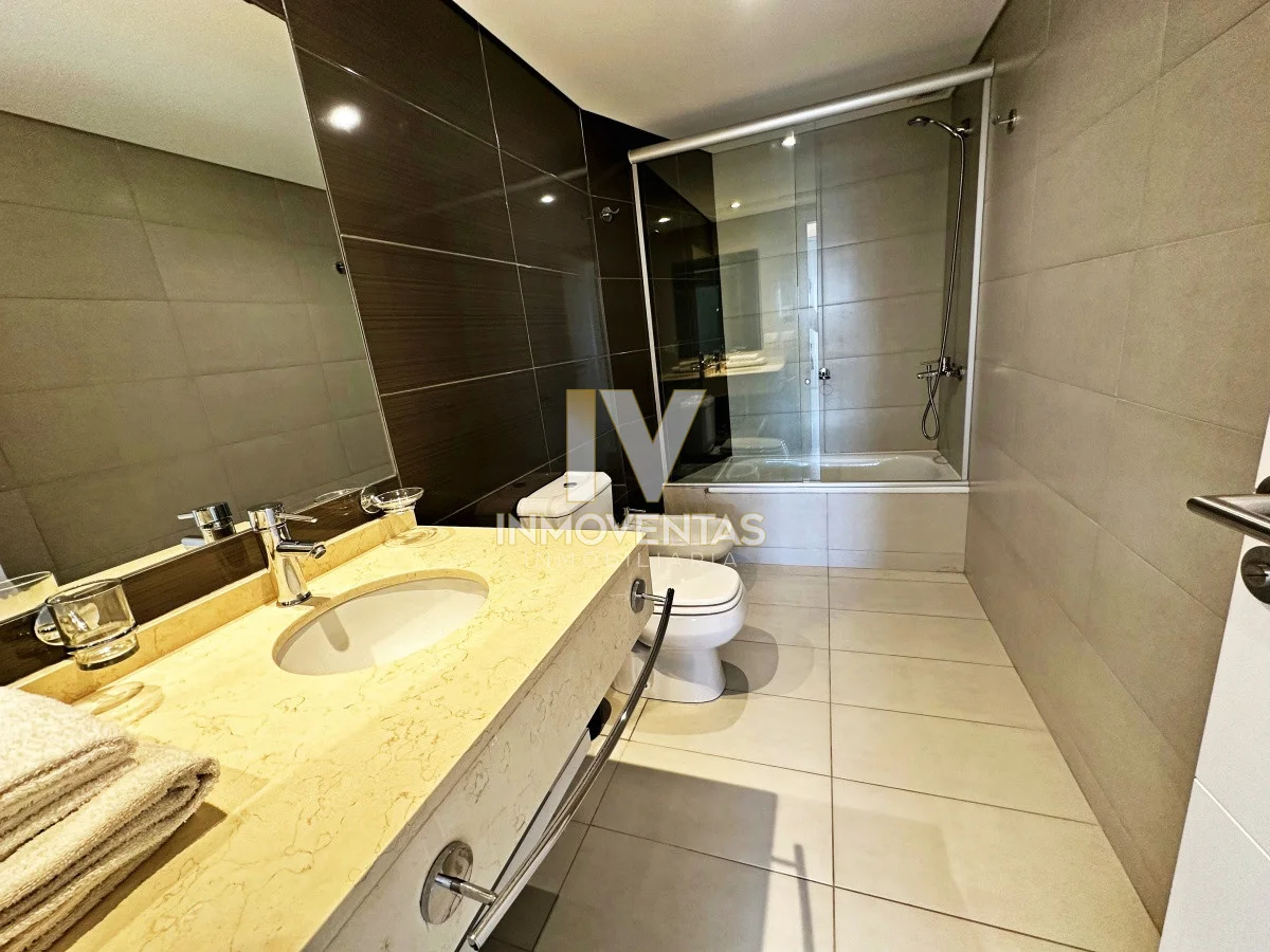 Piso alto con excelente posición solar, vistas apaisada a mansa y el bosque. 2 dormitorios, 2 baños, living comedor, cocina integrada, amplio balcón. Cochera en subsuelo con espacio para baulera. Equipado.