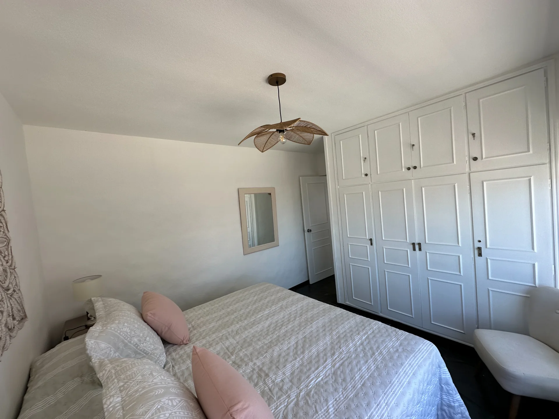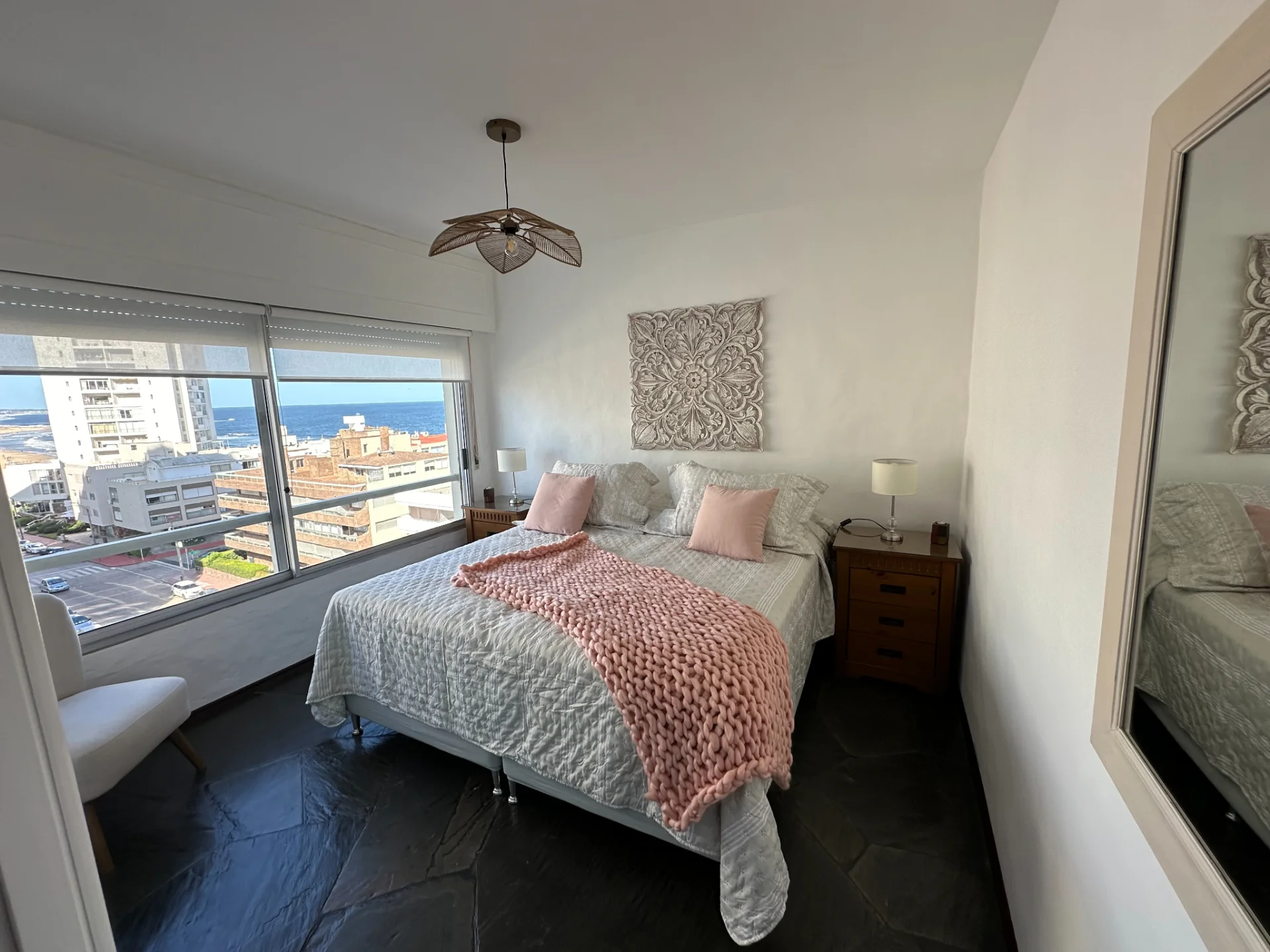 El principal con 1 cama King o 2 single. 2 Mesas de luz, 2 lámparas de mesa. Espejo.