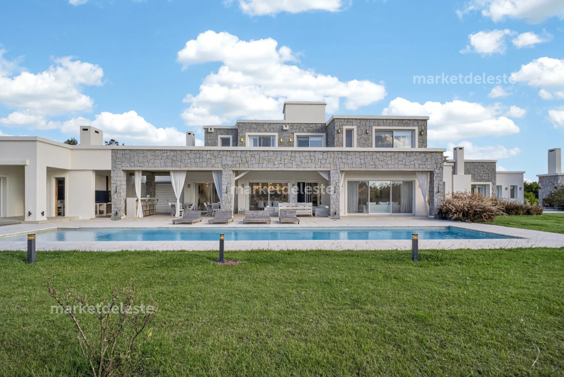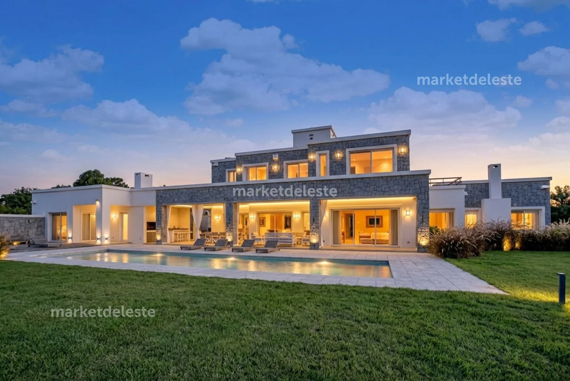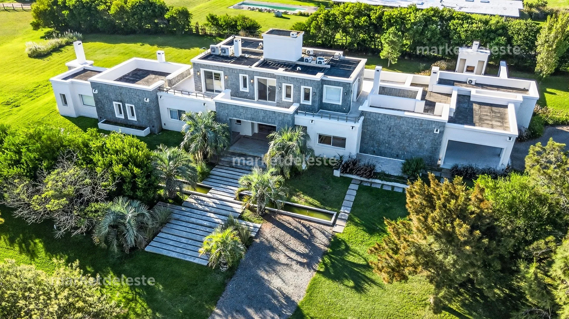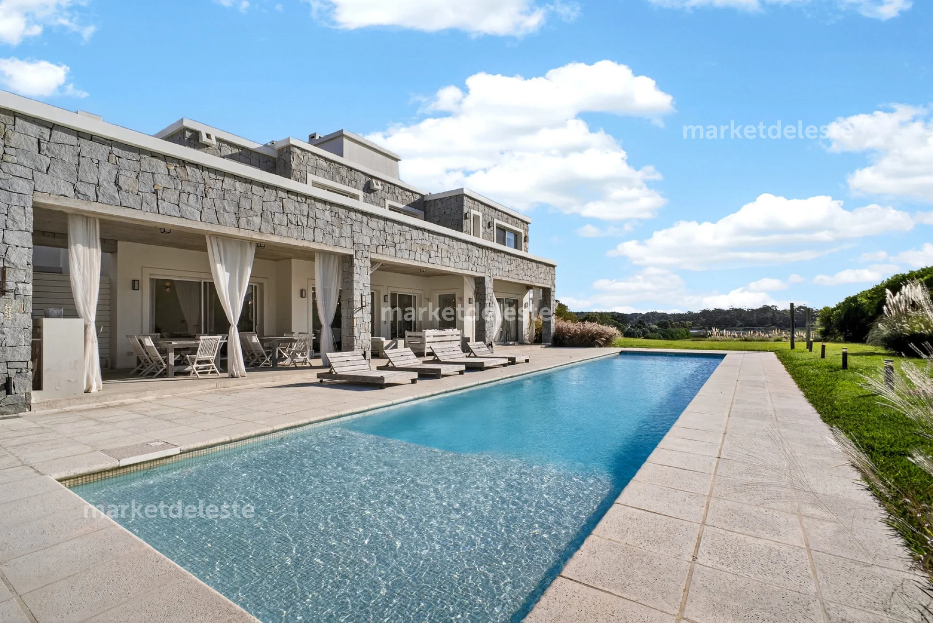 Ubicada en un exclusivo barrio cerrado sobre Ruta 104, en la zona de Manantiales, esta espectacular residencia de piedra se destaca por su arquitectura imponente, sus grandes aleros y su perfecta integración con el entorno natural.