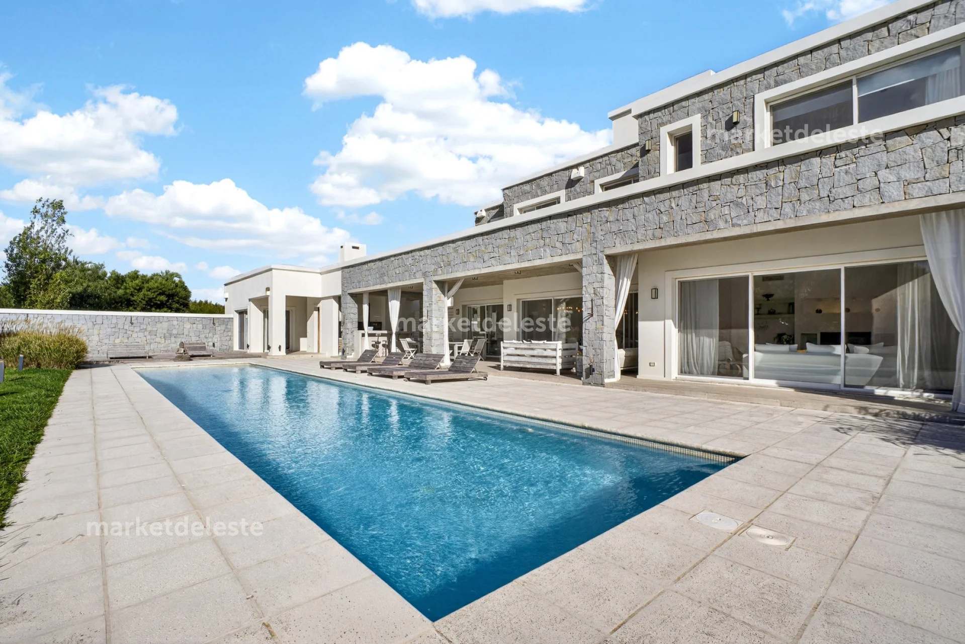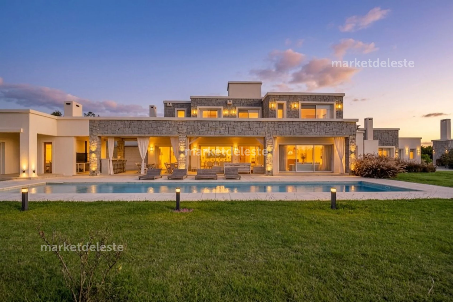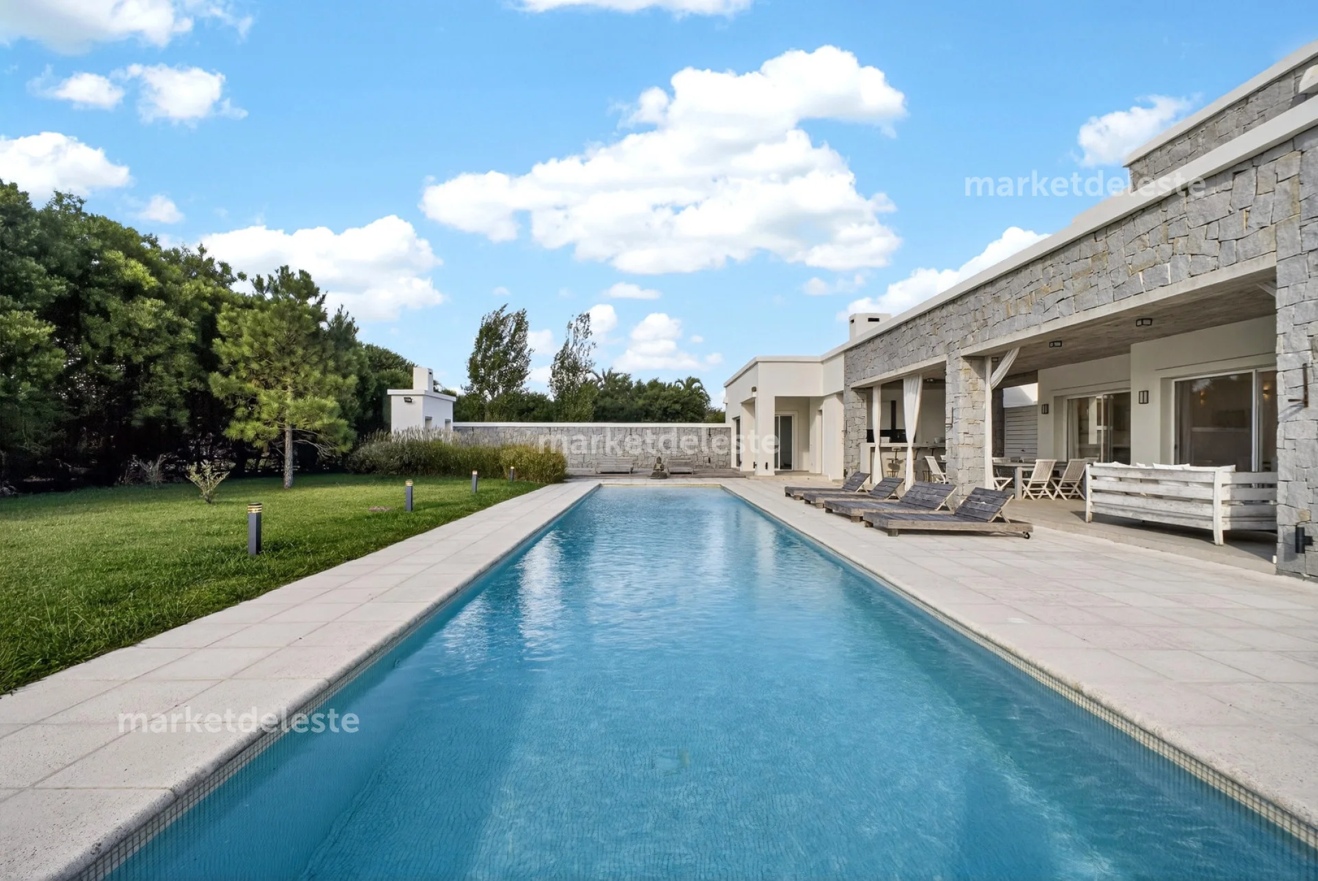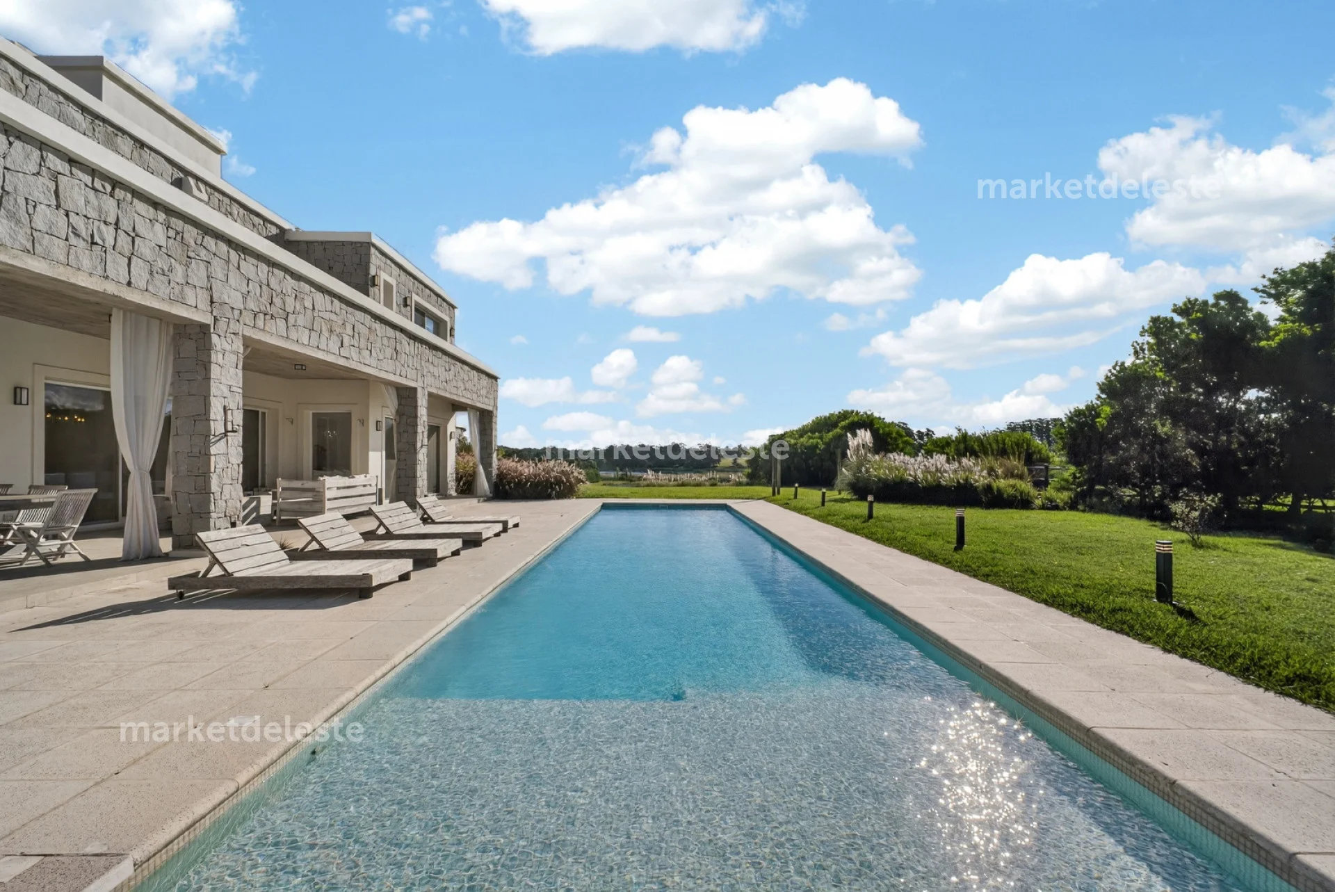 Ubicada en un exclusivo barrio cerrado sobre Ruta 104, en la zona de Manantiales, esta espectacular residencia de piedra se destaca por su arquitectura imponente, sus grandes aleros y su perfecta integración con el entorno natural.