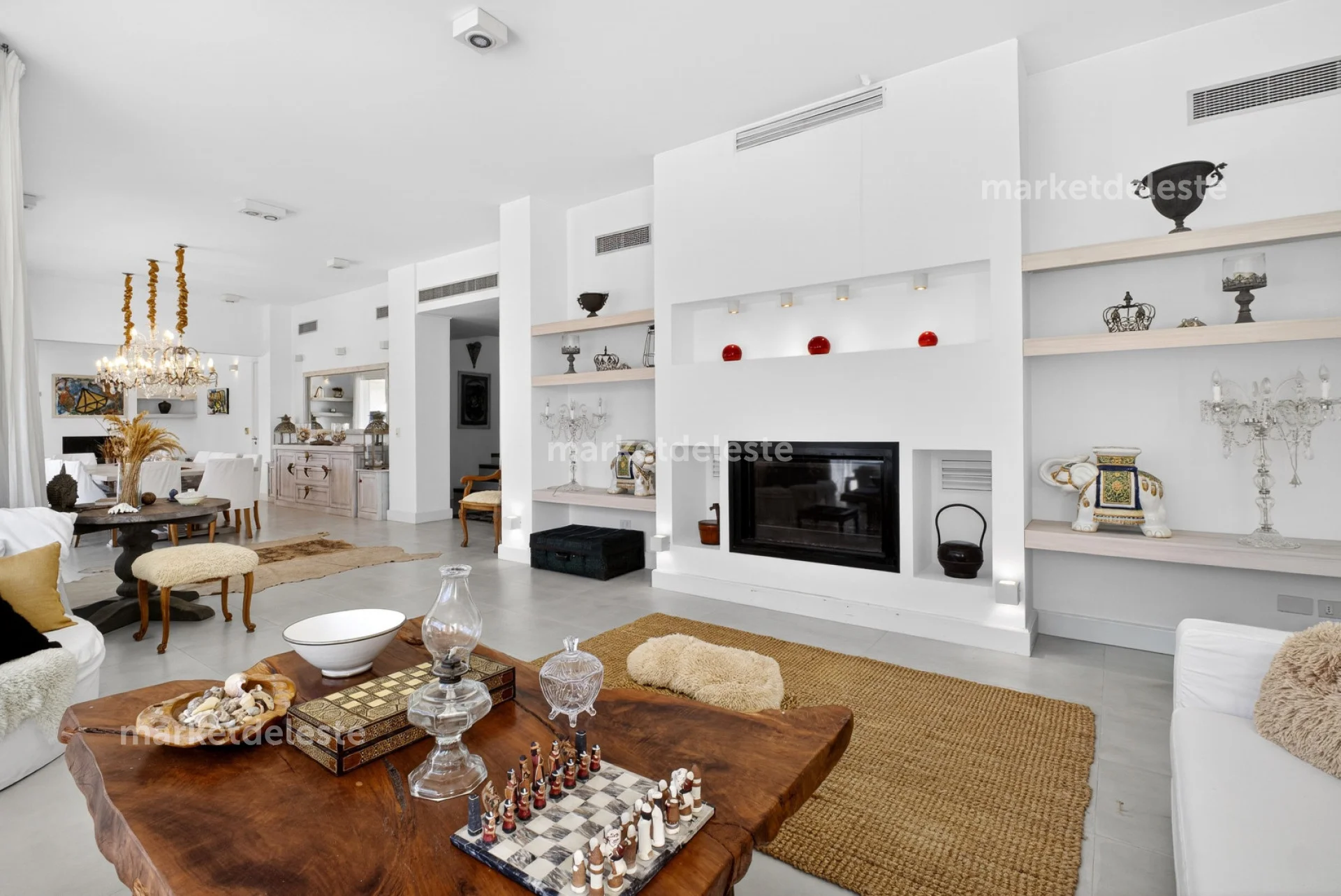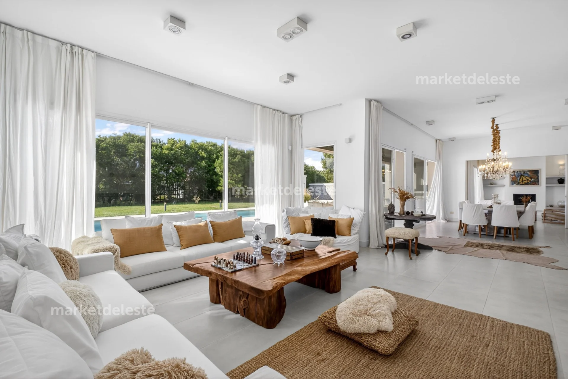 En su interior se caracteriza por ambientes amplios, cálidos y muy luminosos, con excelente calidad constructiva y cuidada decoración. Cuenta con 6 dormitorios en suite, incluyendo una gran master suite con hidromasaje. Dos de las suites se ubican en planta baja y cuatro en planta alta, brindando una distribución cómoda y funcional tanto para la vida familiar como para recibir invitados.