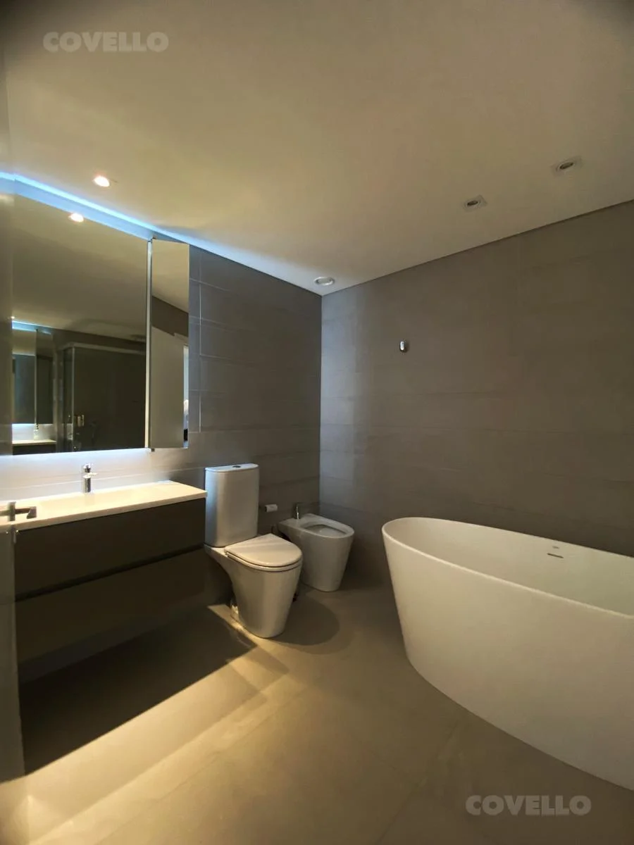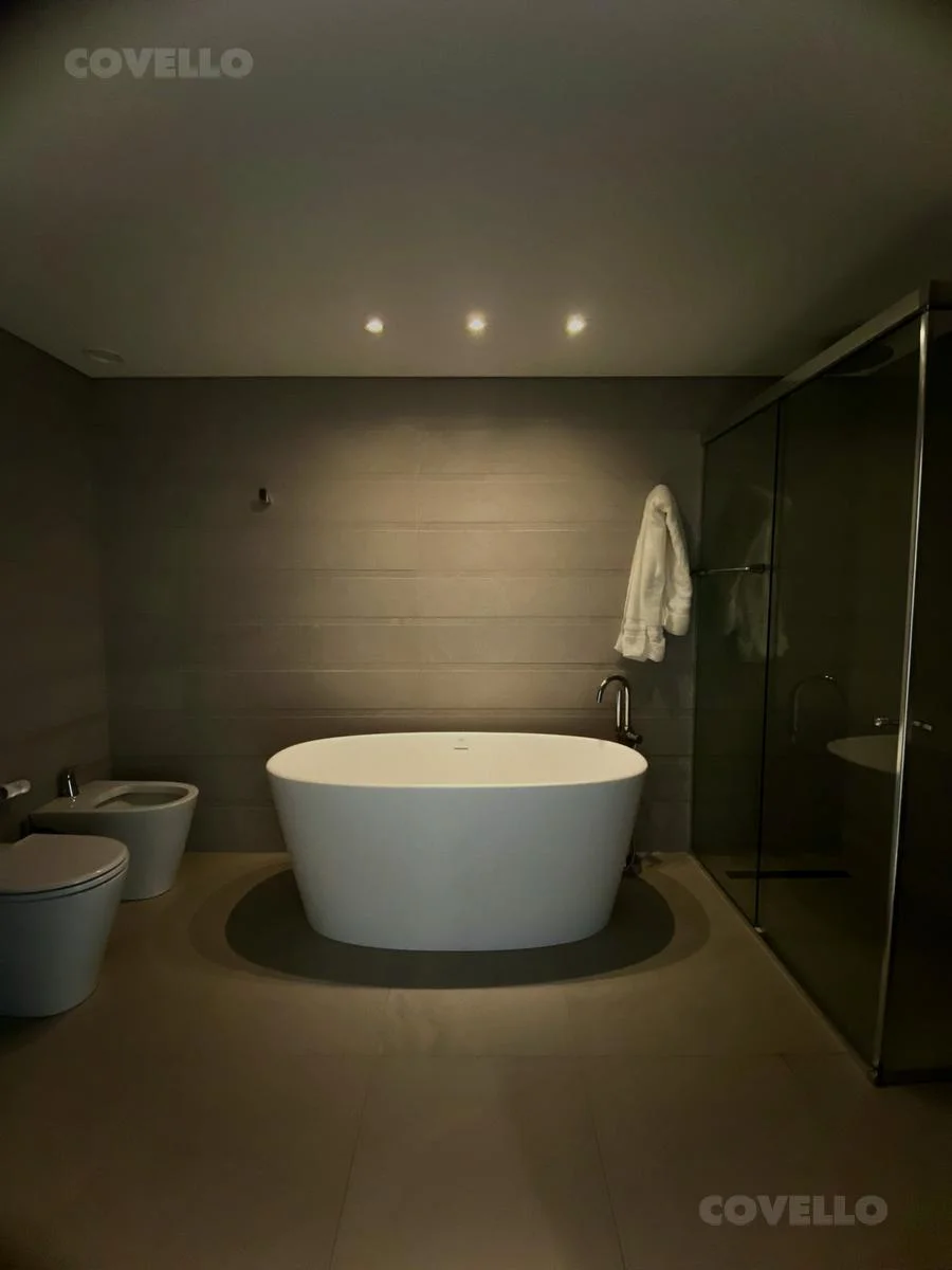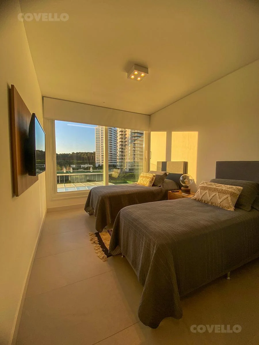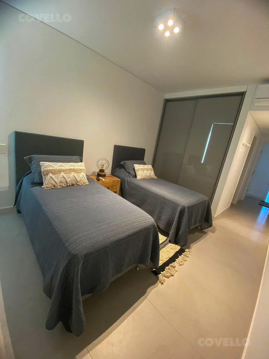 Dispone de 3 dormitorios, 3 baños, cocina, living comedor, y terraza con hermosa vista hacia la playa brava. El baño del dormitorio principal es muy amplio y cuenta con una gran bañera . El apartamento en general está decorado de forma armoniosa.