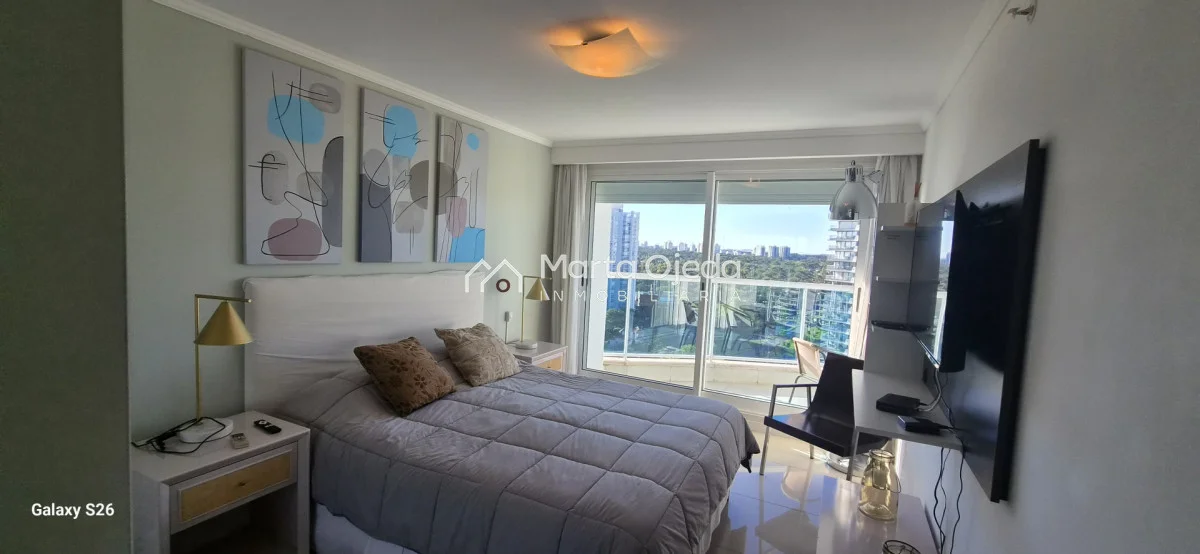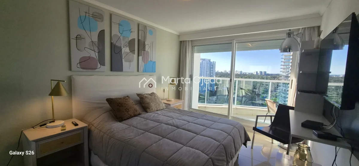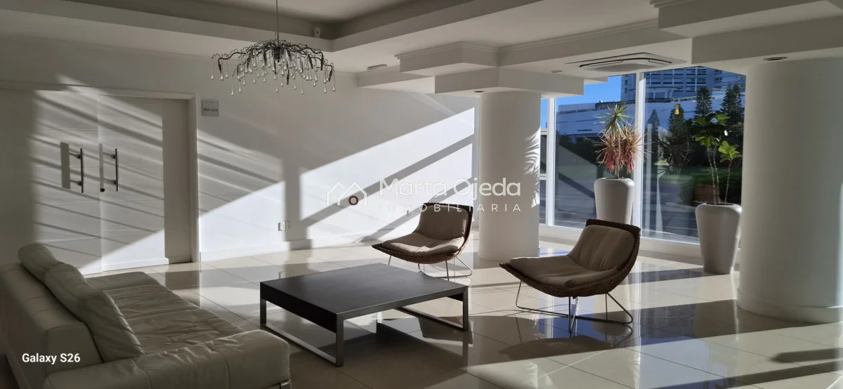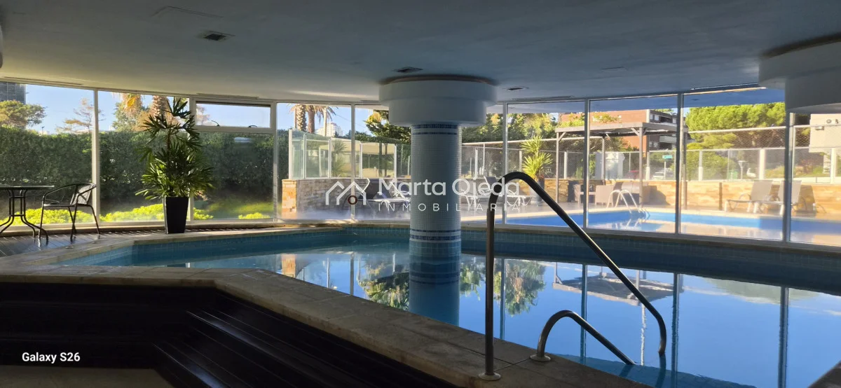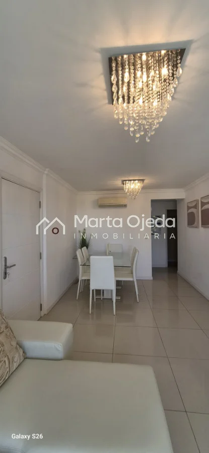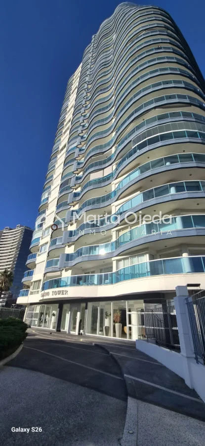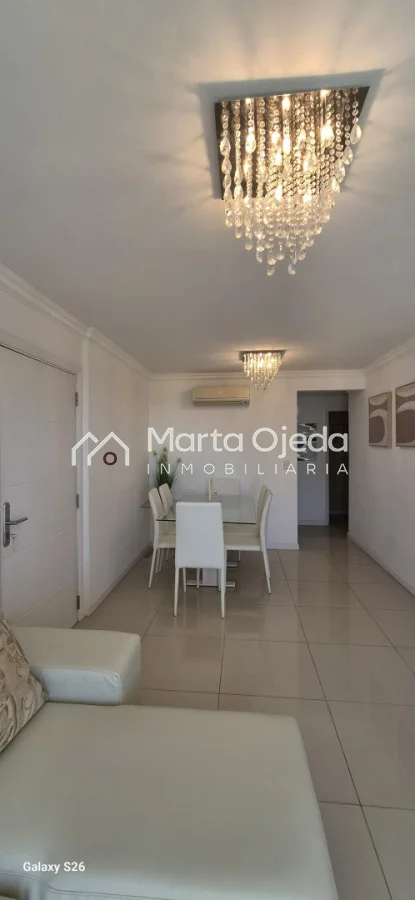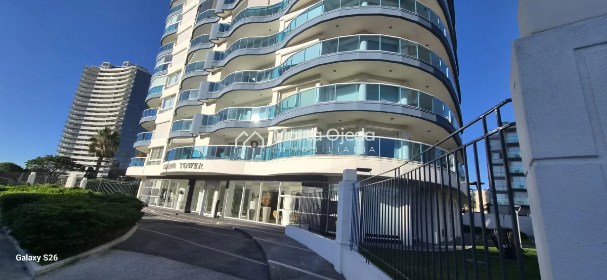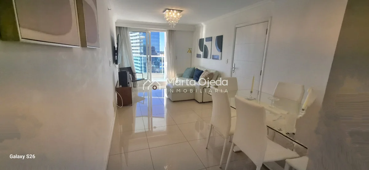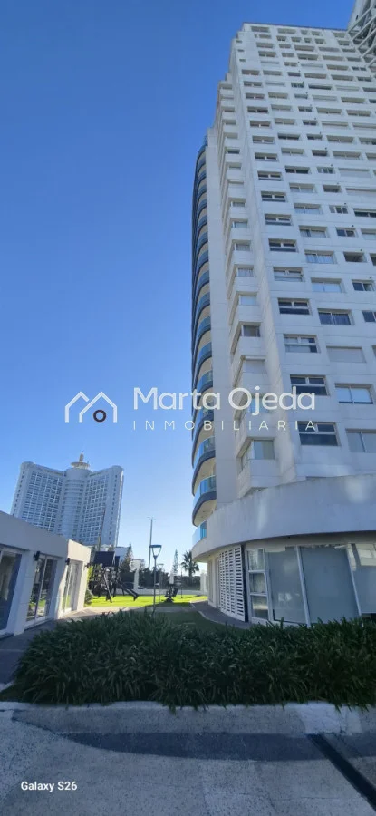 Apartamento en piso alto , living-comedor con salida a terraza con parrillero , dos dormitorios en suite , cocina definida , baño social , garaje. El edificio cuenta con dos piscinas climatizadas, una cerrada. Amplias barbacoas , salón de uso múltiple, cancha de tenis, sauna, juegos infantiles, sala cine, gimnasio, servicio de mucama , servicio de playa .