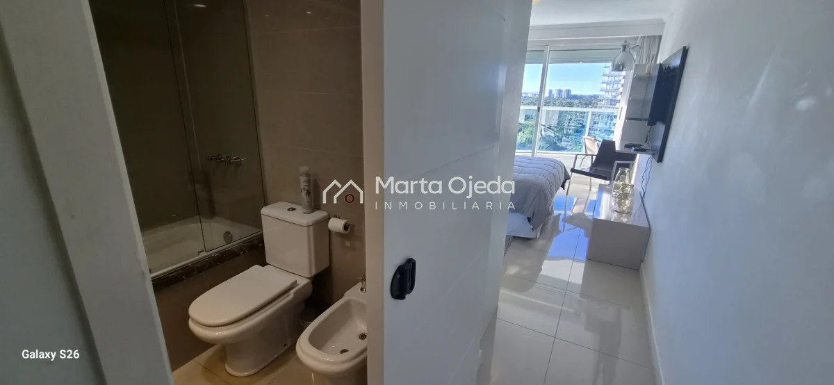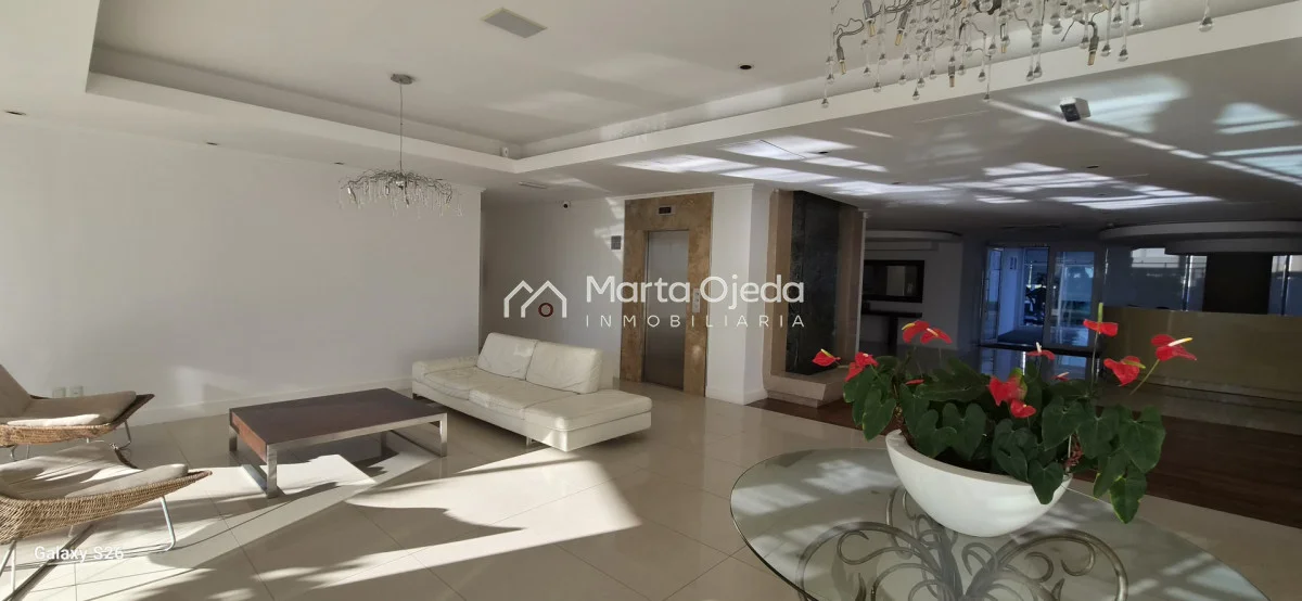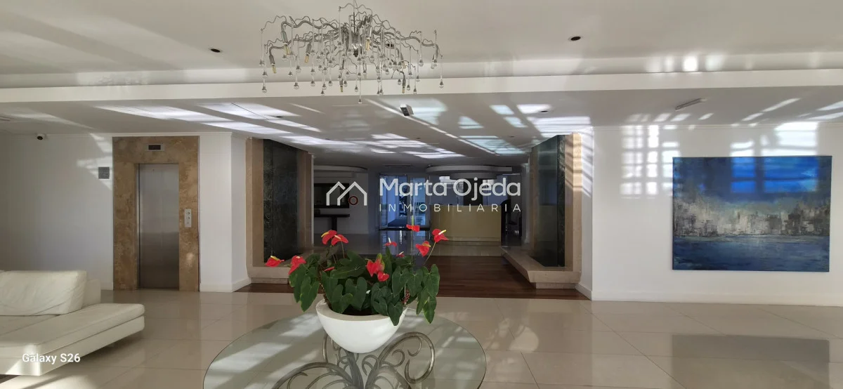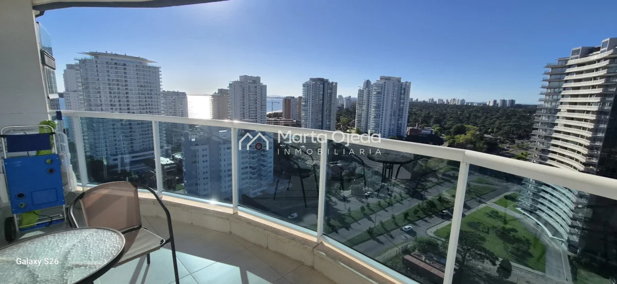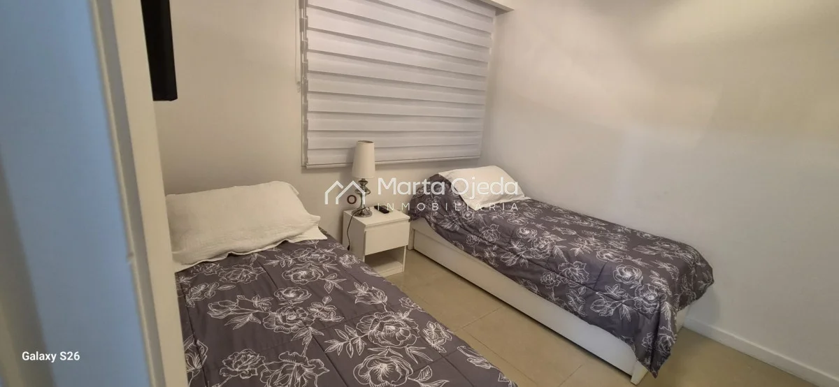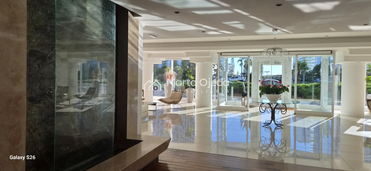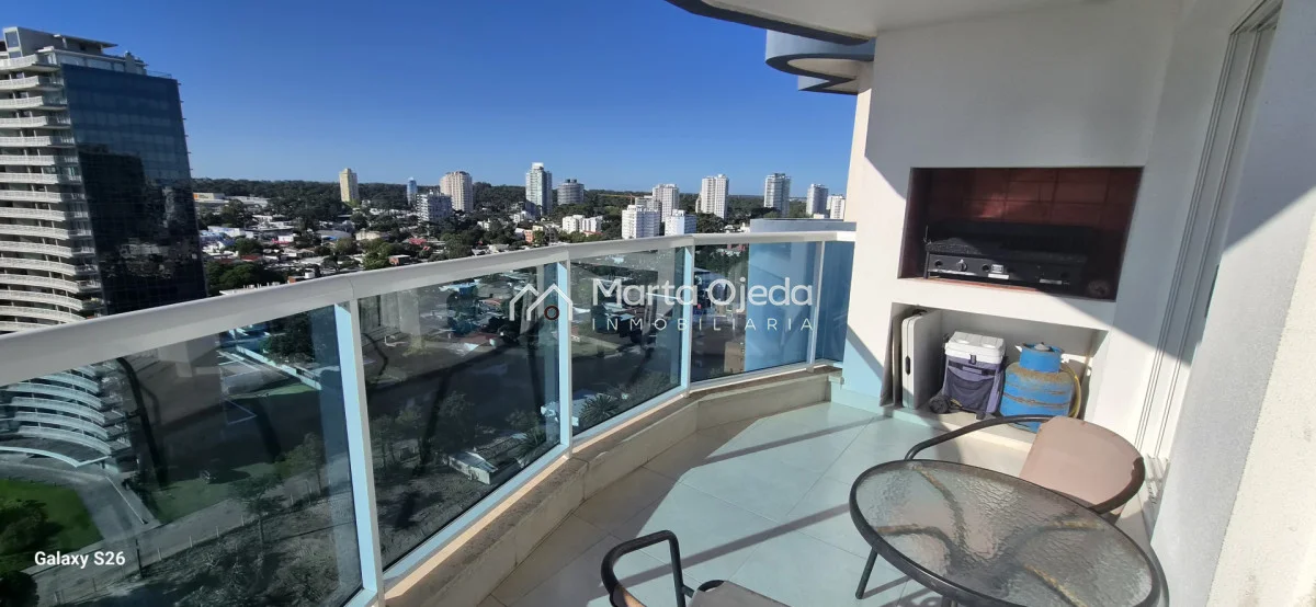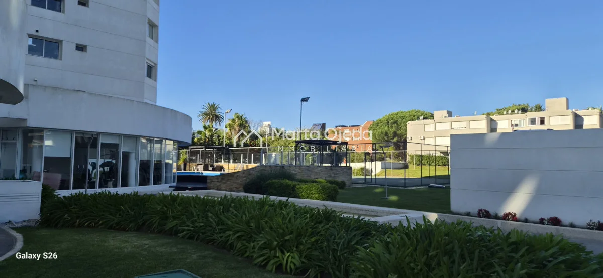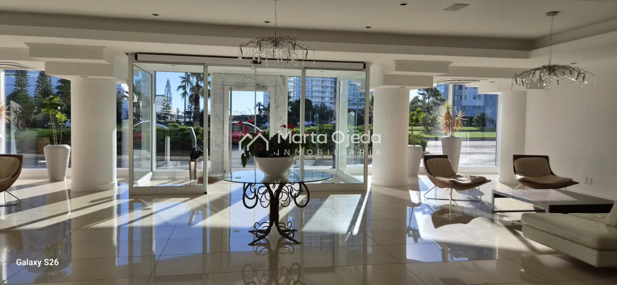 Apartamento en piso alto , living-comedor con salida a terraza con parrillero , dos dormitorios en suite , cocina definida , baño social , garaje. El edificio cuenta con dos piscinas climatizadas, una cerrada. Amplias barbacoas , salón de uso múltiple, cancha de tenis, sauna, juegos infantiles, sala cine, gimnasio, servicio de mucama , servicio de playa .