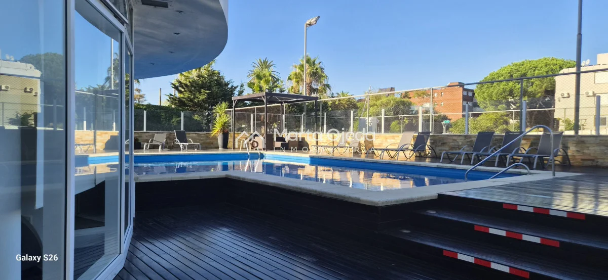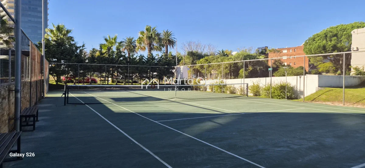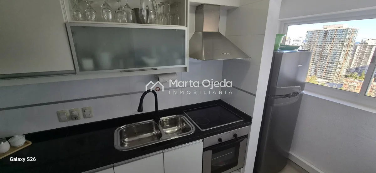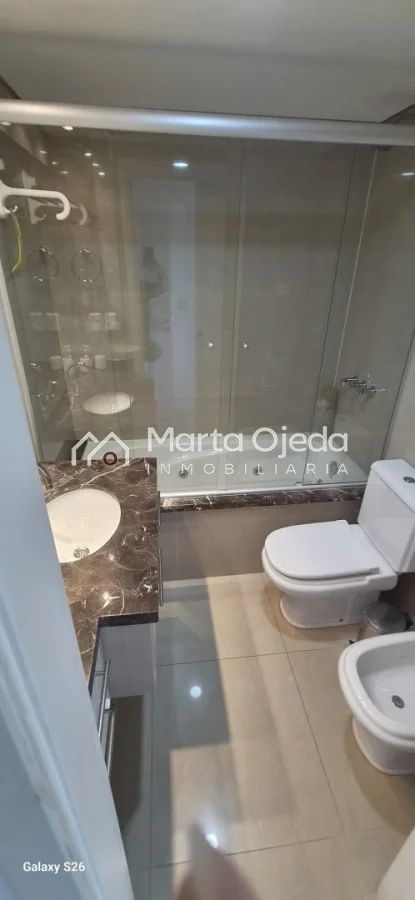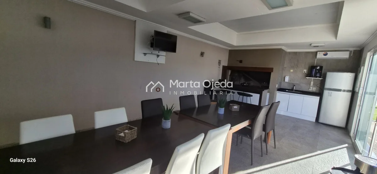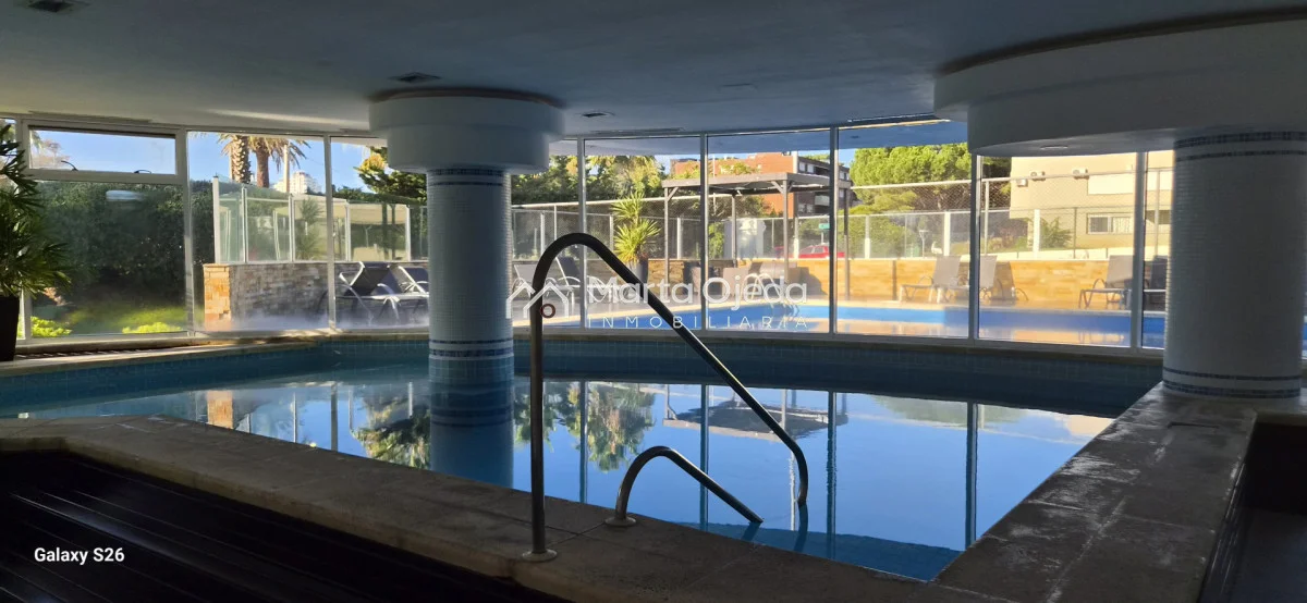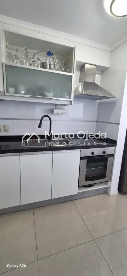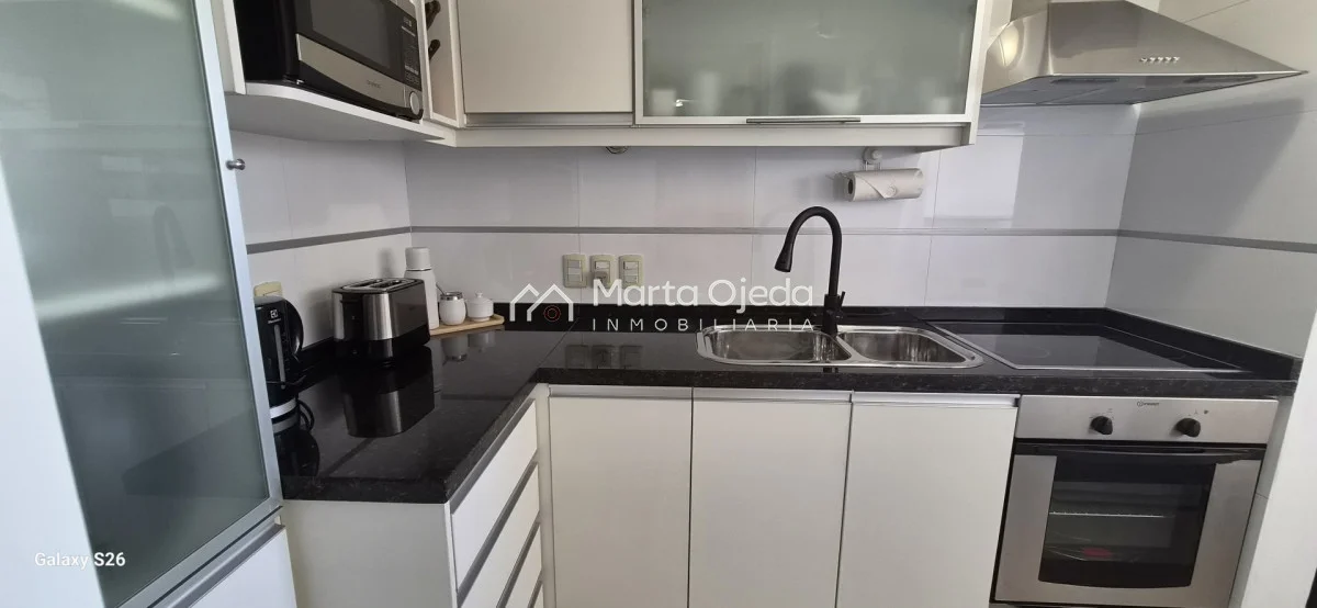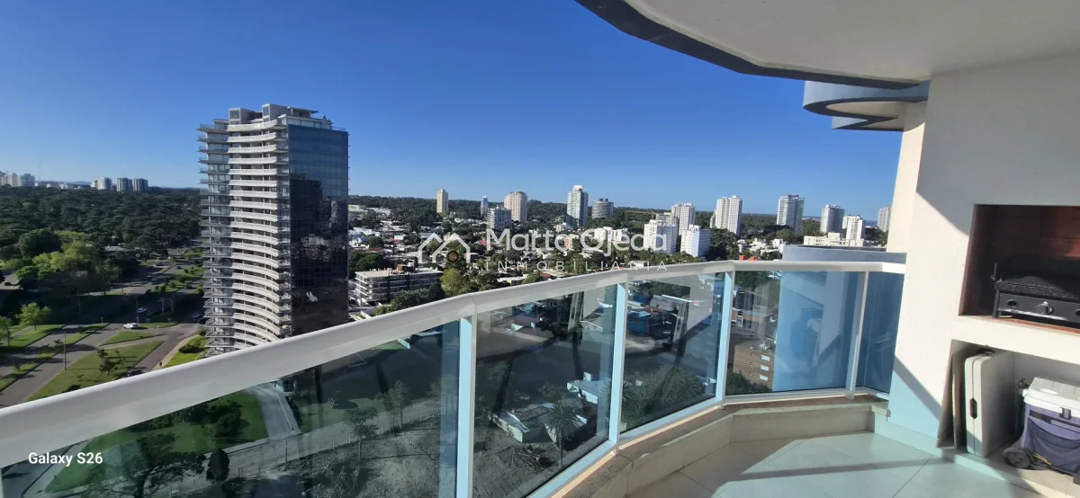 Apartamento en piso alto , living-comedor con salida a terraza con parrillero , dos dormitorios en suite , cocina definida , baño social , garaje. El edificio cuenta con dos piscinas climatizadas, una cerrada. Amplias barbacoas , salón de uso múltiple, cancha de tenis, sauna, juegos infantiles, sala cine, gimnasio, servicio de mucama , servicio de playa .