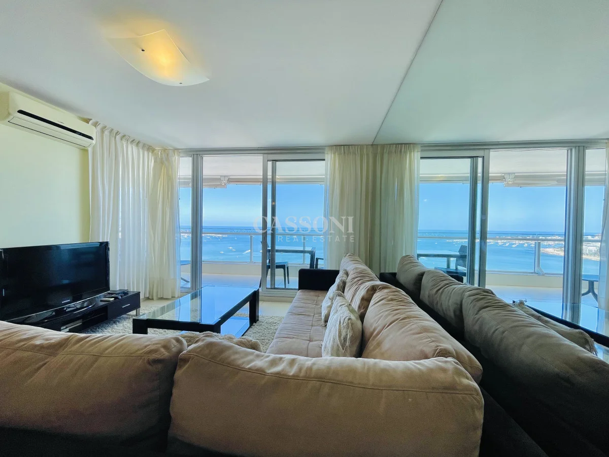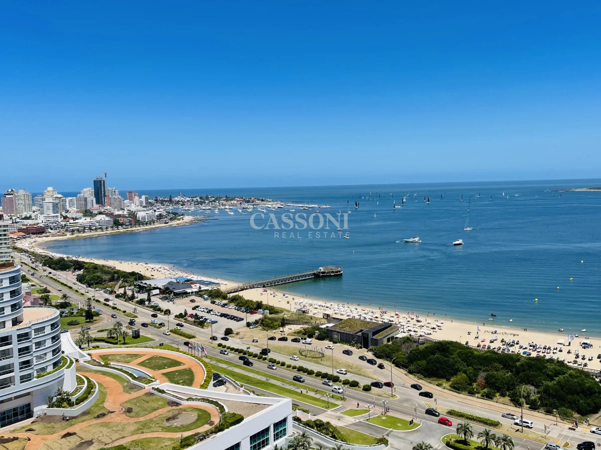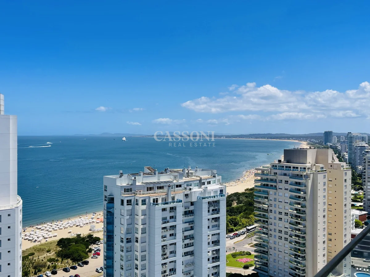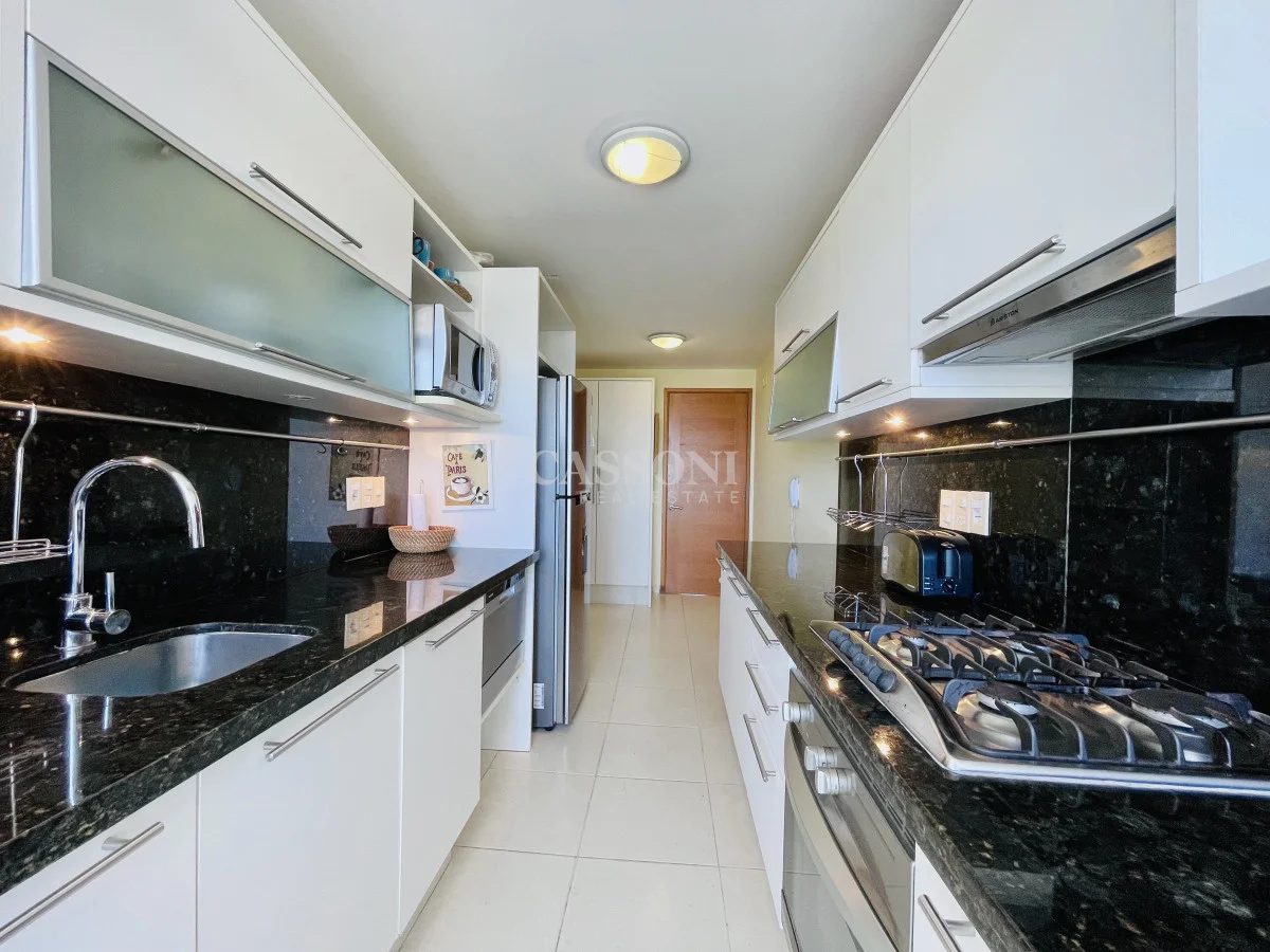 Amplia cocina totalmente equipada con balcón y vista a la Playa Brava. Living muy espacioso con amplios ventanales y terraza grande con jacuzzi y vista a la Playa Mansa.