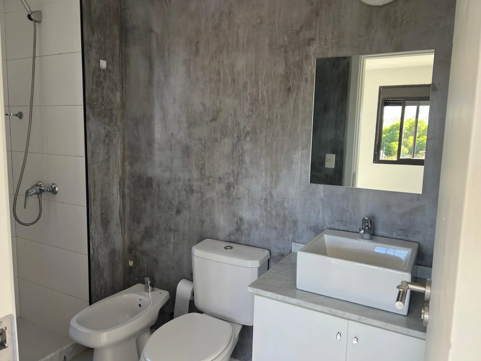 En dirección al área privada tenemos un cómodo pasillo de distribución hacia 3 amplios dormitorios con espaciosos placares completos, uno de ellos con baño completo en suite y ventilación natural, el otro baño general también completo y con un plato de ducha extra grande. Ambos baños tienen estilosos acabados de microcemento lustrado.