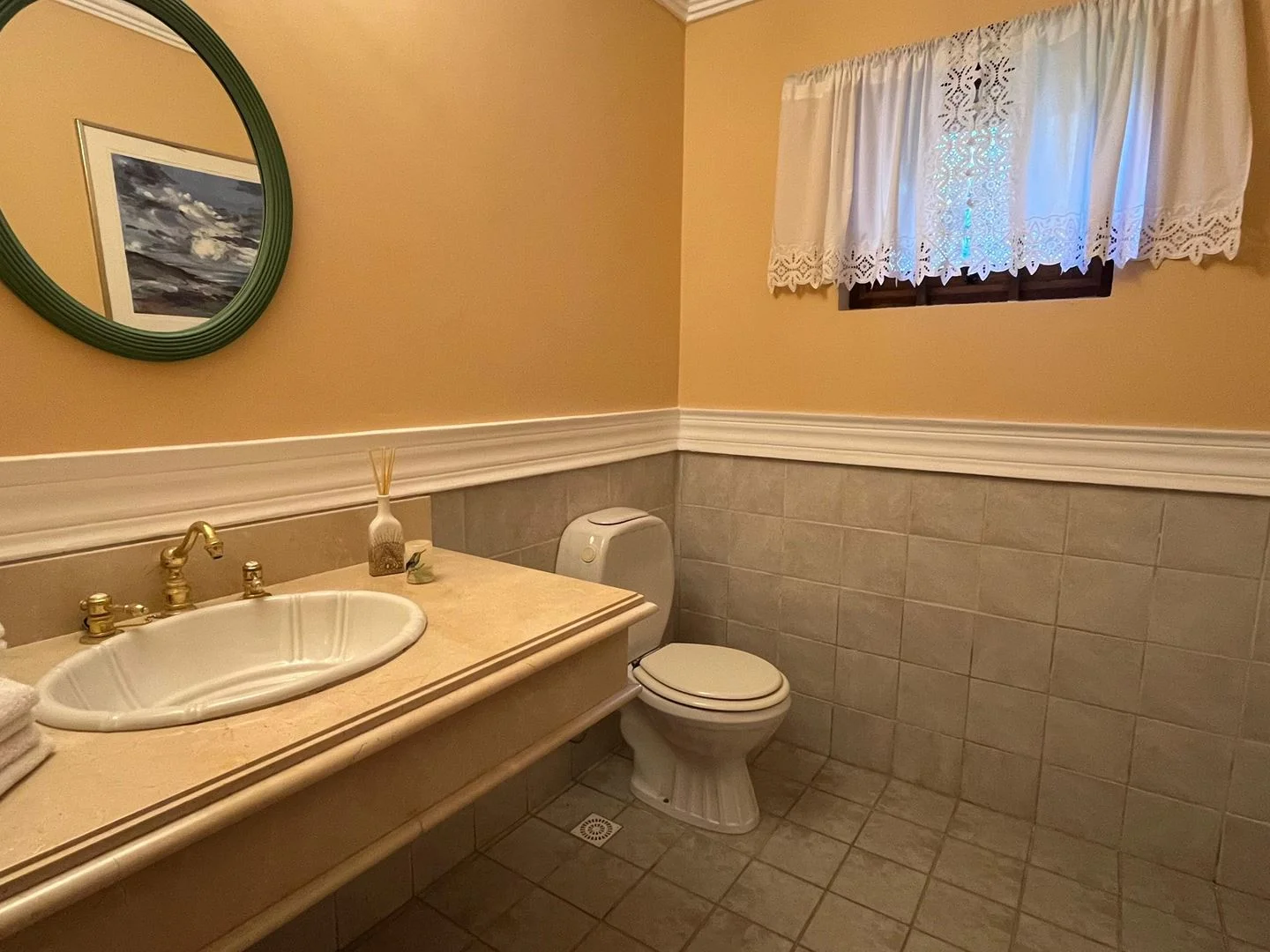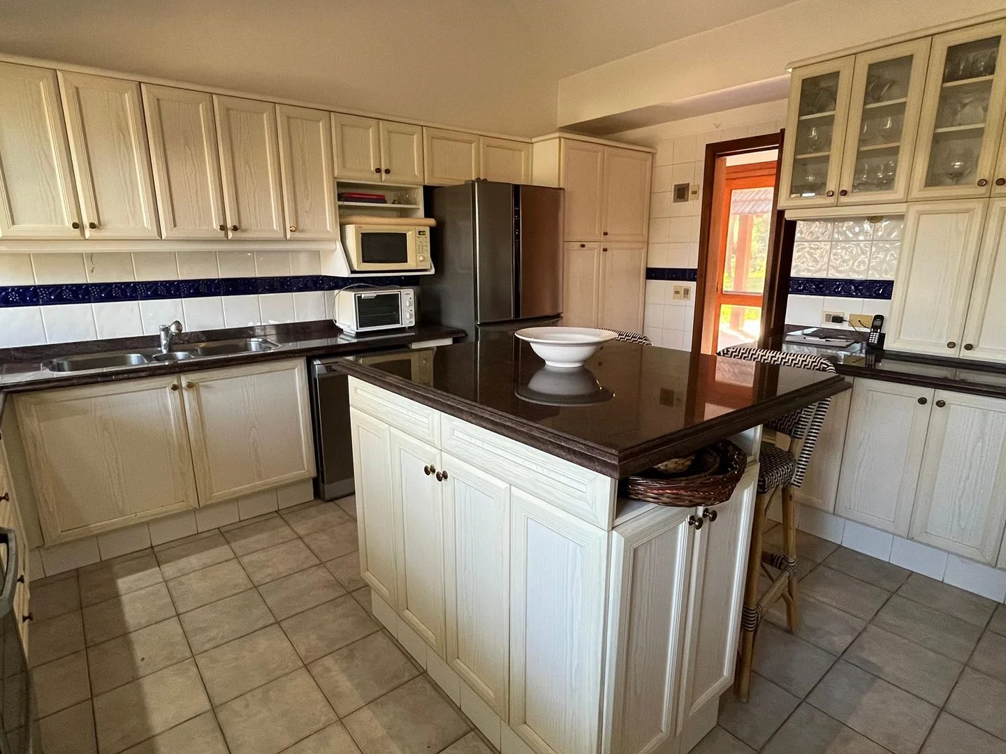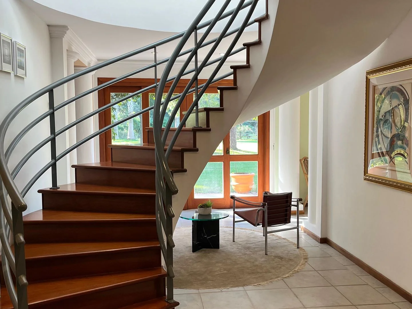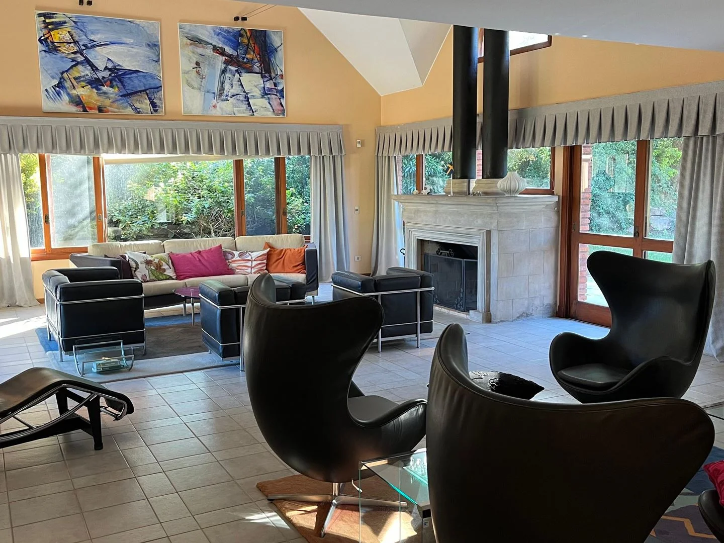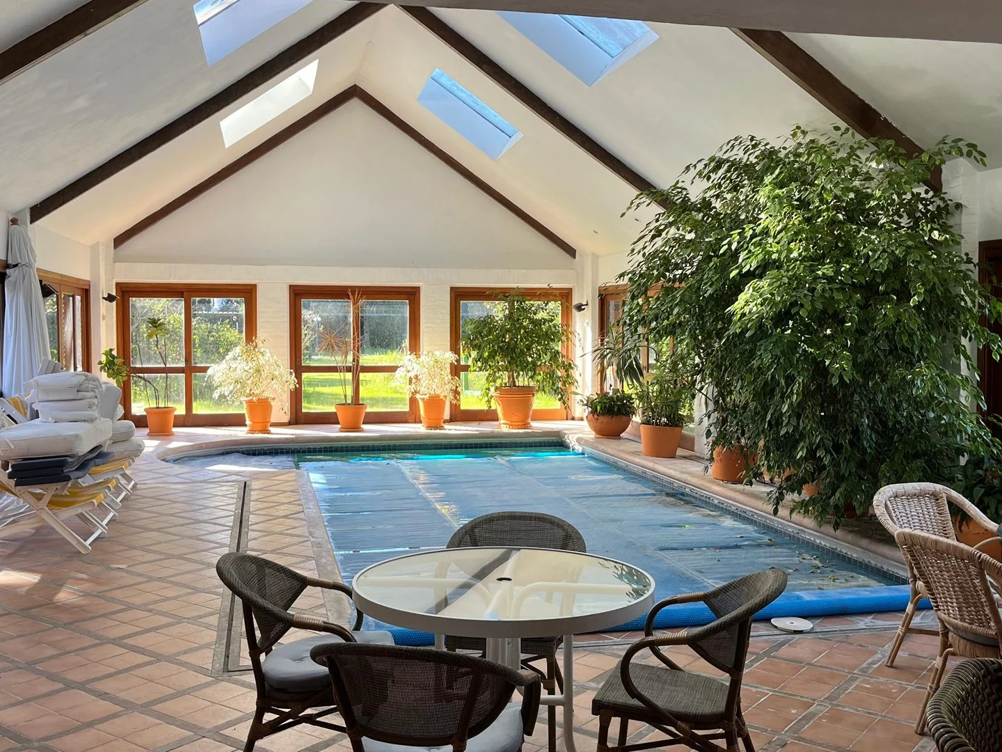 En la planta alta dispone de otros tres dormitorios, siendo el principal en suite y uno de ellos actualmente utilizado como escritorio. En la zona del parrillero cuenta con una gran piscina completamente cubierta con salida a un inmenso jardín. Además, posee una dependencia de servicio completa y un garaje cerrado.