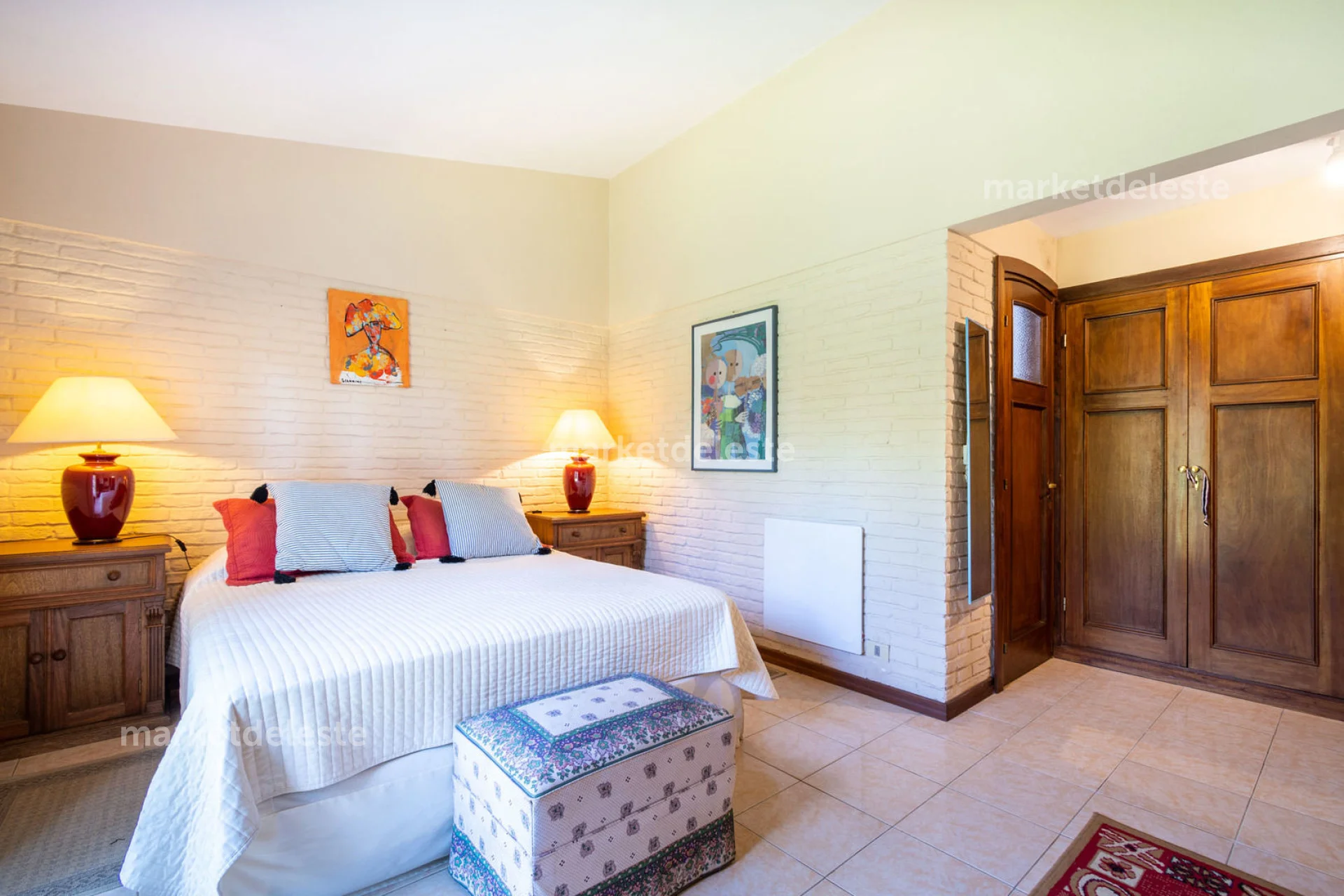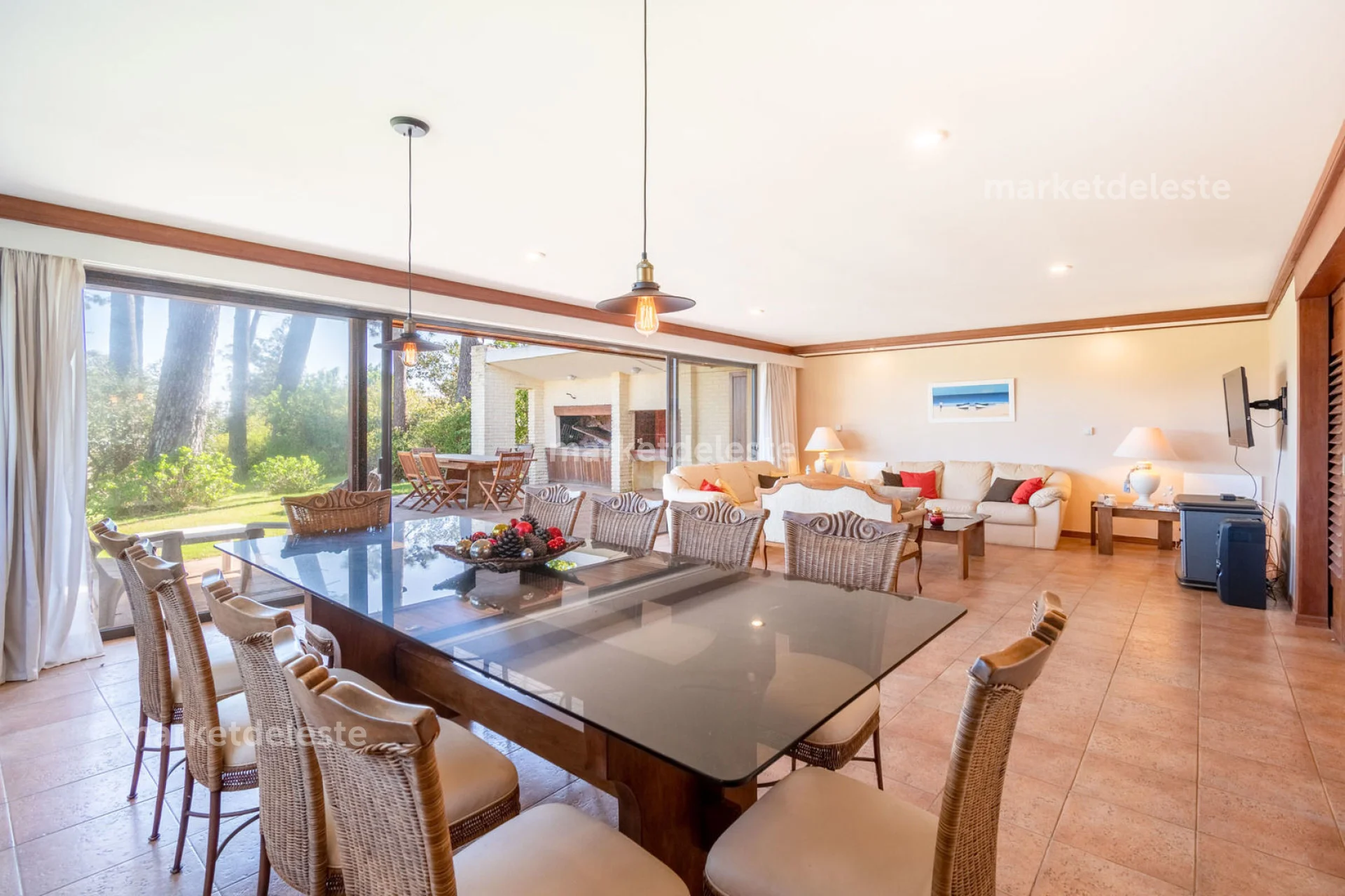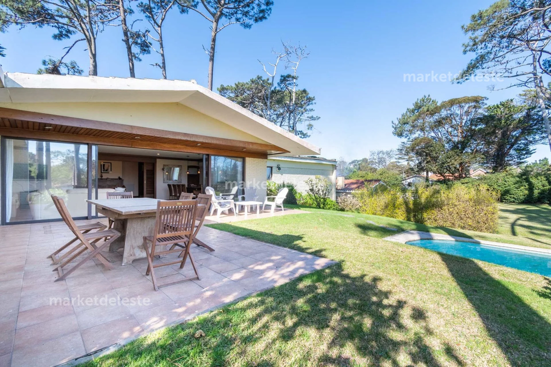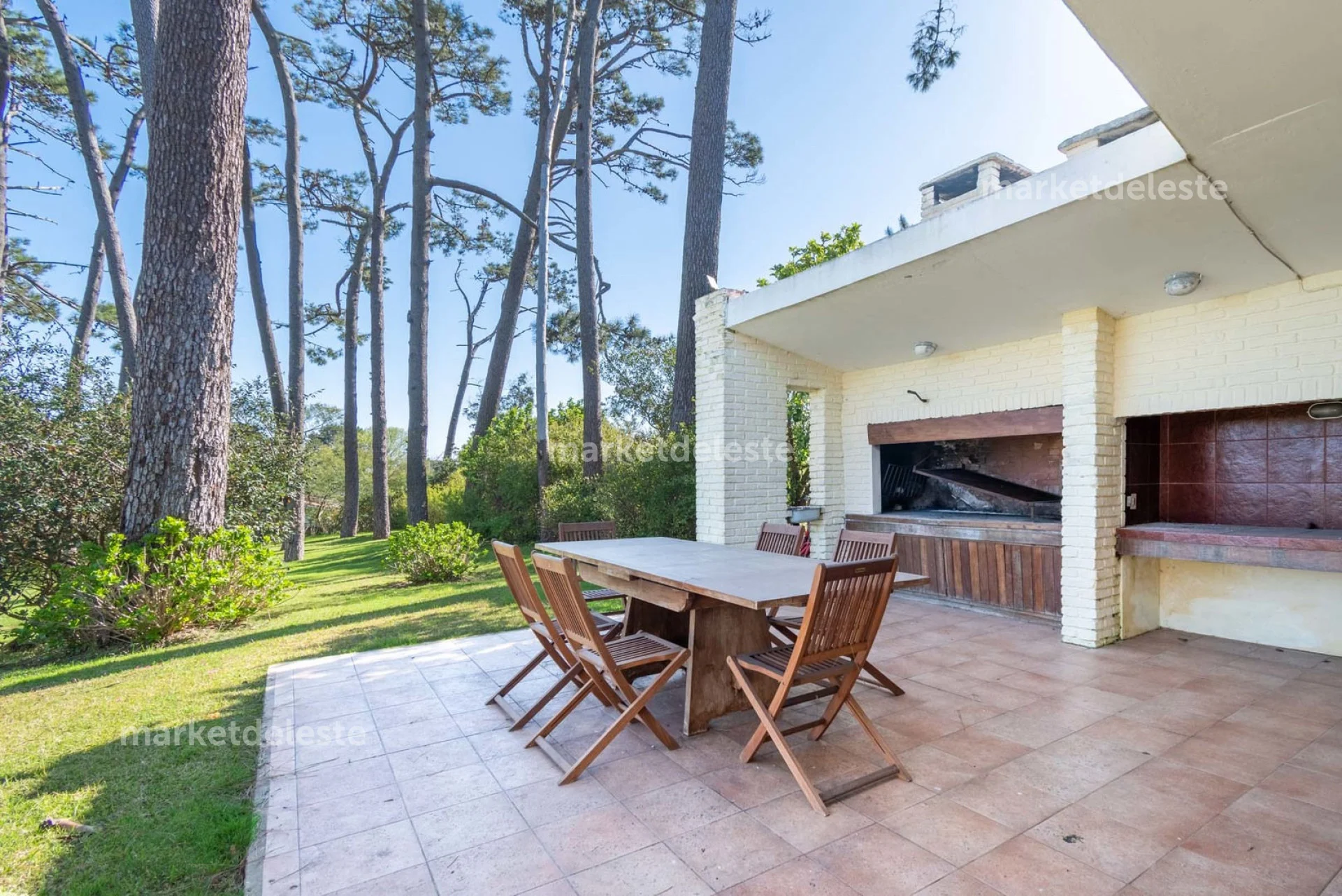 Chalet a tres cuadras del mar, con salida a dos calles por ser una manzana entera. Totalmente perimetrado. Casa principal con amplio living comedor, toilette, cocina definida con comedor diario y salida a lavadero. Tres dormitorios en suite mas habitación de servicio con baño. Amplio jardín de 3400 m2 con piscina y parrillero. Casa de Huéspedes con living comedor y cocina integrada, dos dormitorios y dos baños. Principal en suite. Garaje en subsuelo para dos autos. La tierra cuenta con un proyecto aprobado para Apart Hotel de 60 habitaciones en cuatro plantas.
