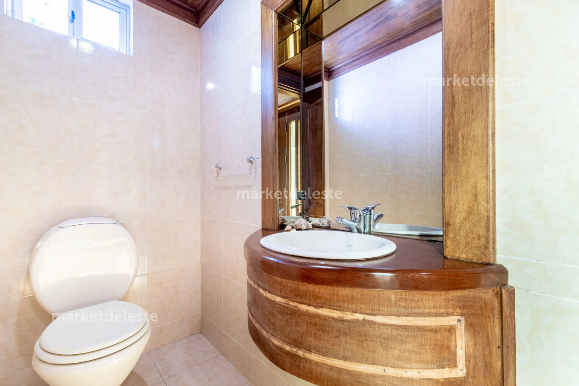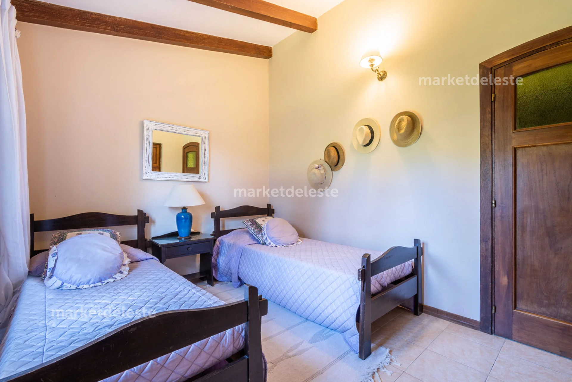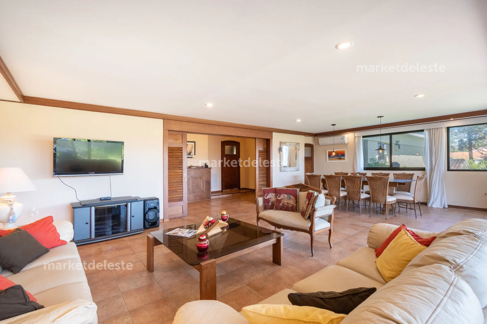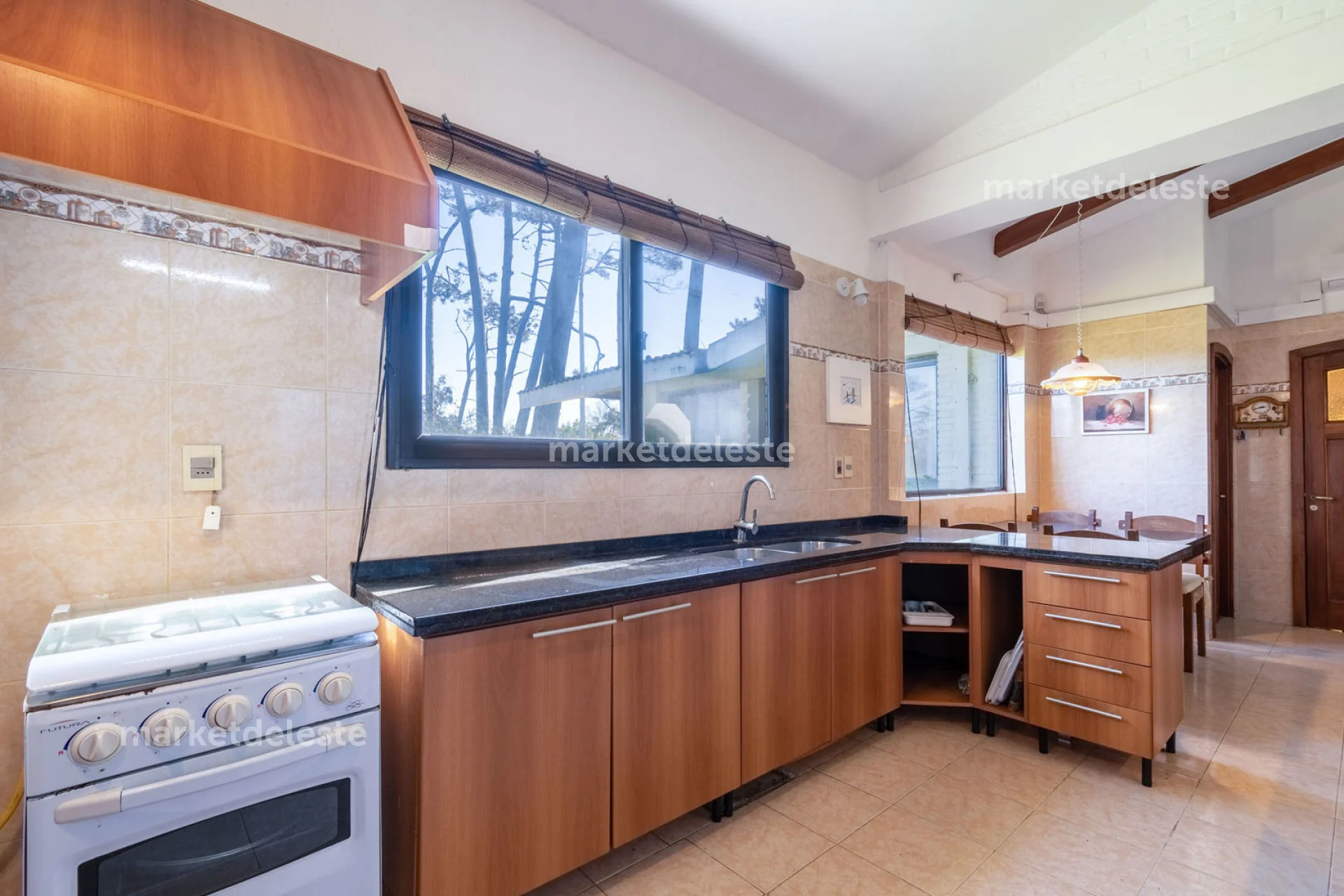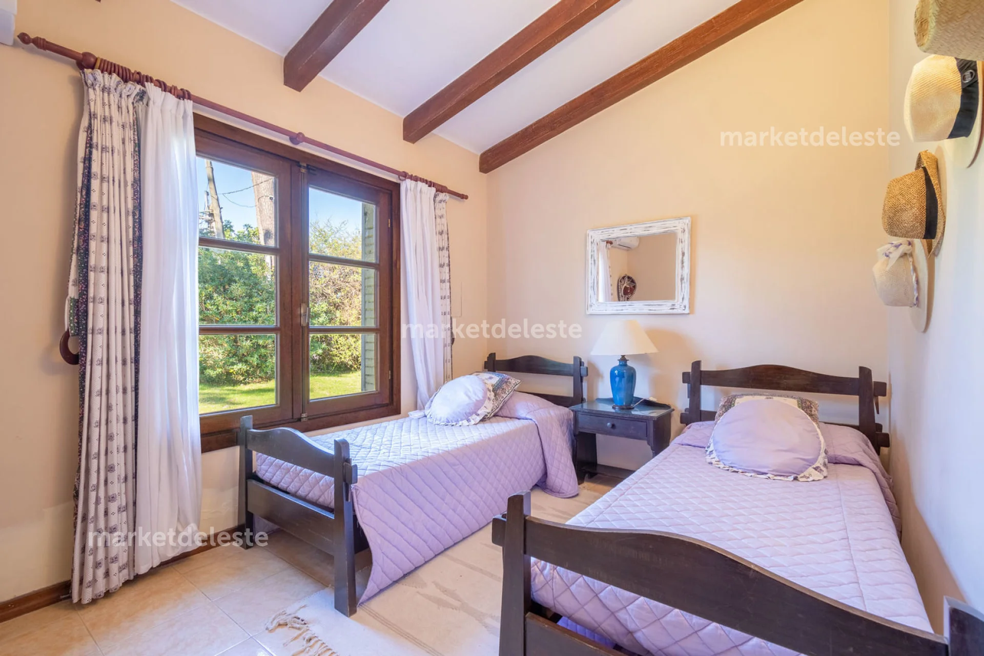 Chalet a tres cuadras del mar, con salida a dos calles por ser una manzana entera. Totalmente perimetrado. Casa principal con amplio living comedor, toilette, cocina definida con comedor diario y salida a lavadero. Tres dormitorios en suite mas habitación de servicio con baño. Amplio jardín de 3400 m2 con piscina y parrillero. Casa de Huéspedes con living comedor y cocina integrada, dos dormitorios y dos baños. Principal en suite. Garaje en subsuelo para dos autos. La tierra cuenta con un proyecto aprobado para Apart Hotel de 60 habitaciones en cuatro plantas.