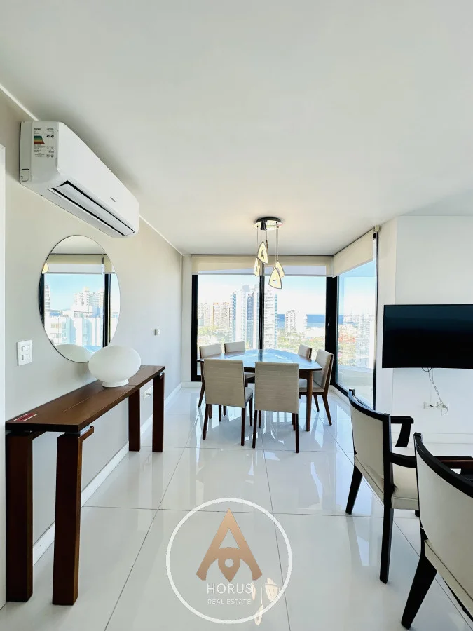 Amplia unidad de tres dormitorios en suite y toilette, principal con terraza y hermosas vistas a la playa brava. Luminoso living comedor con grandes ventanales de piso a techo, y salida a la terraza con hermosas vistas a la mansa y a la brava. Cocina bien equipada con desayunador.