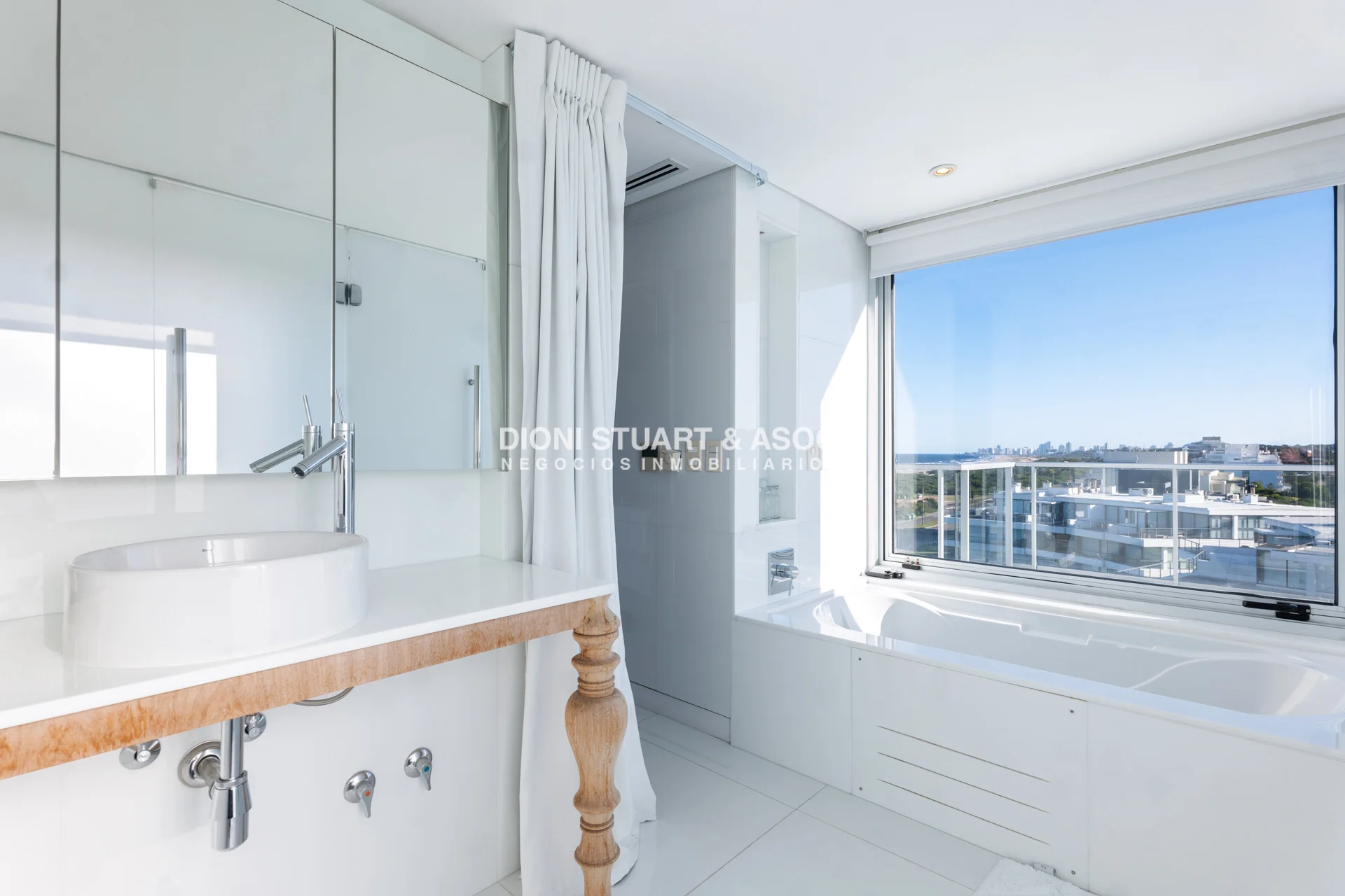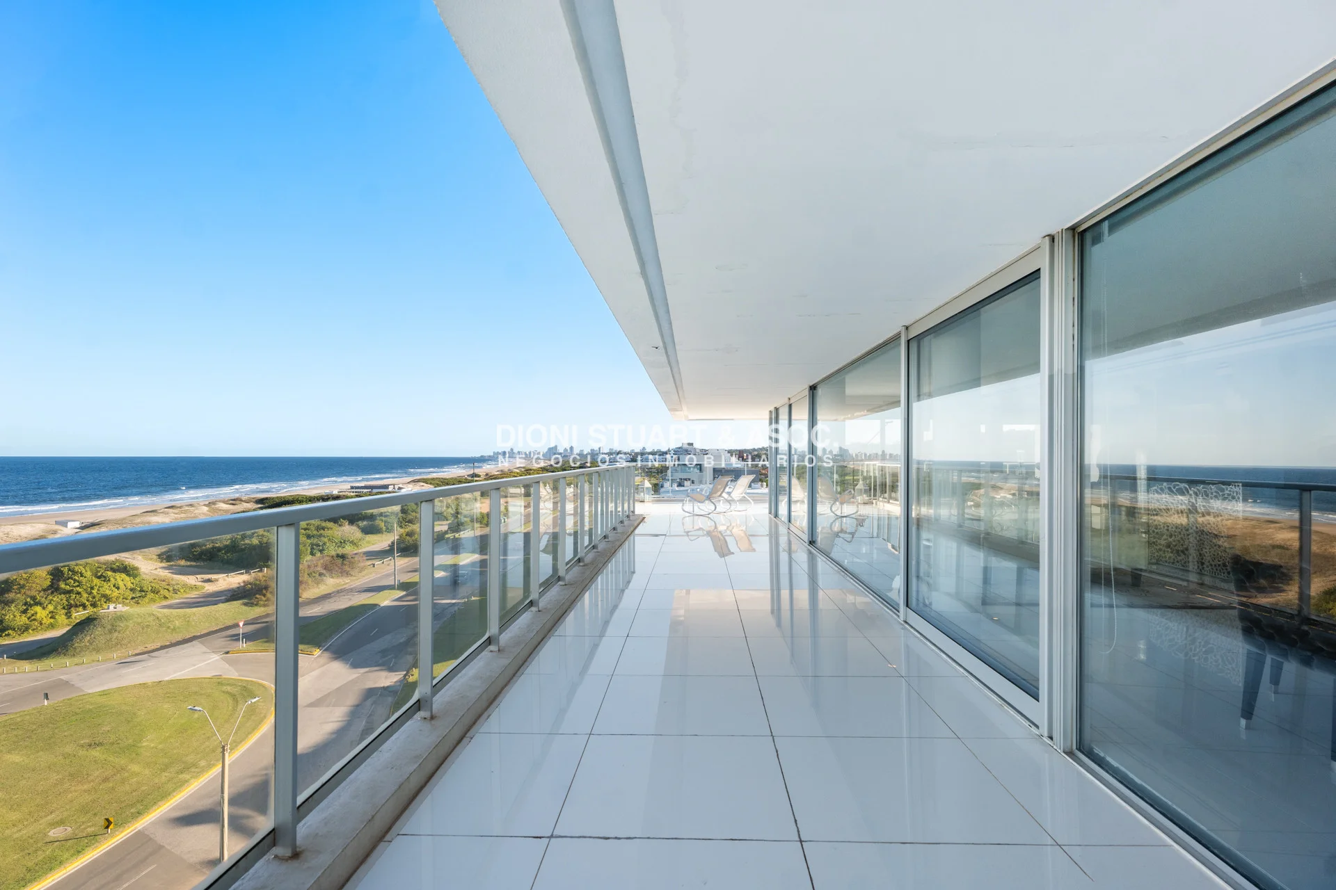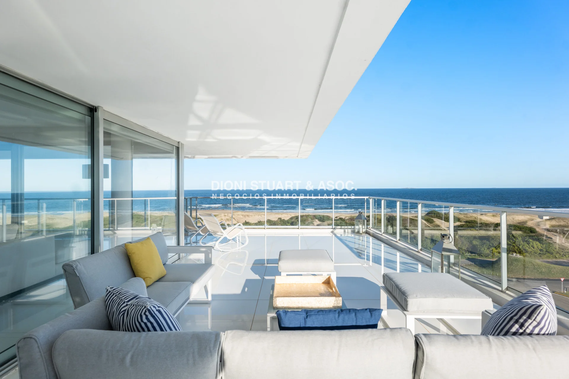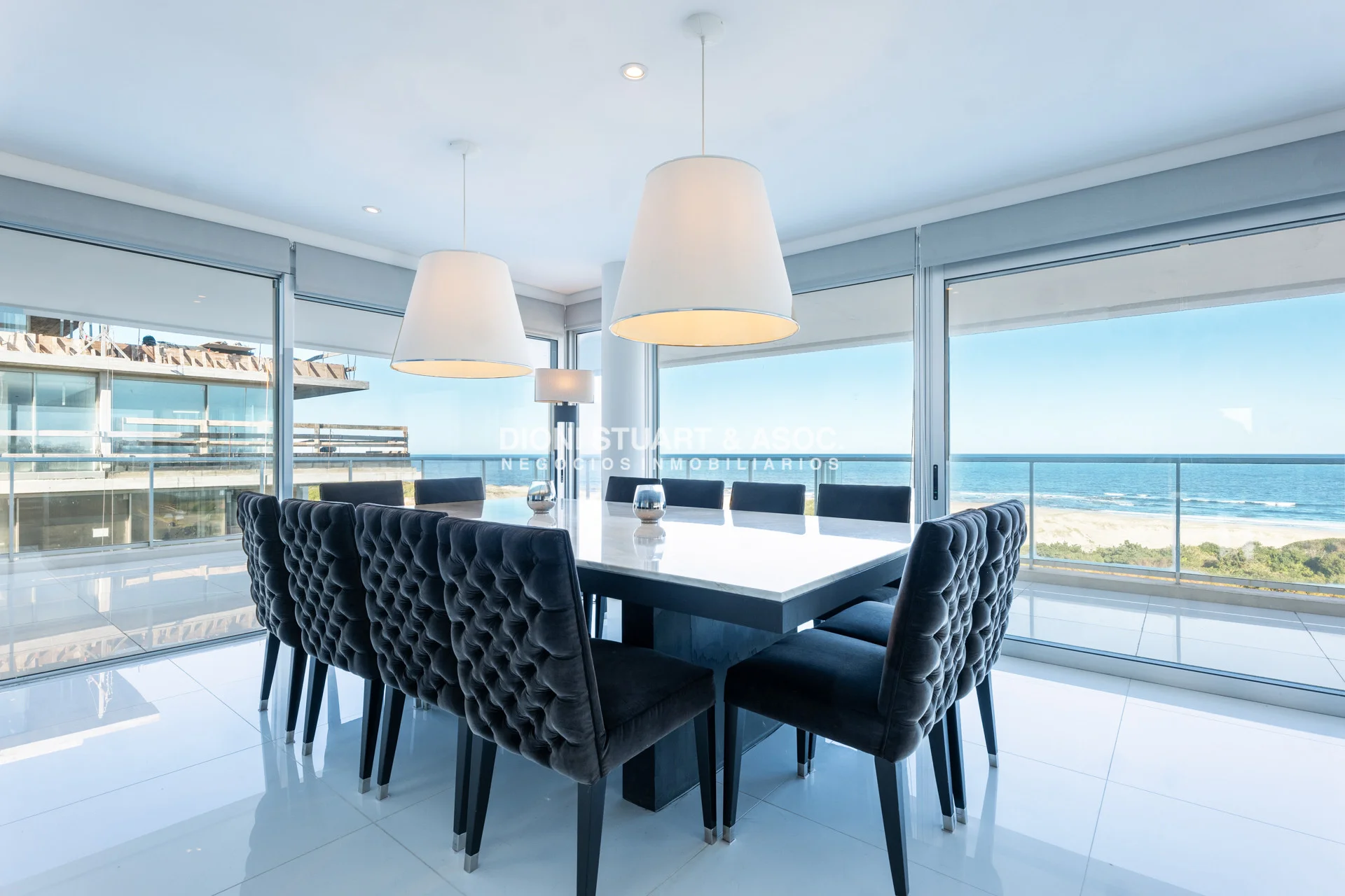 El departamento fue diseñado de una forma muy versátil, ofreciendo grandes áreas de estar, y 4 muy comodos dormitorios en suite. Su master suite cuenta con doble vestidor y baño (uno de ellos con jacuzzi). Living con hogar a leña, orientado todo hacia el mar, lugar desde donde accedemos a una terraza que rodea todo el perimetro del apartamento y permite disfrutar de excelentes vistas al mar. Cocina definida con isla estilo americana. A demás, desde el mismo piso a través de un ascensor interno se accede al duplex con parrillero y piscina. Cuenta con 4 garages, doble baulera y cava de vino.