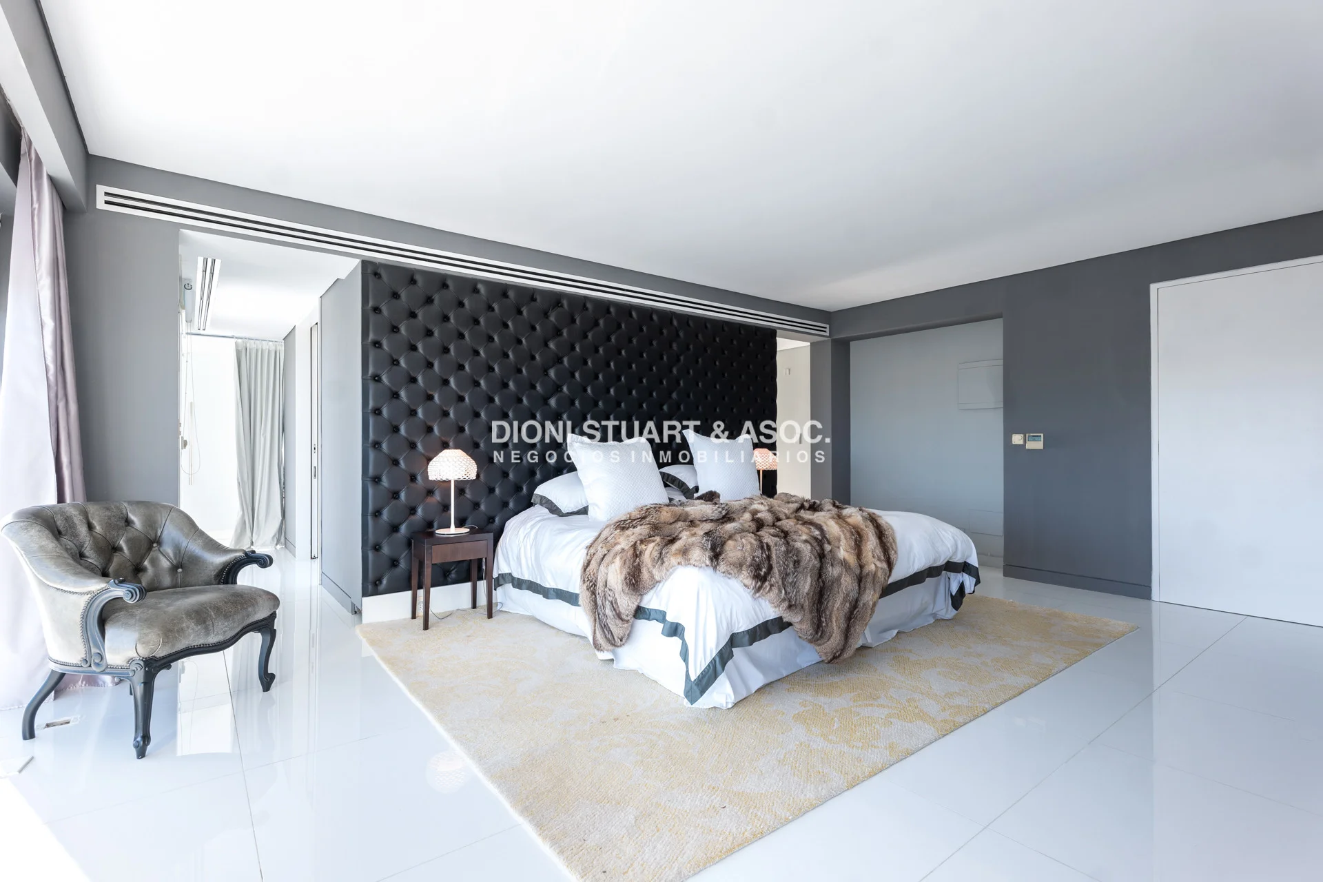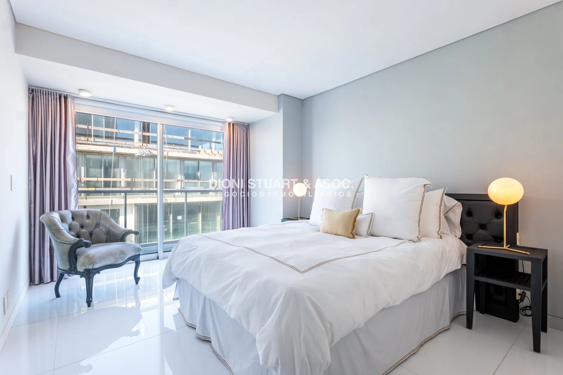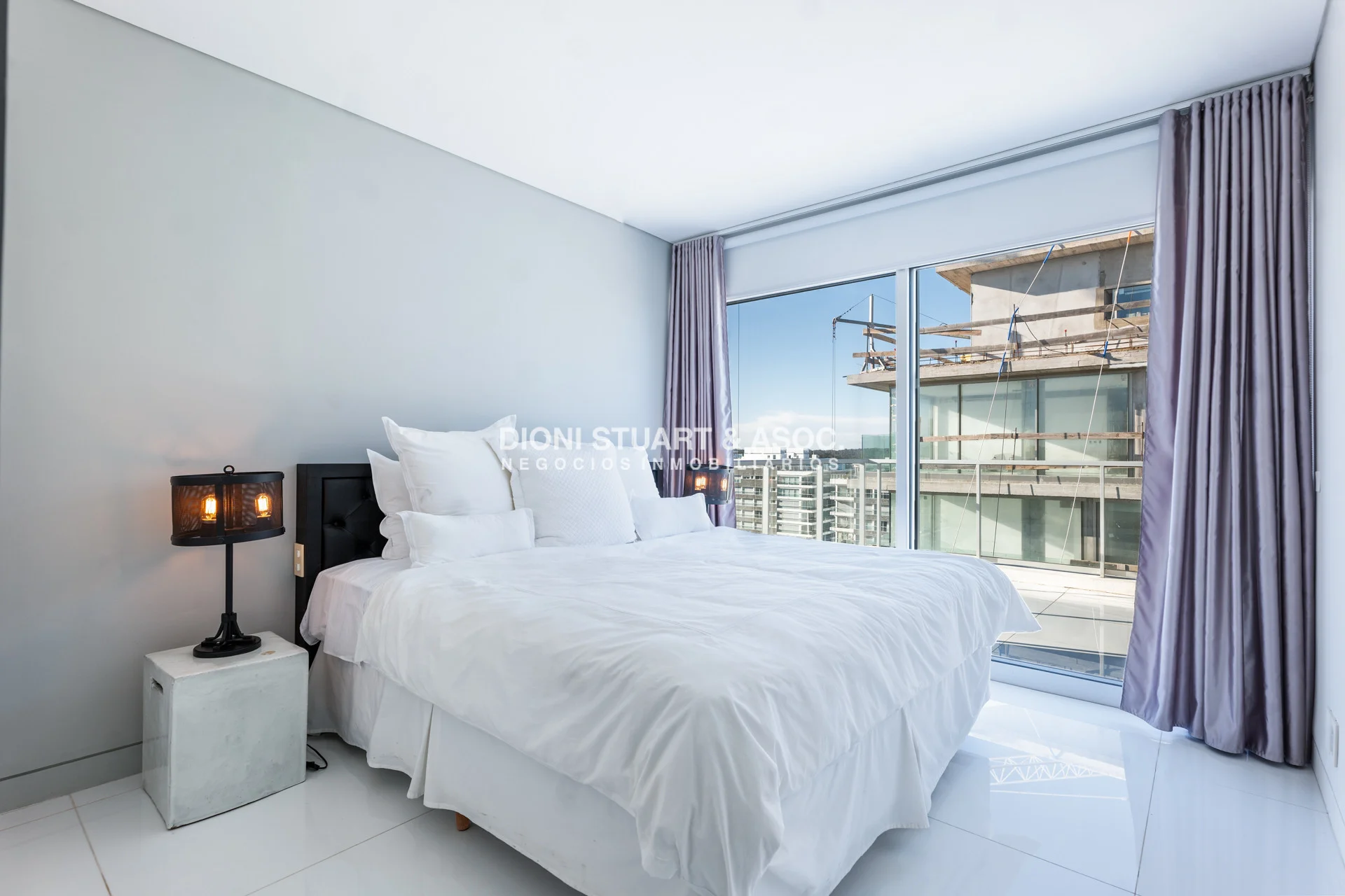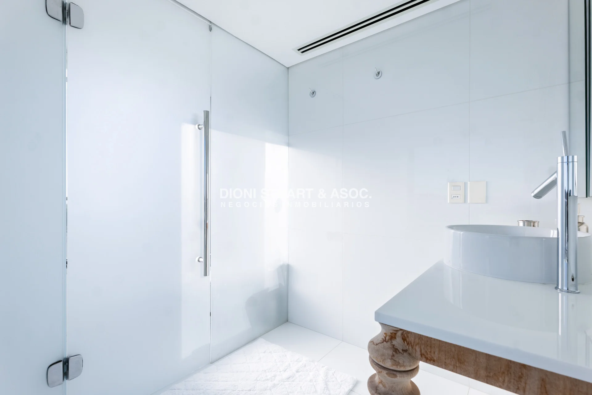El departamento fue diseñado de una forma muy versátil, ofreciendo grandes áreas de estar, y 4 muy comodos dormitorios en suite. Su master suite cuenta con doble vestidor y baño (uno de ellos con jacuzzi). Living con hogar a leña, orientado todo hacia el mar, lugar desde donde accedemos a una terraza que rodea todo el perimetro del apartamento y permite disfrutar de excelentes vistas al mar. Cocina definida con isla estilo americana. A demás, desde el mismo piso a través de un ascensor interno se accede al duplex con parrillero y piscina. Cuenta con 4 garages, doble baulera y cava de vino.