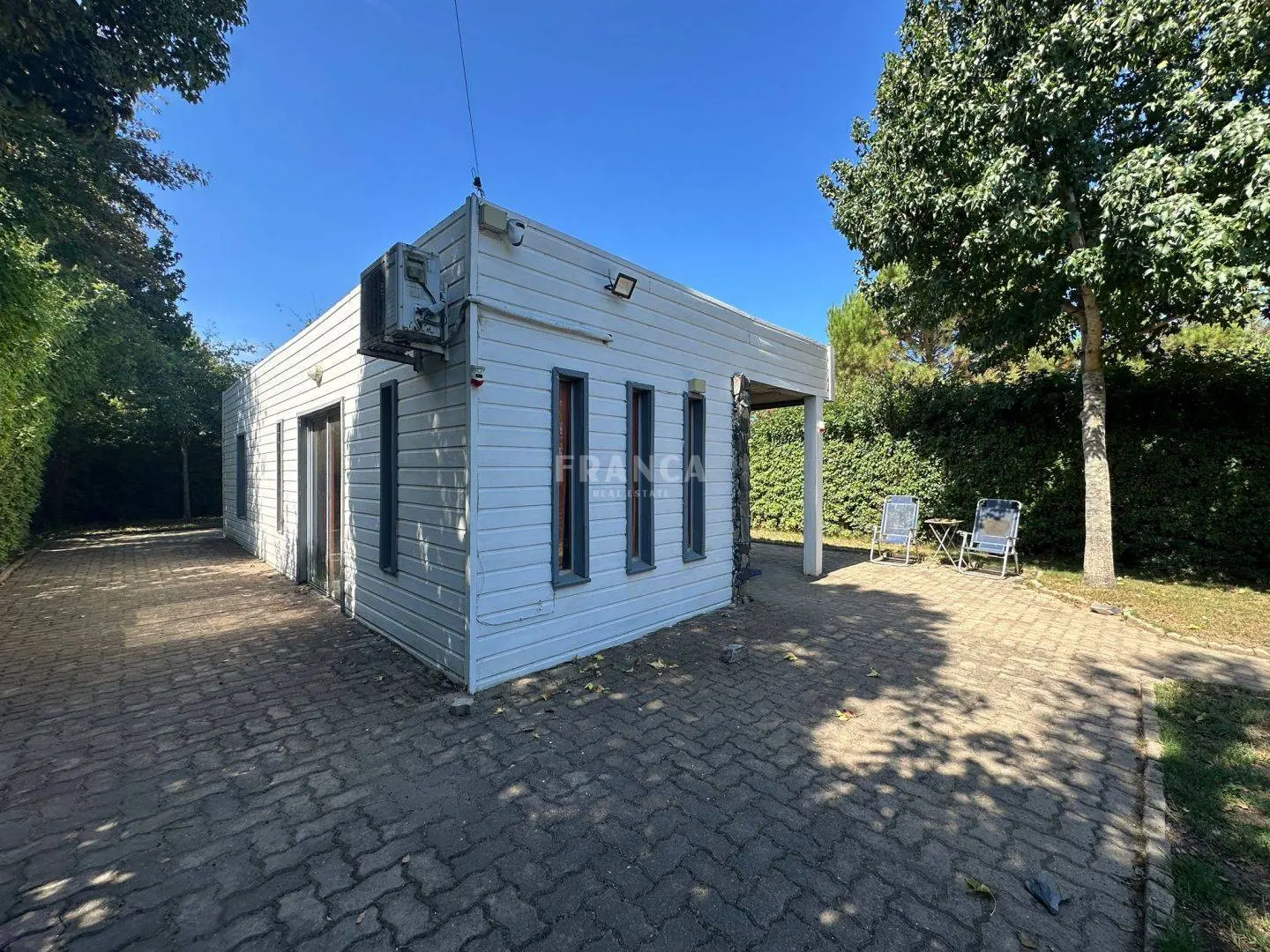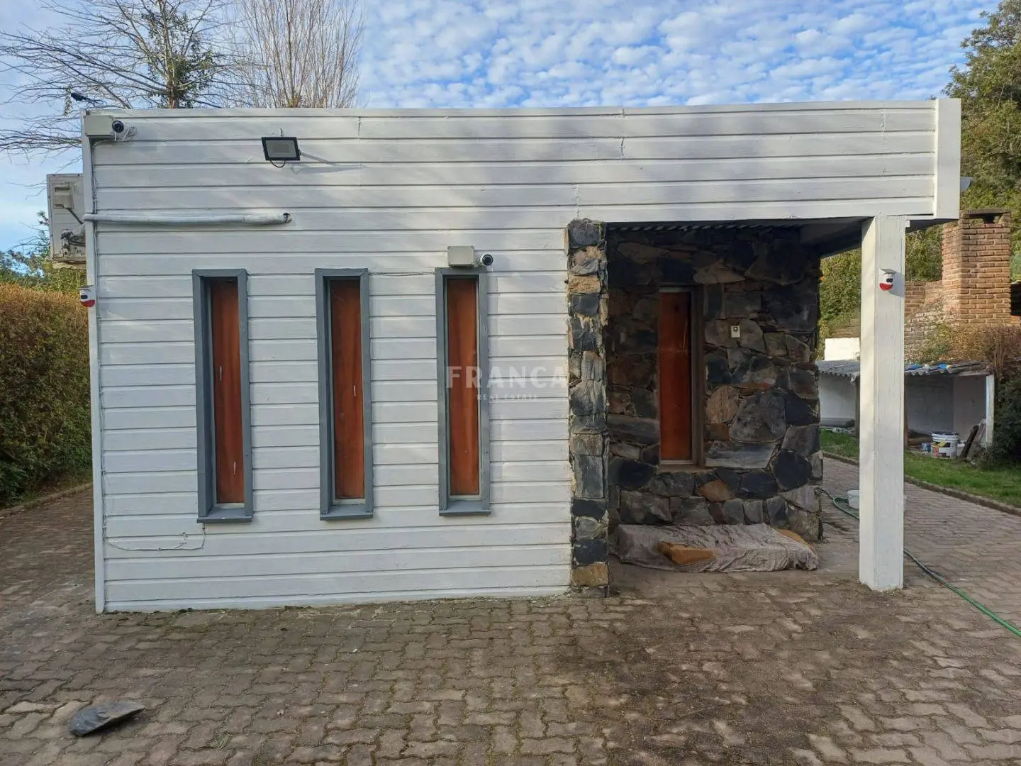 El exterior acompaña con detalles de calidad, como 110 m² de adoquines que rodean la propiedad, portones corredizos de acero inoxidable, frente revestido en piedra natural y sistema de supergás instalado en nicho subterráneo aislado. Además, dispone de aire acondicionado, equipamiento completo y sistema de seguridad con cámaras de última generación.