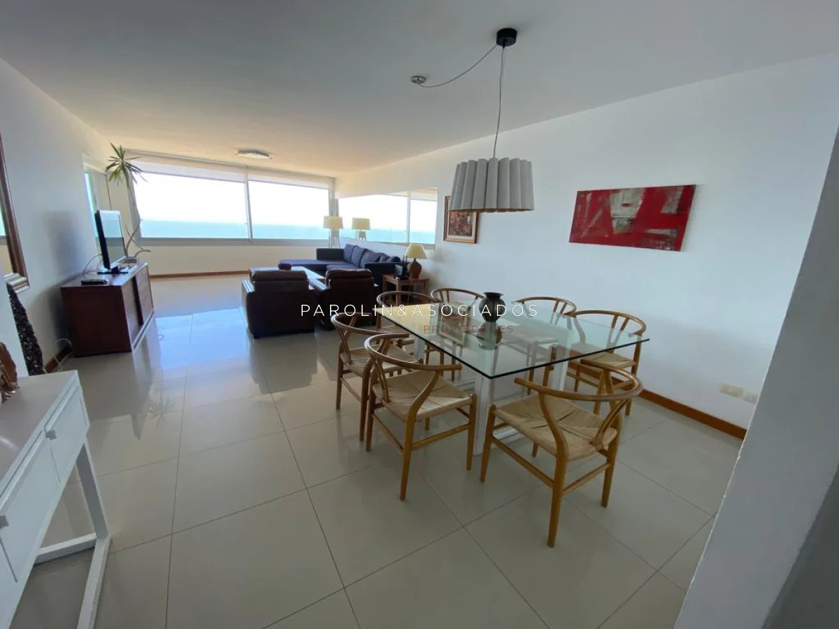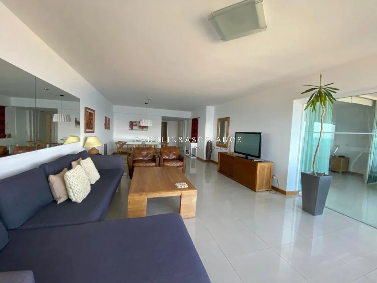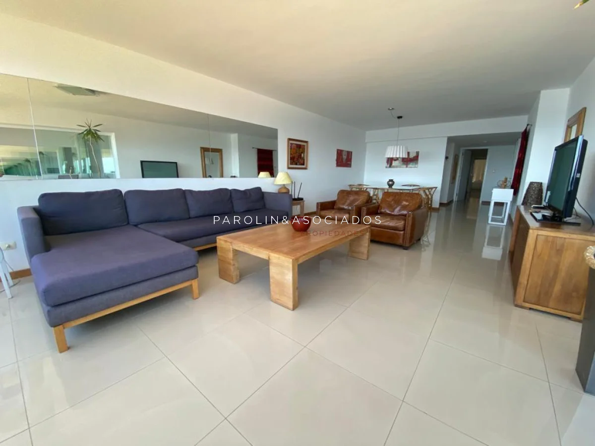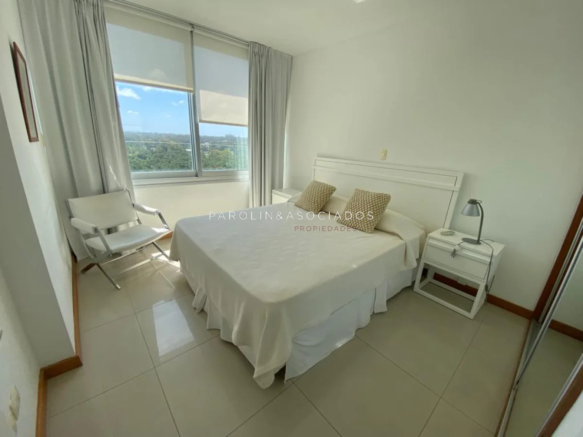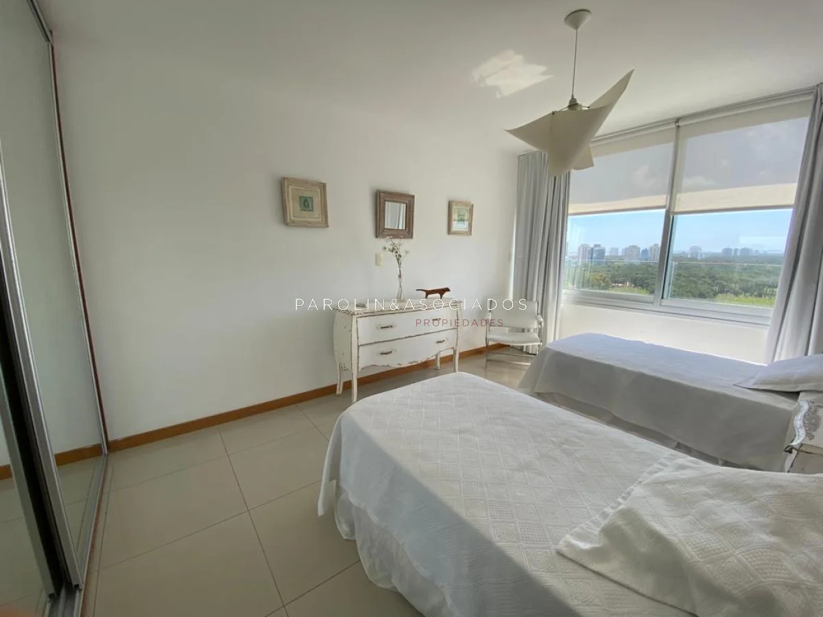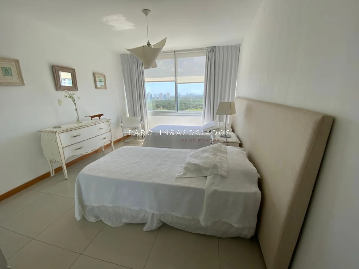 Amplio living comedor con balcón cerrado integrado, baño social con ducha, suite principal a frente con acceso a balcón, dos dormitorios los cuales miran al contra frente con una vista maravillosa al bosque y parte de playa mansa las cuales comparten un baño completo, amplia cocina comedor con terraza lavadero, dependencia de servicio con baño en suite integrada al apto con doble circulación lo que permite integrarla como un dormitorio mas y pasar a tener una planta de cuatros dormitorios, garaje y un completo equipamiento.