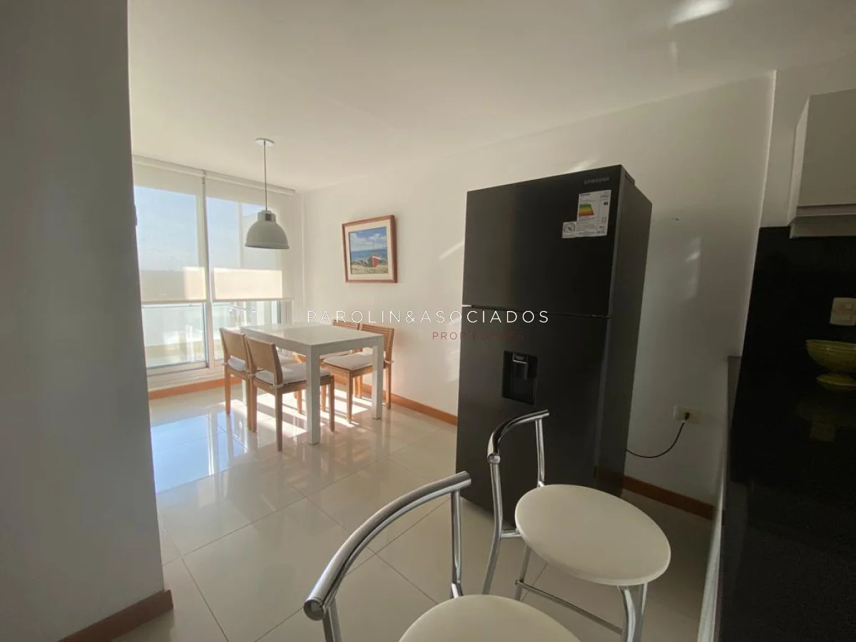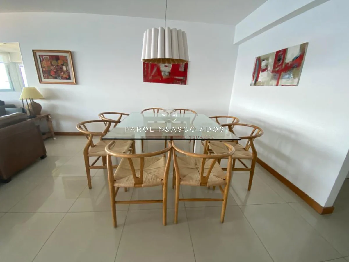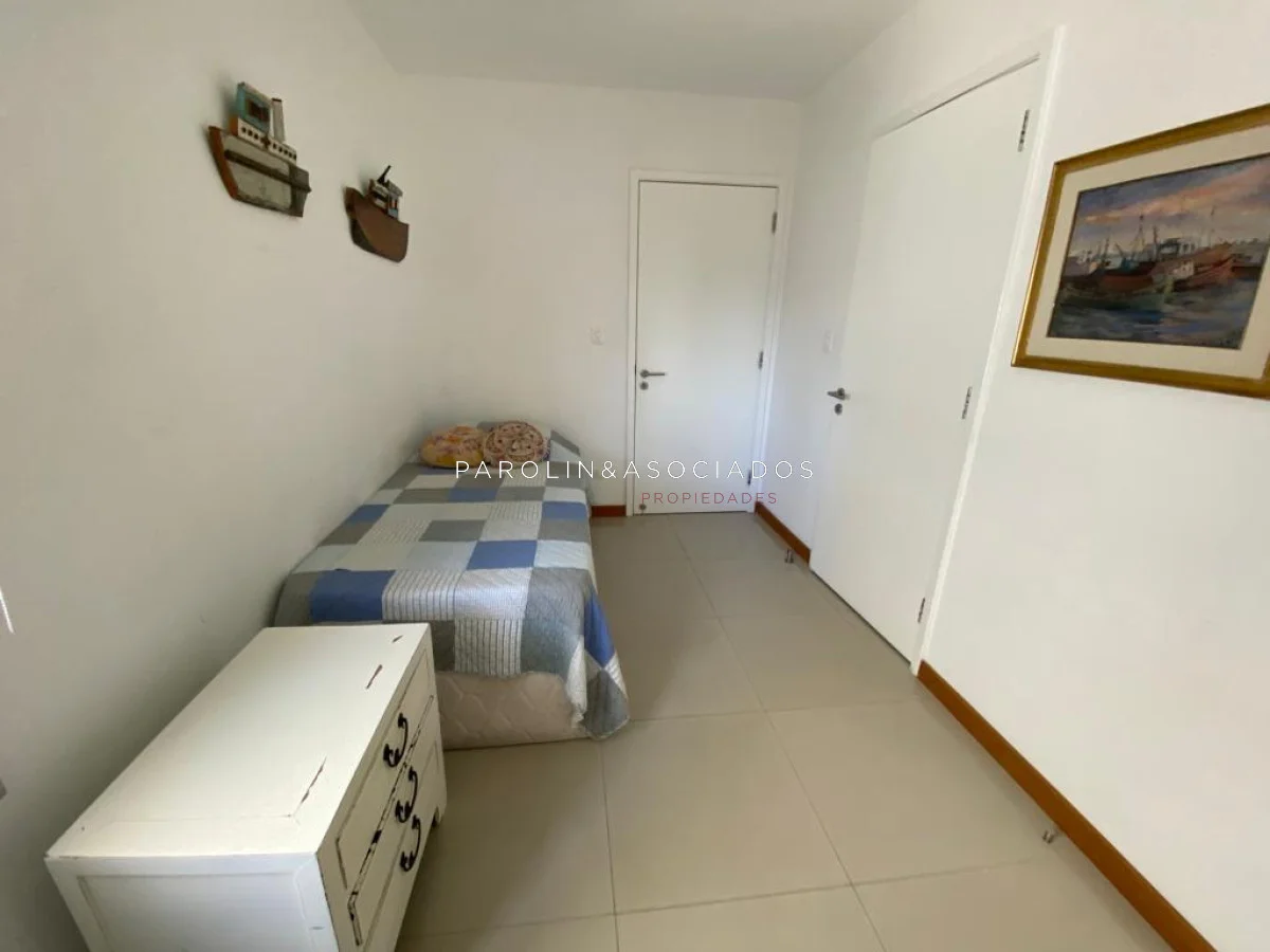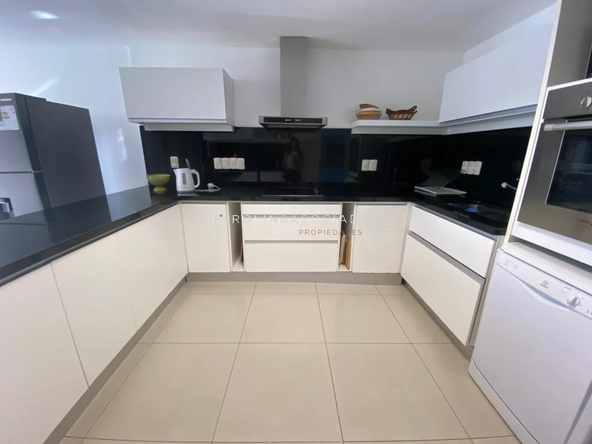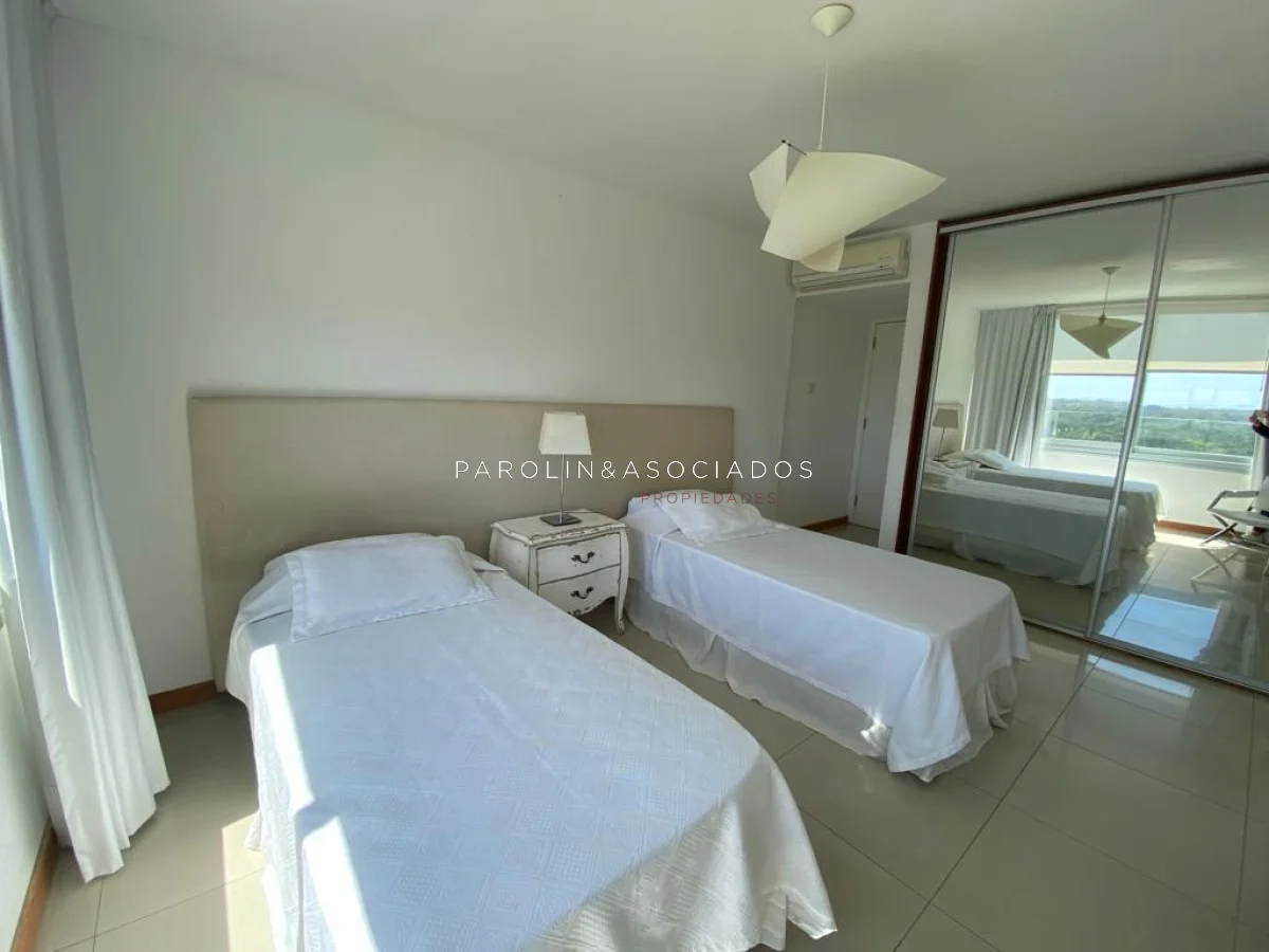 Amplio living comedor con balcón cerrado integrado, baño social con ducha, suite principal a frente con acceso a balcón, dos dormitorios los cuales miran al contra frente con una vista maravillosa al bosque y parte de playa mansa las cuales comparten un baño completo, amplia cocina comedor con terraza lavadero, dependencia de servicio con baño en suite integrada al apto con doble circulación lo que permite integrarla como un dormitorio mas y pasar a tener una planta de cuatros dormitorios, garaje y un completo equipamiento.