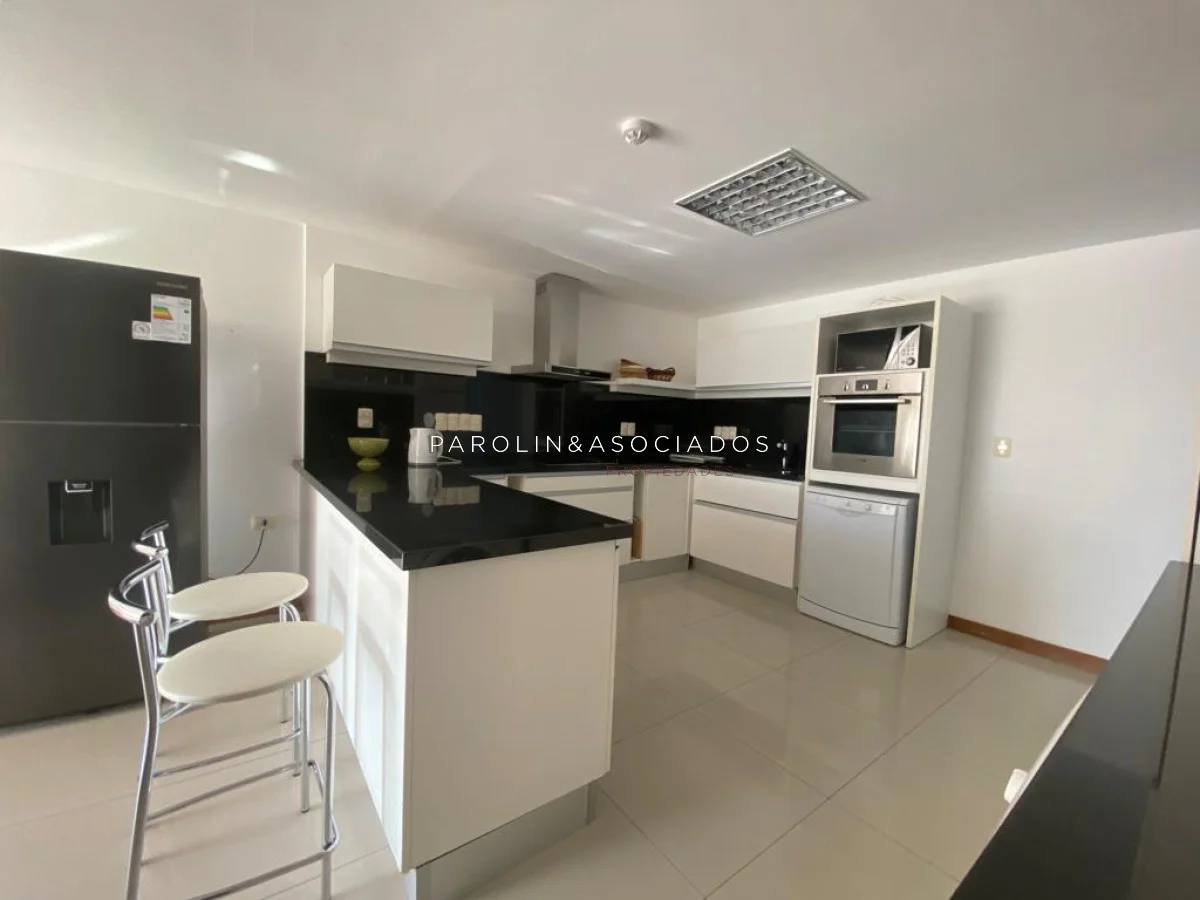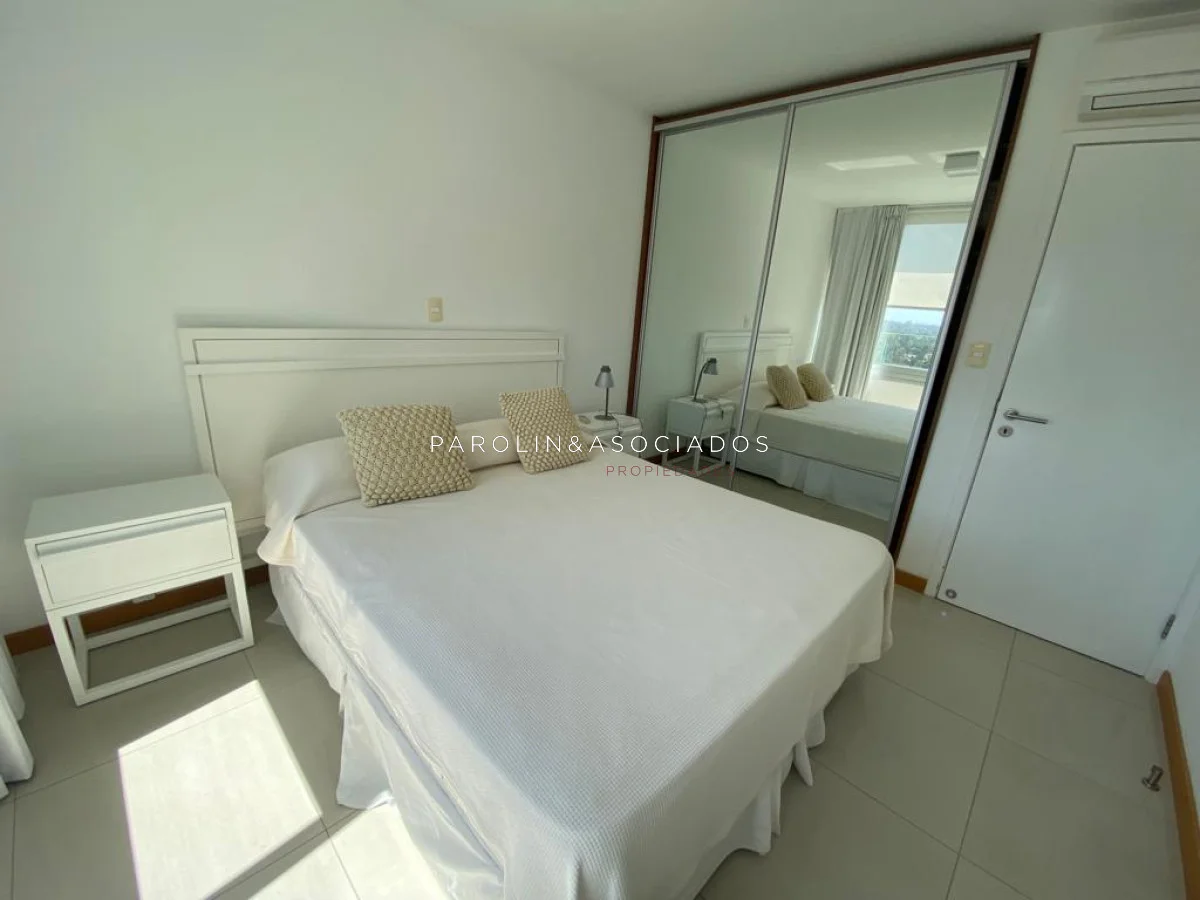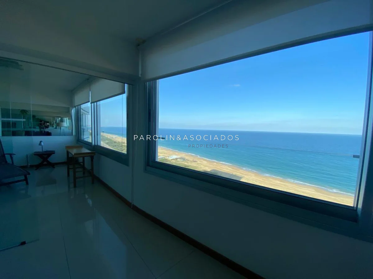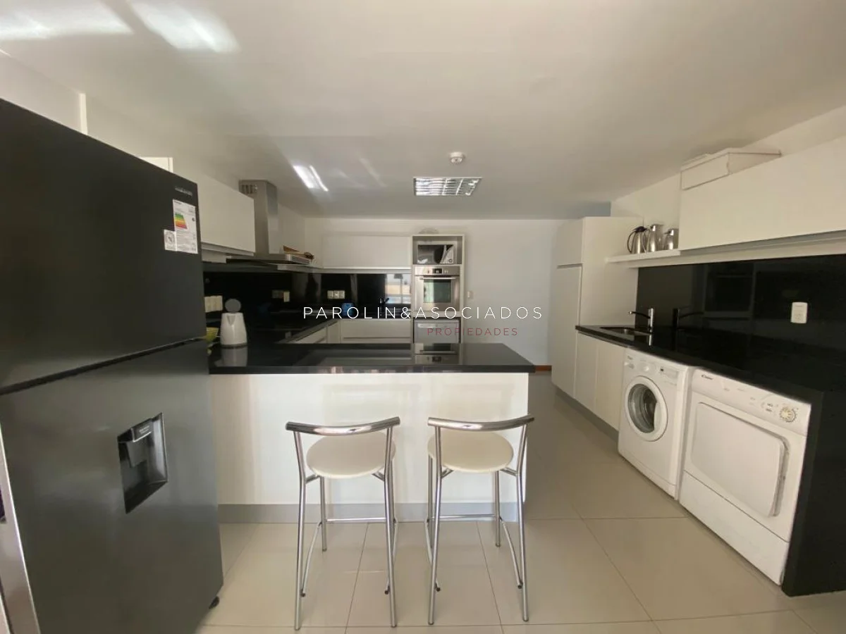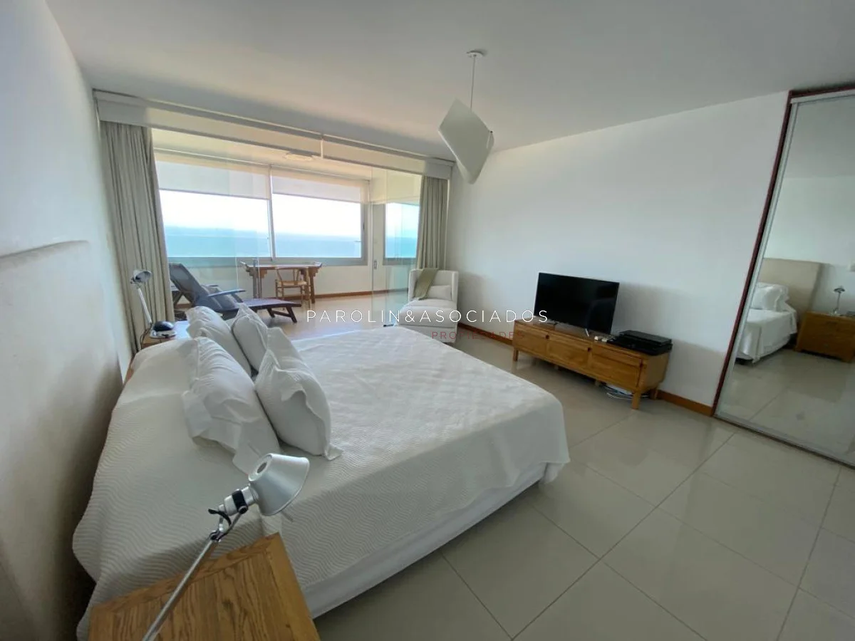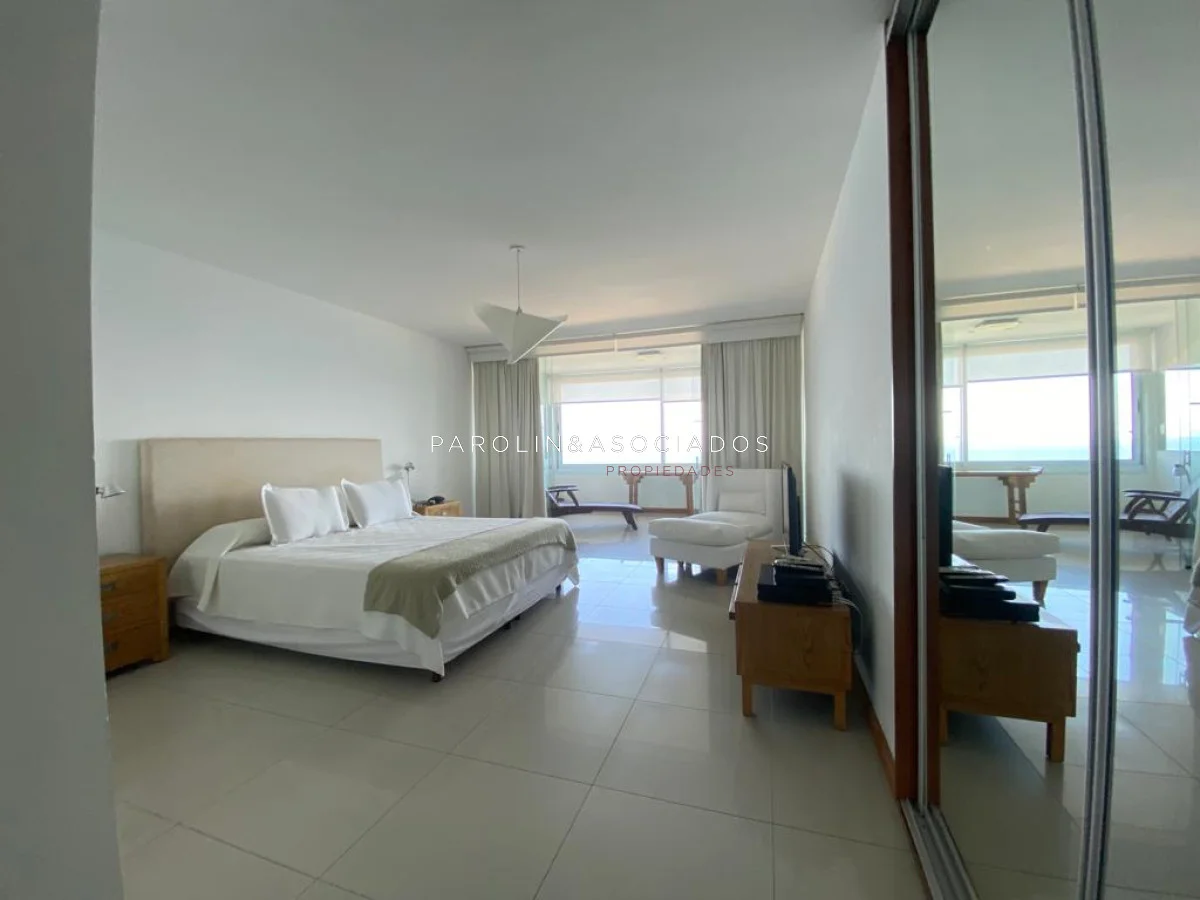 Amplio living comedor con balcón cerrado integrado, baño social con ducha, suite principal a frente con acceso a balcón, dos dormitorios los cuales miran al contra frente con una vista maravillosa al bosque y parte de playa mansa las cuales comparten un baño completo, amplia cocina comedor con terraza lavadero, dependencia de servicio con baño en suite integrada al apto con doble circulación lo que permite integrarla como un dormitorio mas y pasar a tener una planta de cuatros dormitorios, garaje y un completo equipamiento.