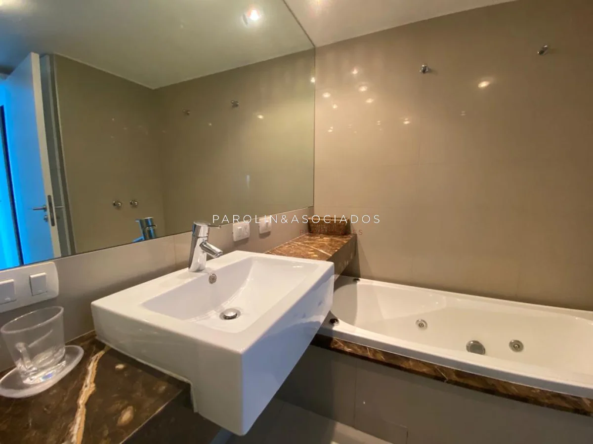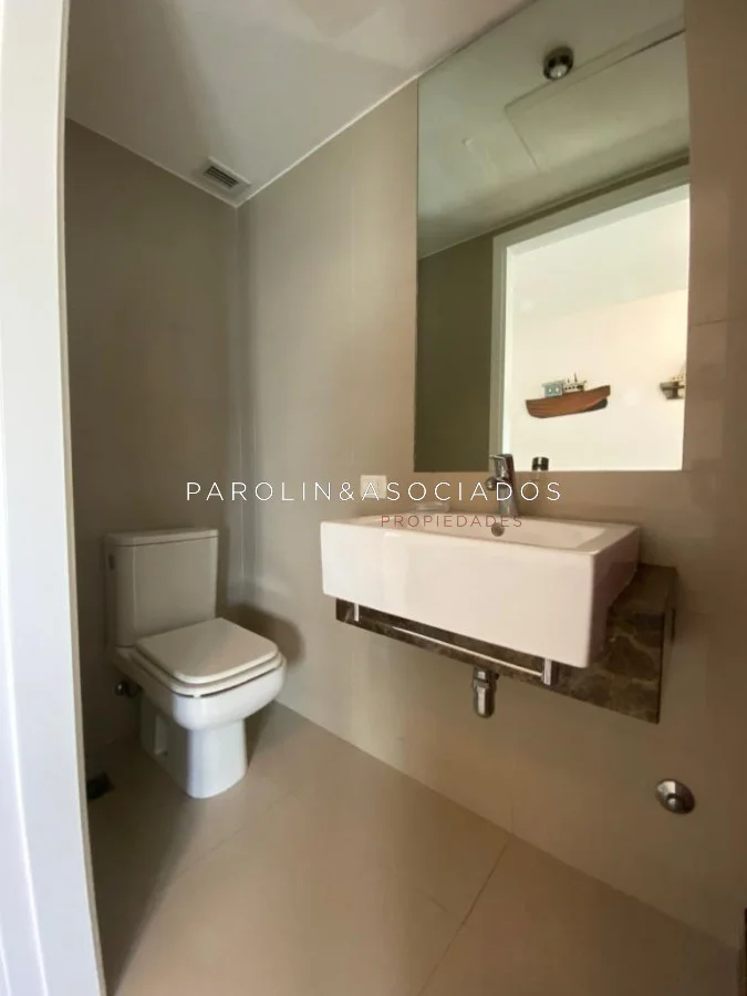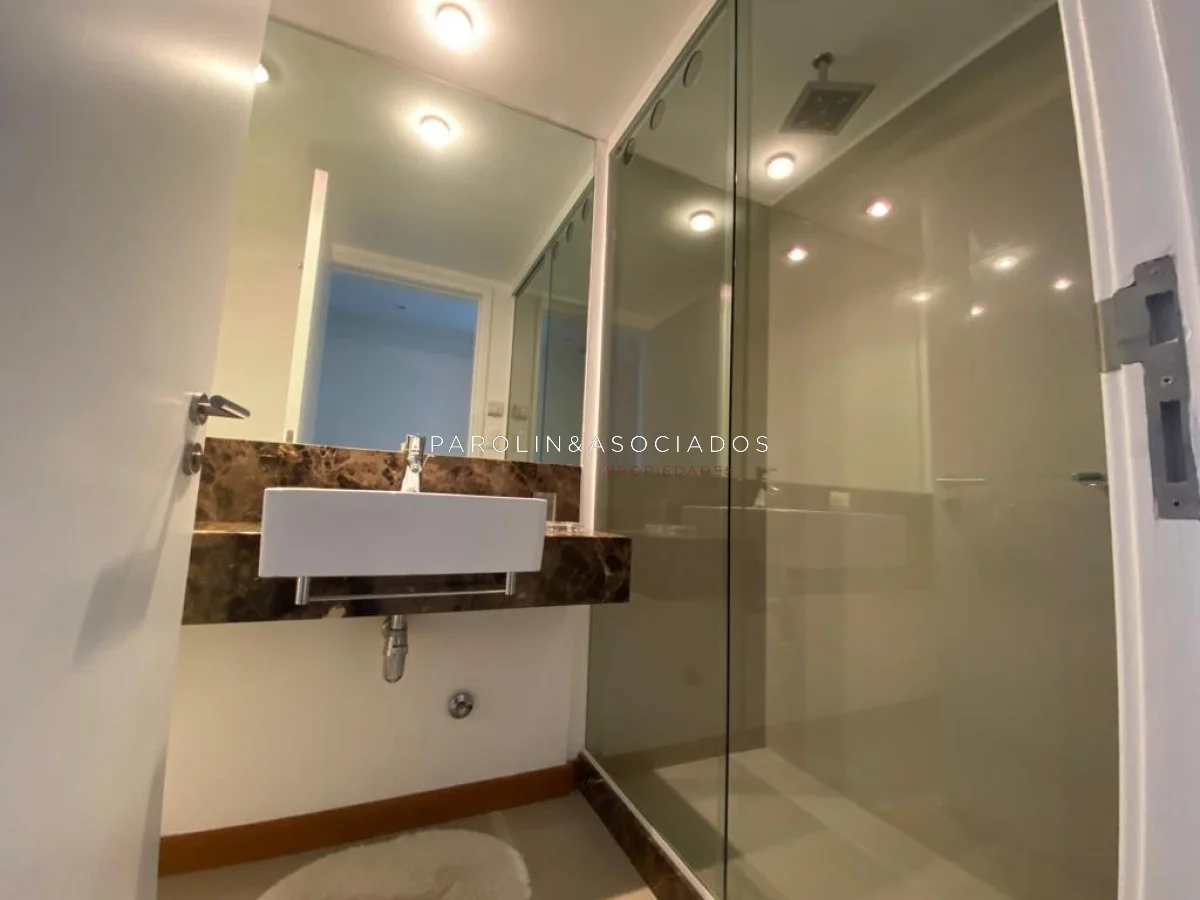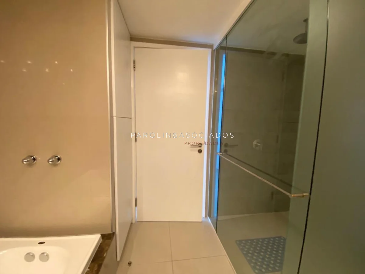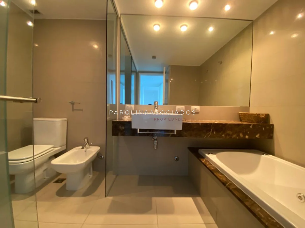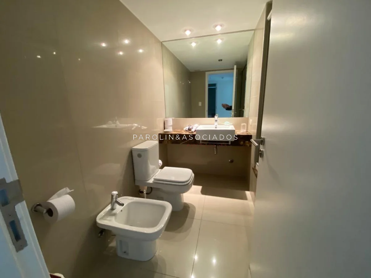 Amplio living comedor con balcón cerrado integrado, baño social con ducha, suite principal a frente con acceso a balcón, dos dormitorios los cuales miran al contra frente con una vista maravillosa al bosque y parte de playa mansa las cuales comparten un baño completo, amplia cocina comedor con terraza lavadero, dependencia de servicio con baño en suite integrada al apto con doble circulación lo que permite integrarla como un dormitorio mas y pasar a tener una planta de cuatros dormitorios, garaje y un completo equipamiento.